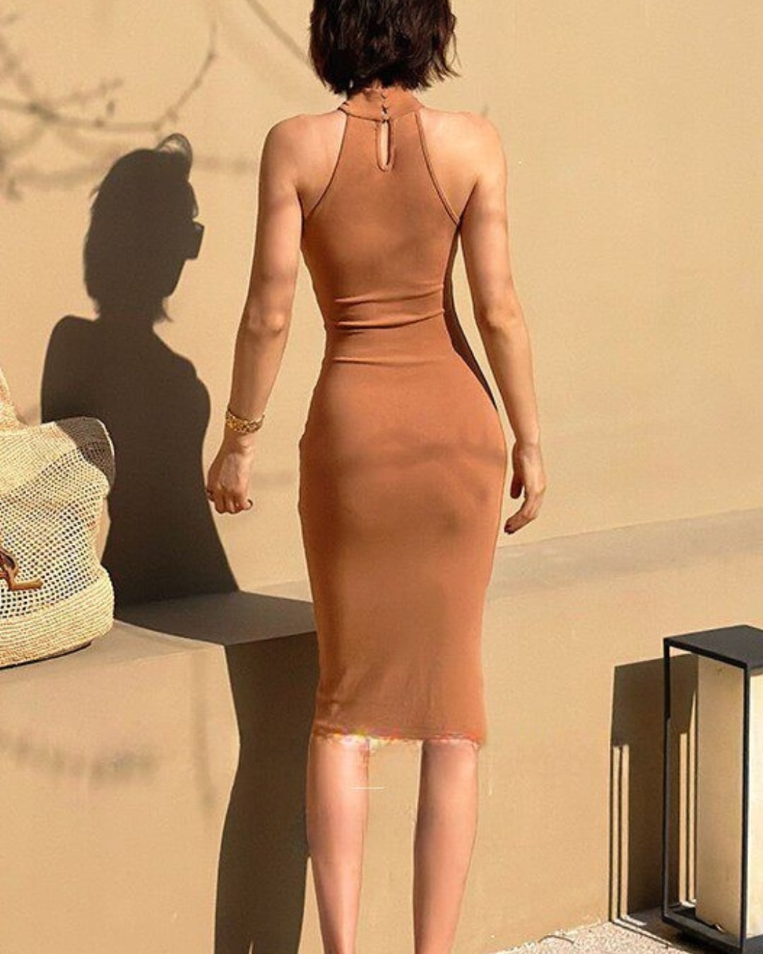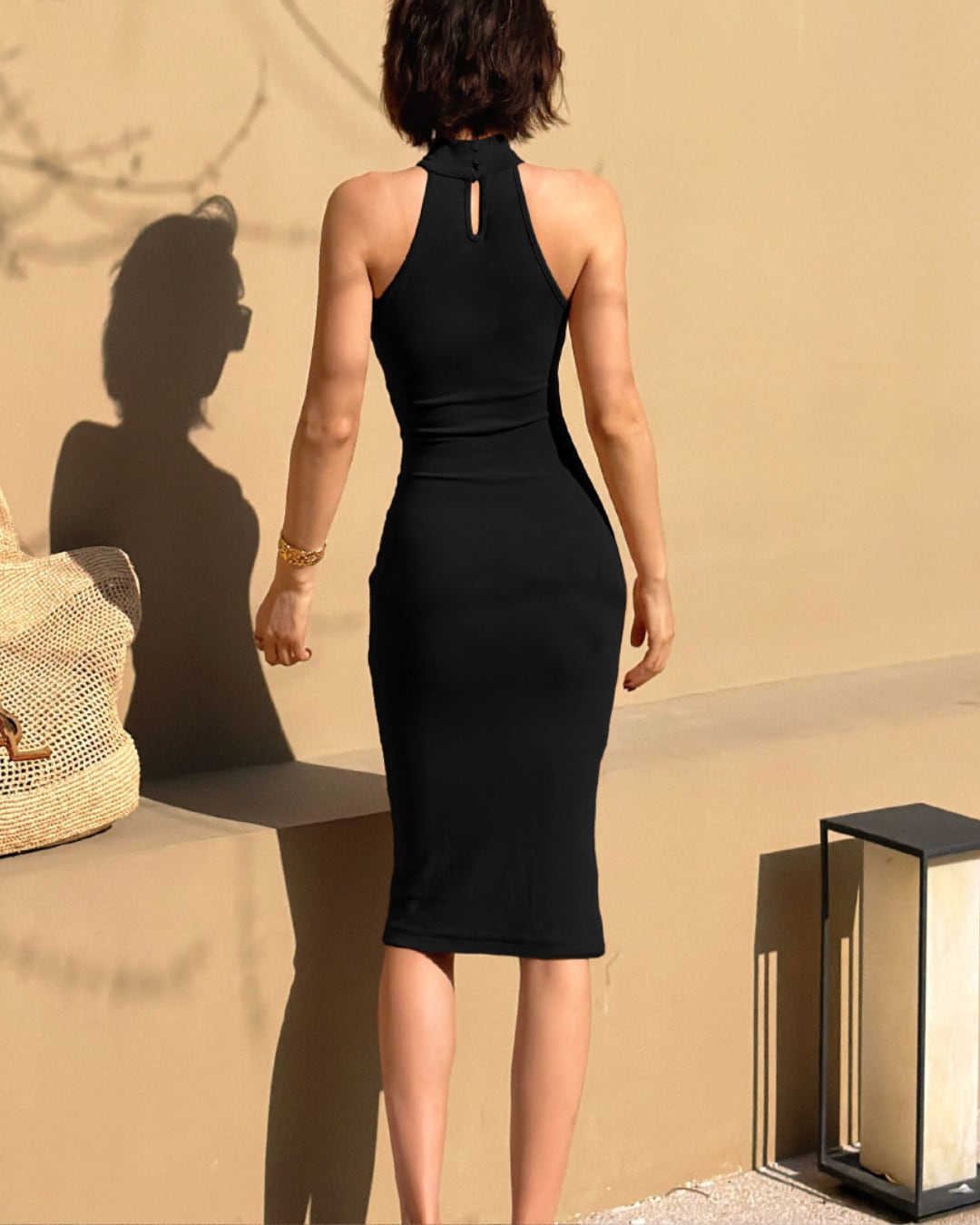 シンプルながらも美しいシルエットが際立つホルターネックワンピース。ボディラインに沿うタイトなシルエットで女性らしさを引き立て、ミニマルなデザインが大人っぽく洗練された印象に仕上げます。ストレッチ性のある素材で着心地も良く、デイリーからお出かけまで幅広く活躍する一着です。