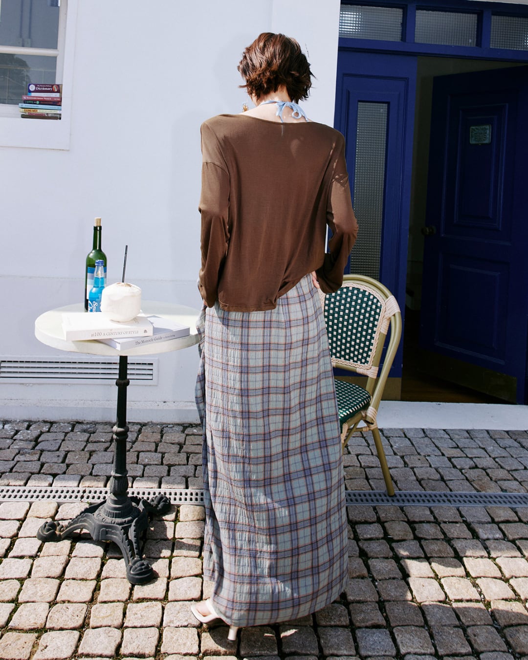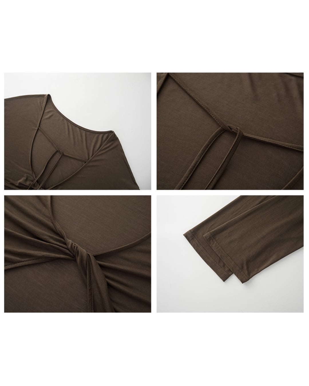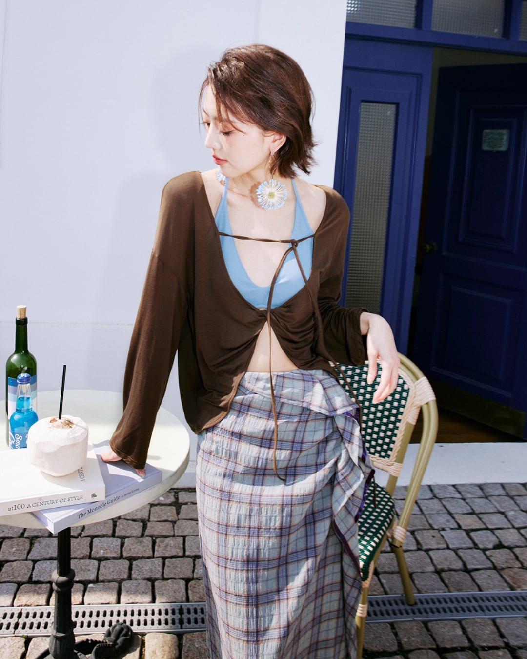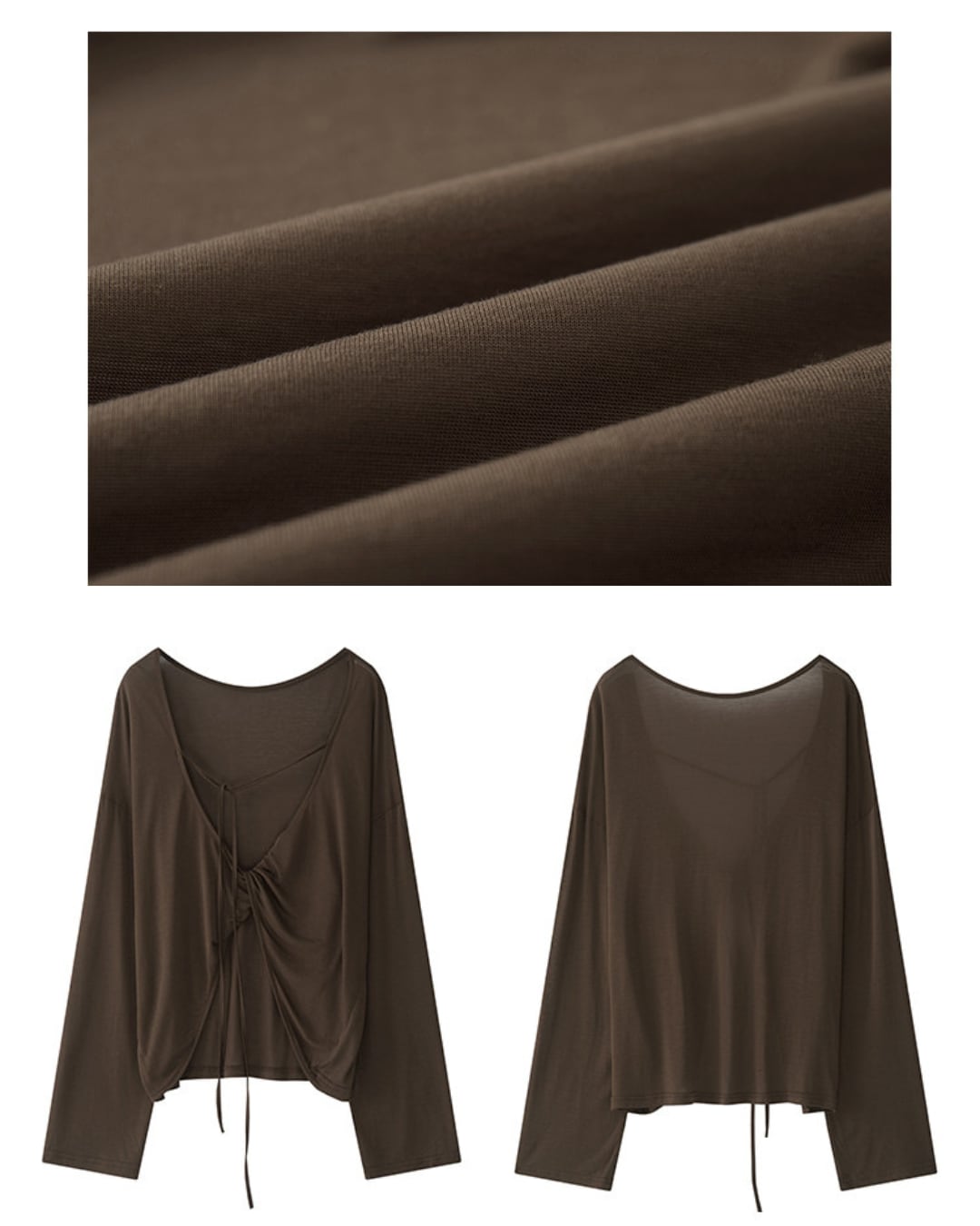 前後どちらでも着用可能な2WAYデザインのシアートップス。フロントはドローストリングデザインで女性らしく、バックは大胆な開きとリボンで抜け感のある印象に。柔らかく軽やかな素材感で、レイヤードスタイルを楽しめる一着です。