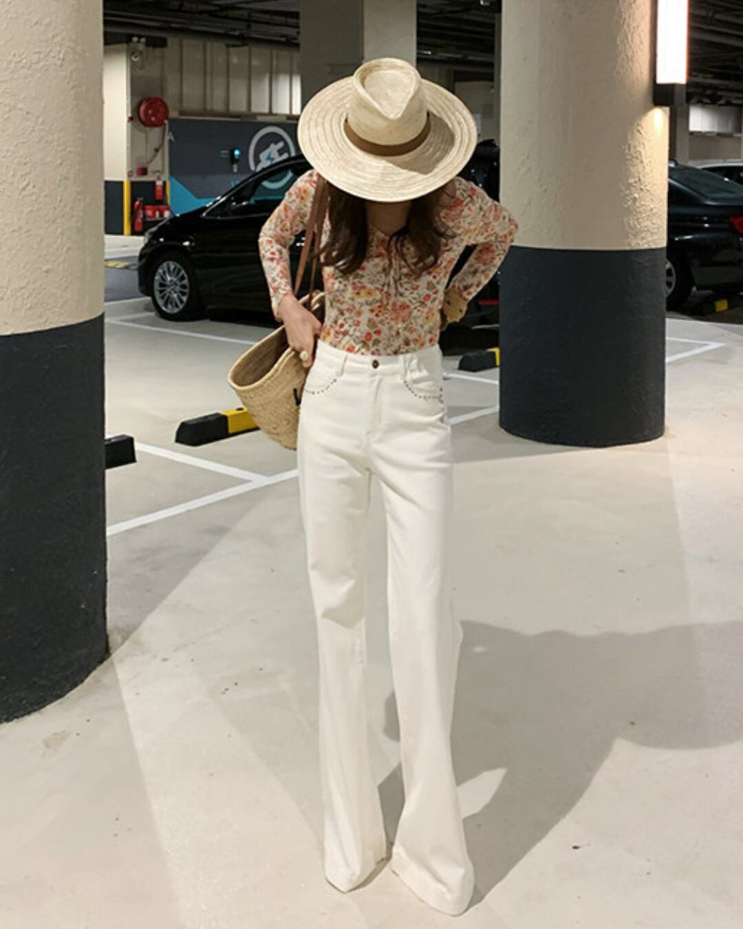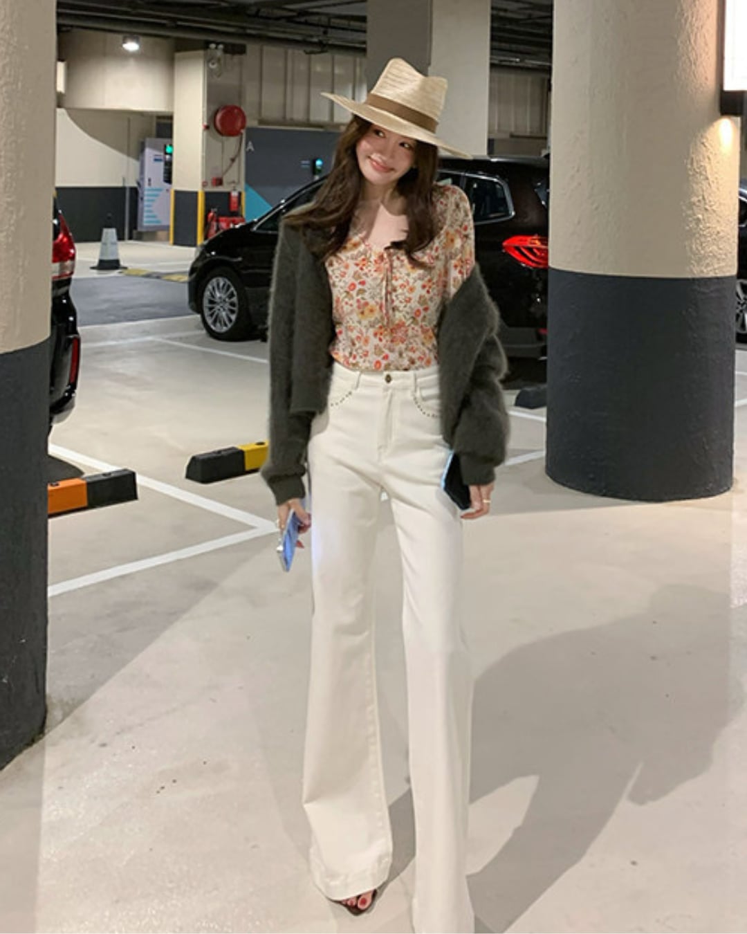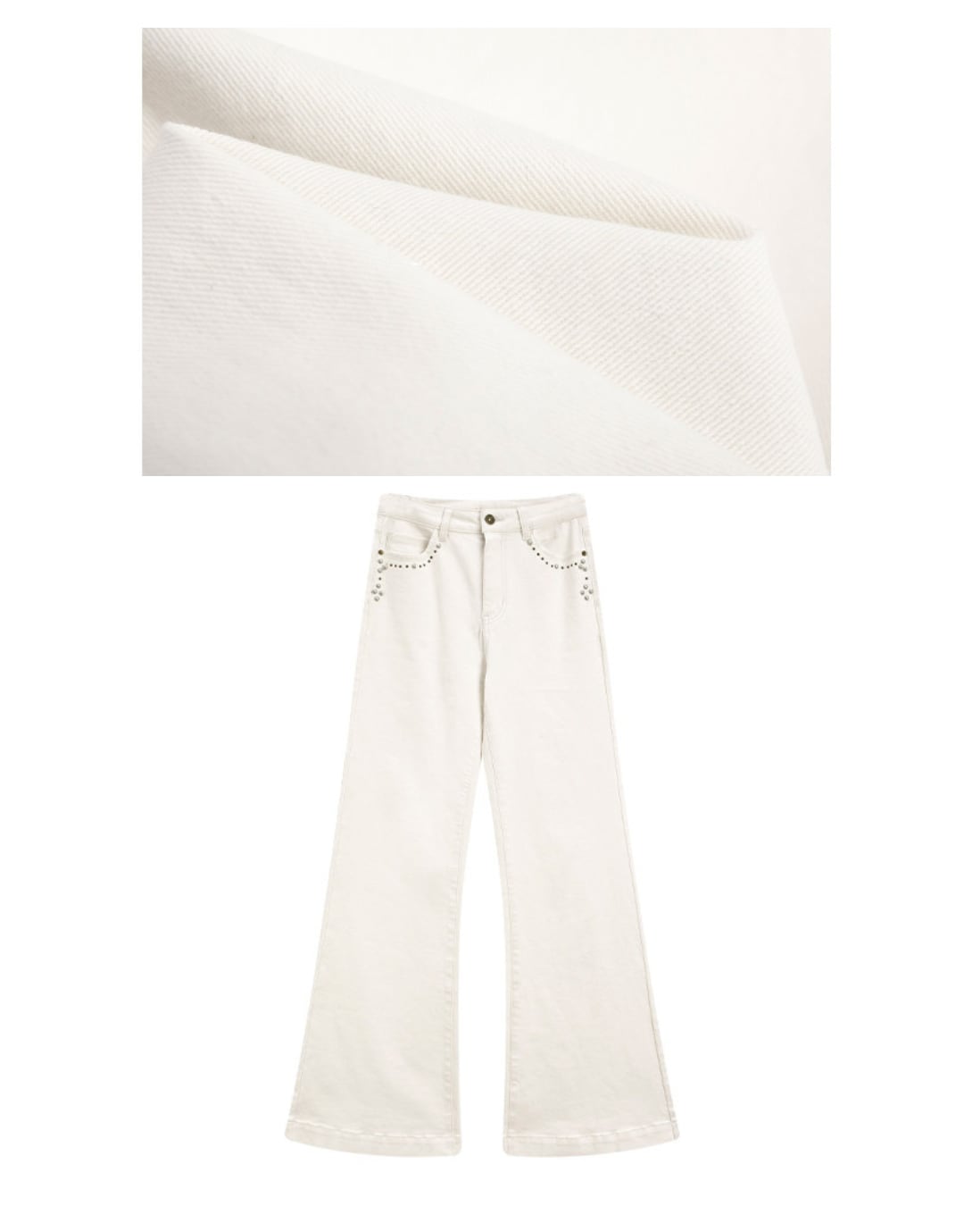 シンプルなホワイトデニムにスタッズディテールを施した、上品さとエッジを兼ね備えたワイドパンツ。 ハイウエスト設計とストレートに広がるシルエットで脚長効果を演出し、スタイルアップを叶えます。 コットンベースにストレッチ性をプラスし、快適な履き心地と動きやすさも魅力。 カジュアルからきれいめまで幅広いコーデに対応する万能アイテムです。