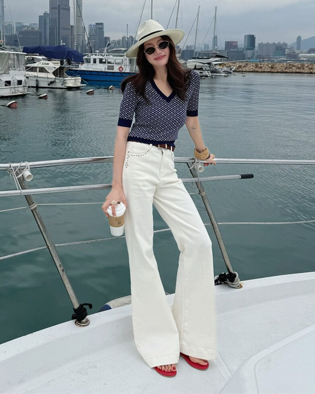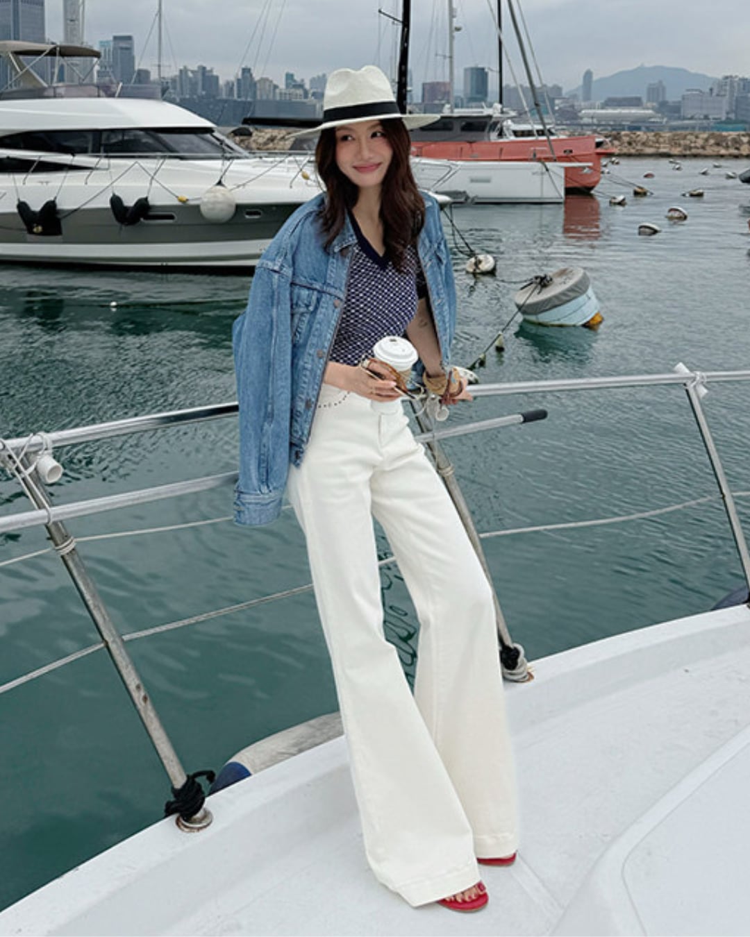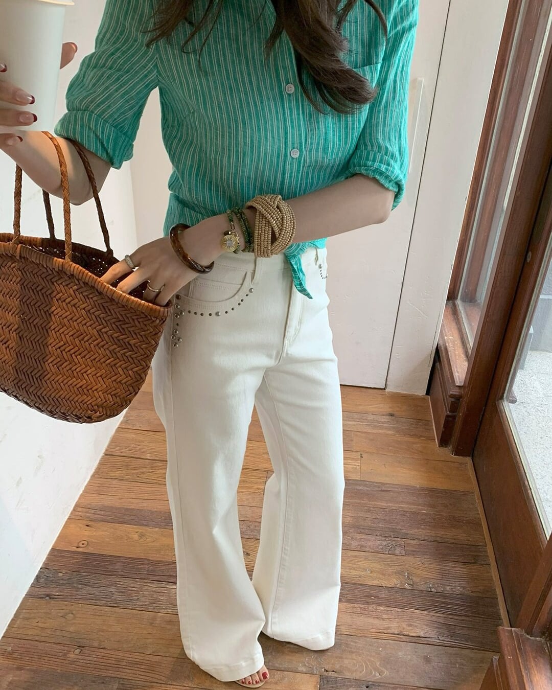 #ホワイトデニム #ワイドパンツ #スタッズ #大人カジュアル #脚長効果 #春夏コーデ