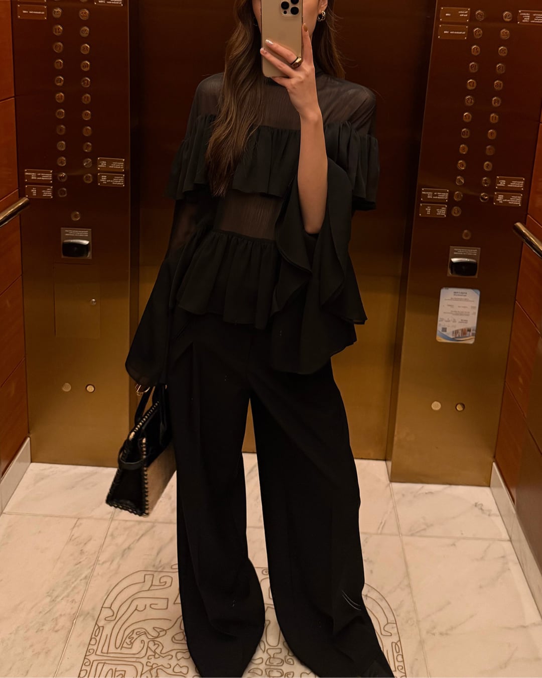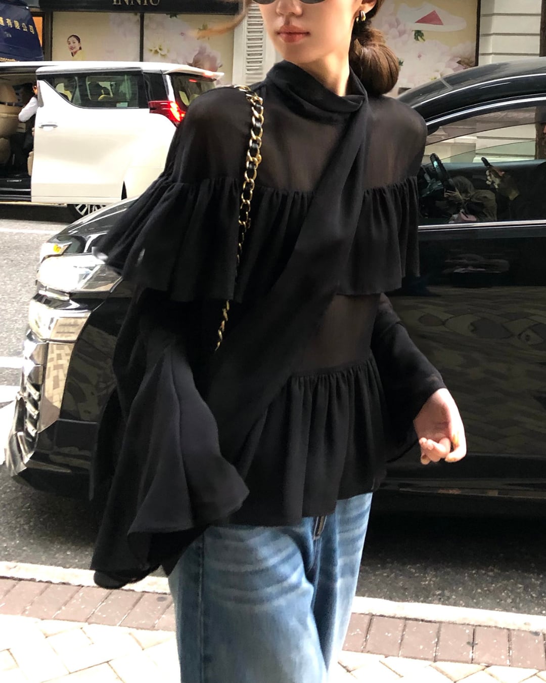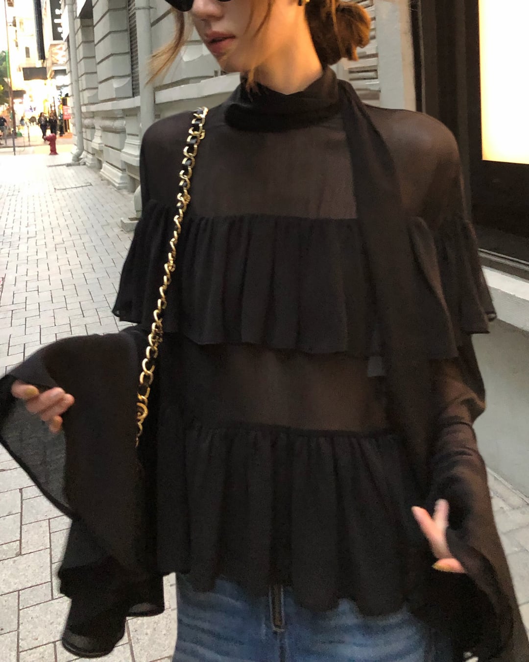 #シアーブラウス #フリルブラウス #ハイネックブラウス #ブラックコーデ #大人フェミニン #モードコーデ