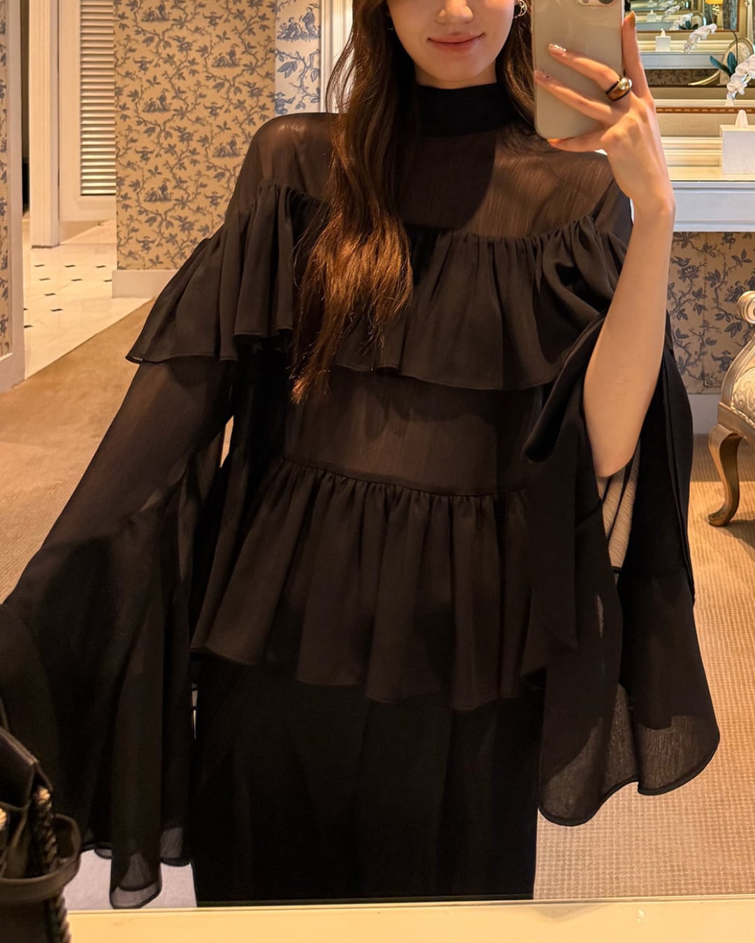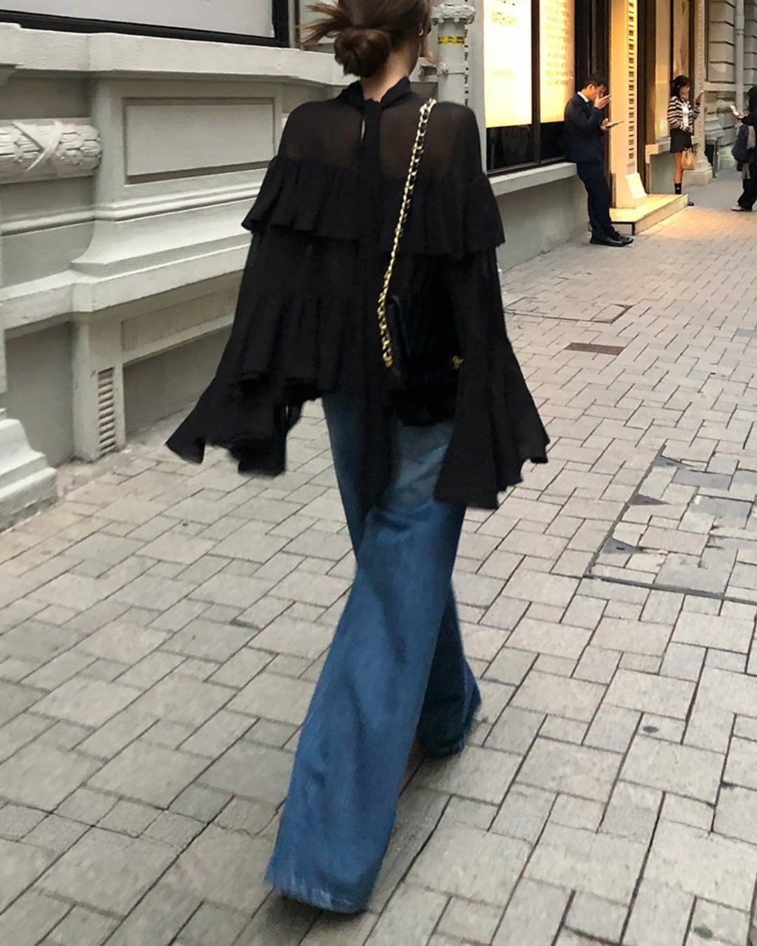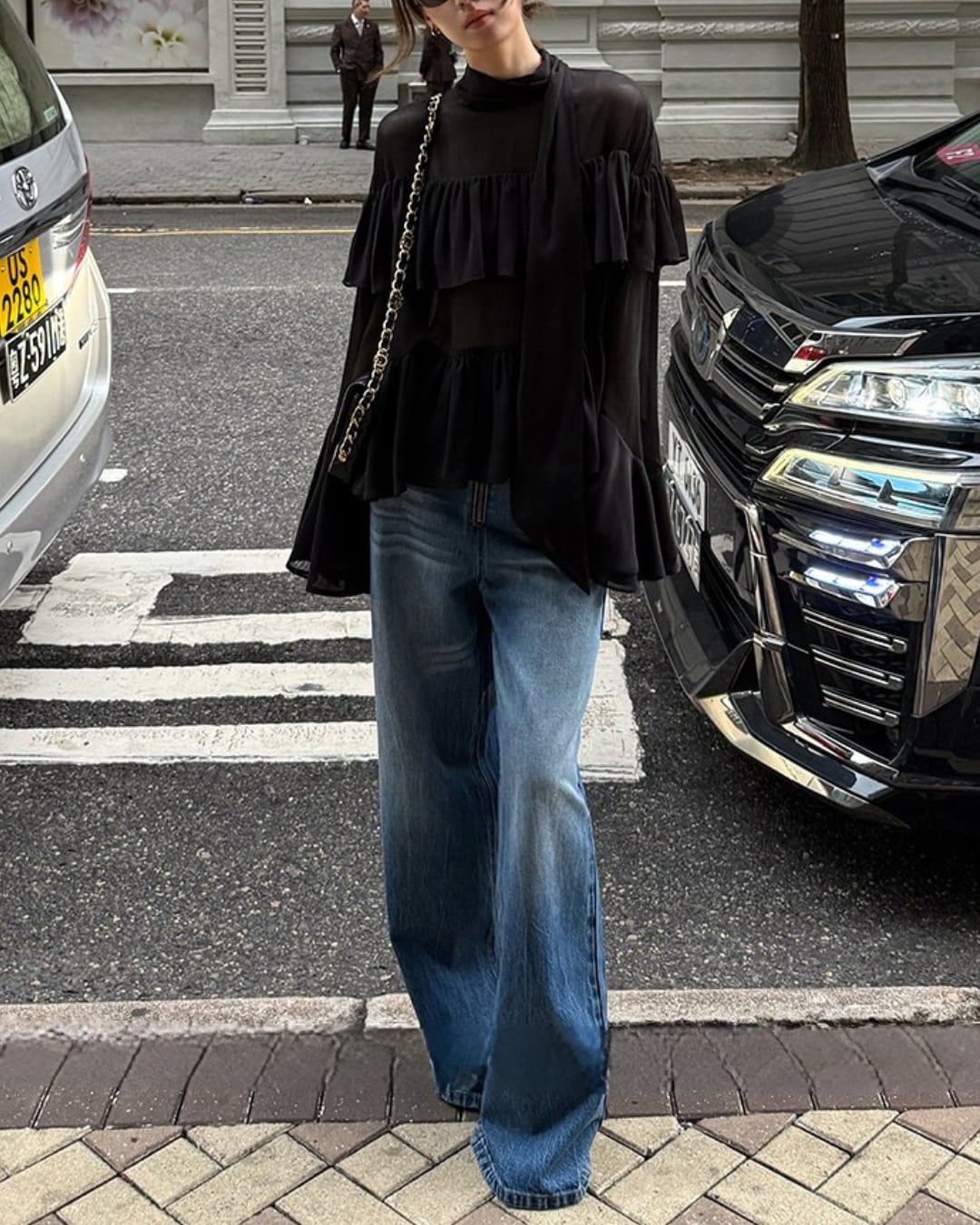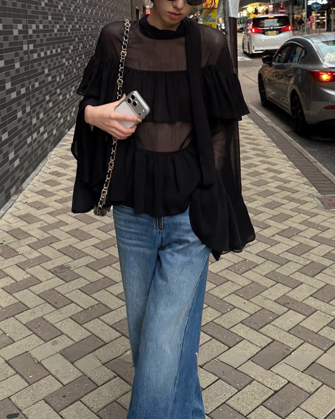 #シアーブラウス #フリルブラウス #ハイネックブラウス #ブラックコーデ #大人フェミニン #モードコーデ