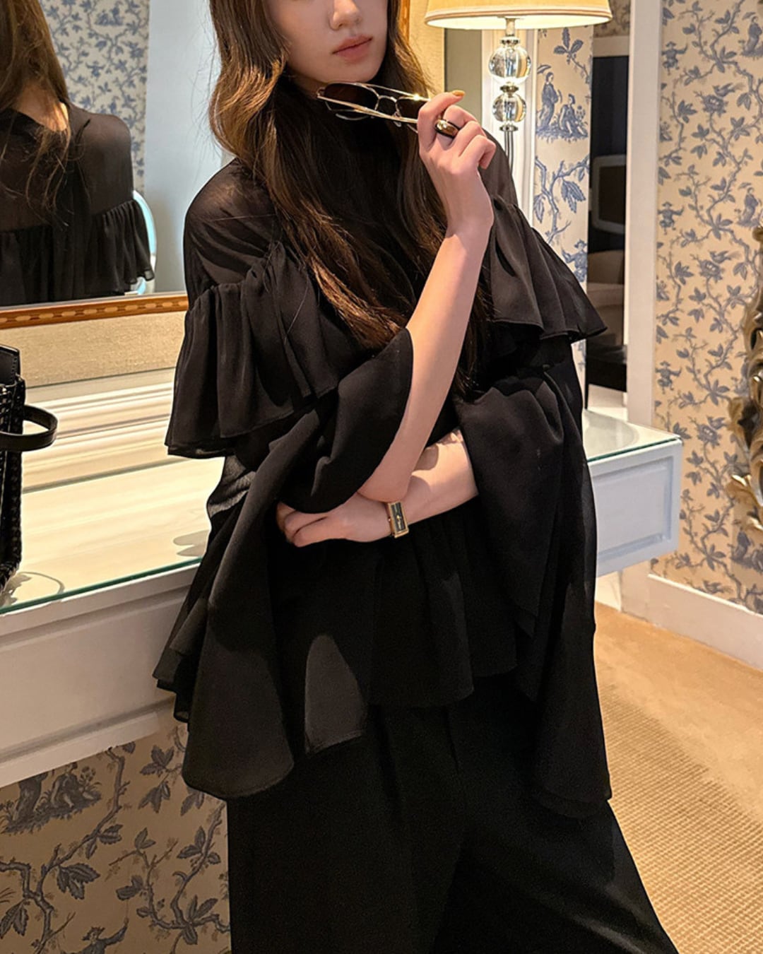 透け感のある軽やかなシアー素材が女性らしさを引き立てるブラウス。 胸元と裾にあしらわれたフリルデザインが華やかな印象を演出し、動きのあるフレアスリーブでこなれ感のある一着です。 デニム合わせでカジュアルに、スラックスやスカート合わせできれいめにも着回せます。
