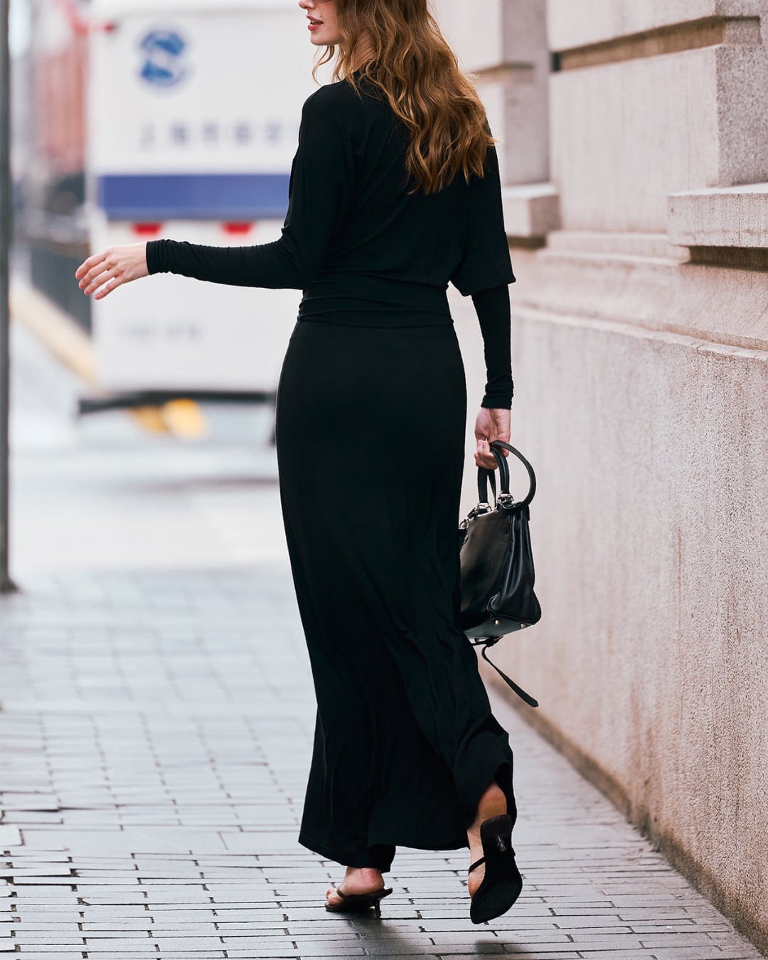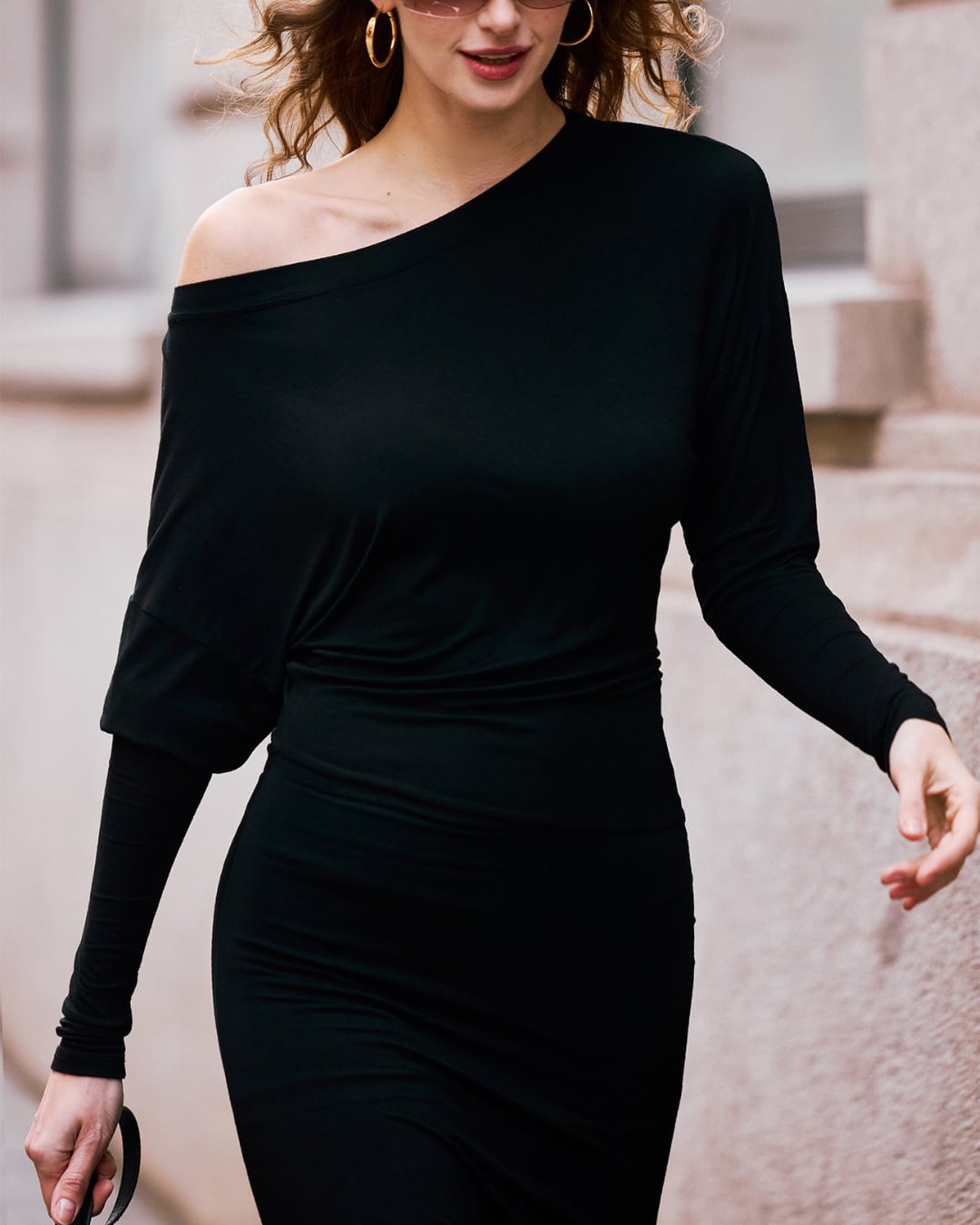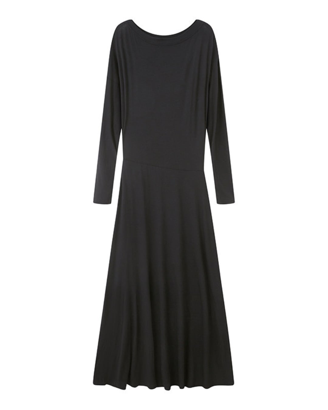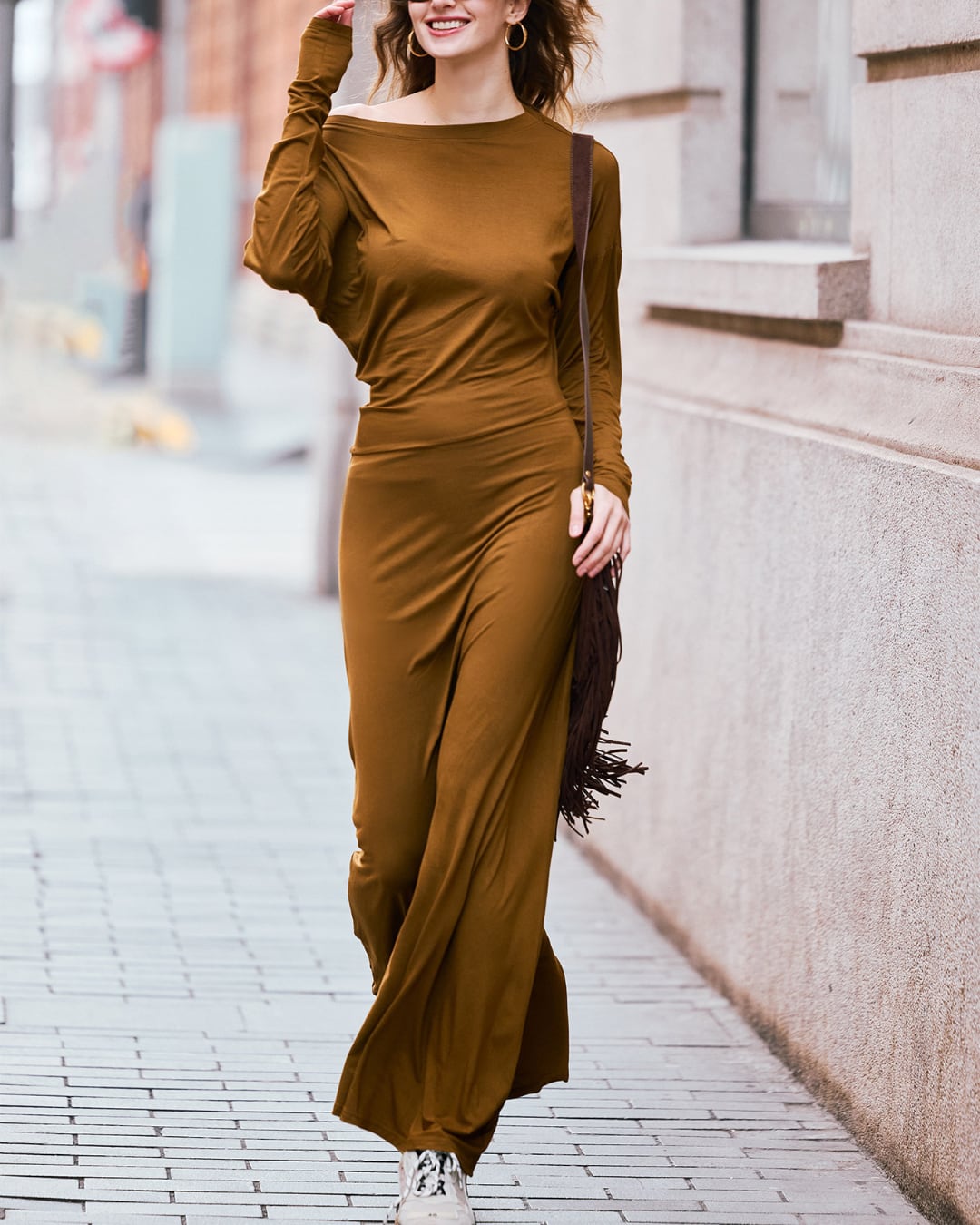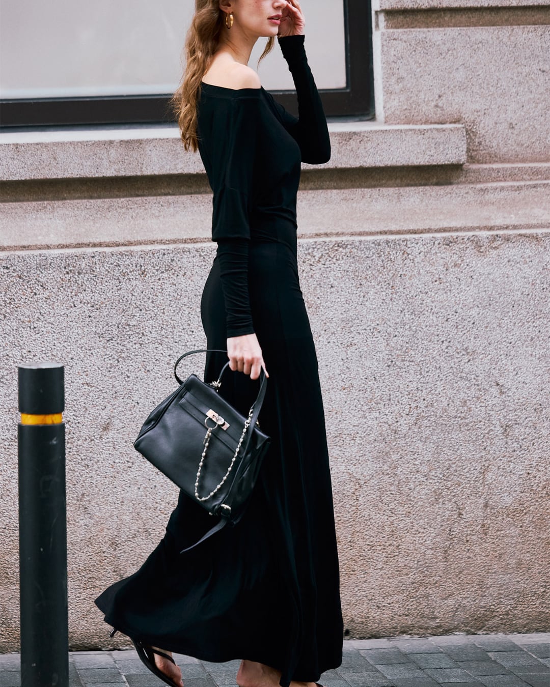 女性らしい抜け感を演出するアシンメトリーネックデザインのロングワンピース。ゆったりとしたトップシルエットと、裾に向かって美しく広がるラインが上品な印象を与えます。程よく身体に沿う落ち感のある素材で、スタイルアップ効果も◎一枚で洗練された大人のモードスタイルが完成する主役級アイテムです。