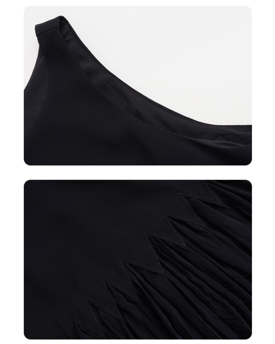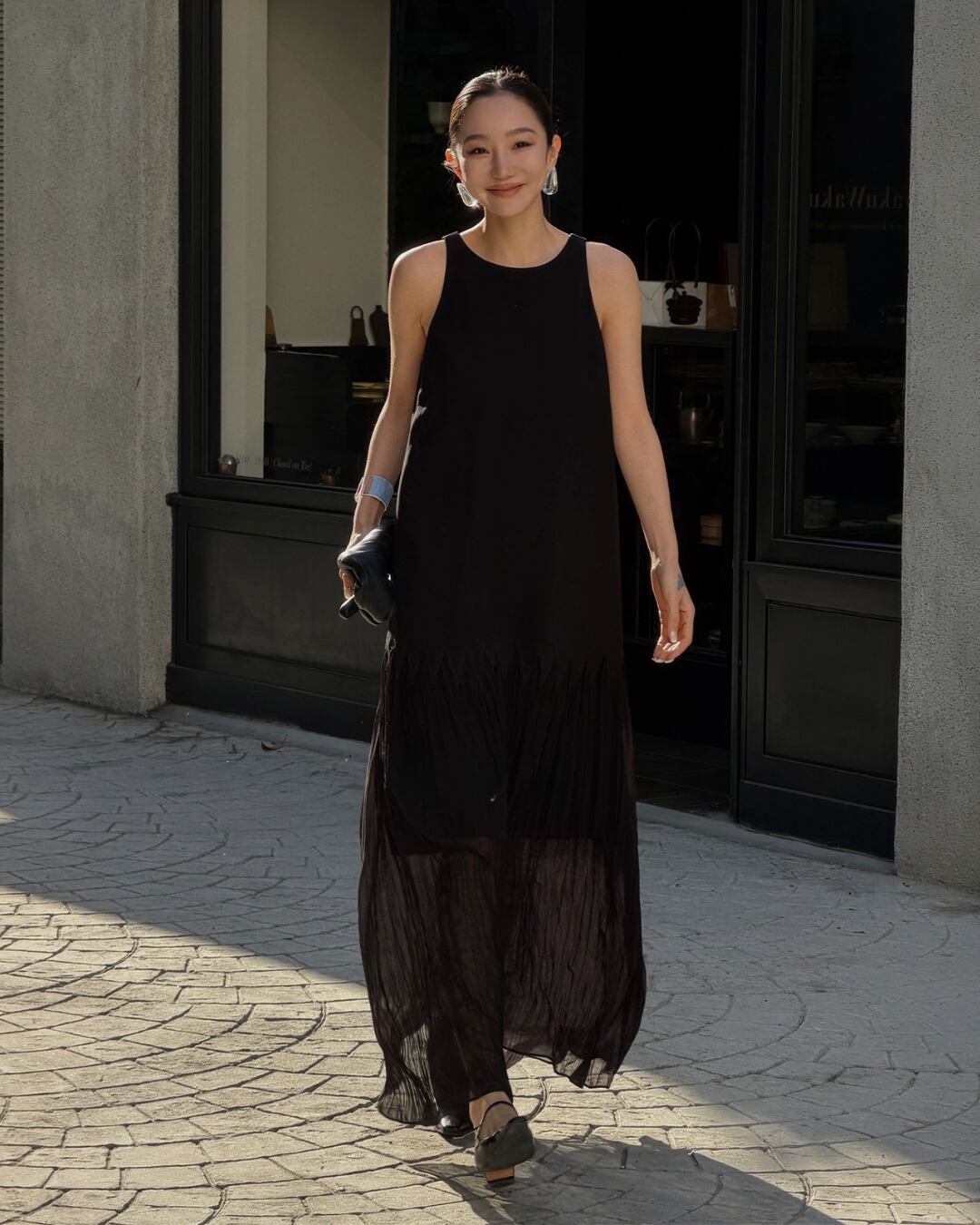 軽やかに揺れるシアープリーツが印象的なノースリーブロングワンピース。すっきりとしたIラインシルエットに、裾へ向かって広がる透け感のあるプリーツデザインが上品な抜け感を演出します。1枚で洗練された大人スタイルが完成する、モード感漂う主役ワンピースです。