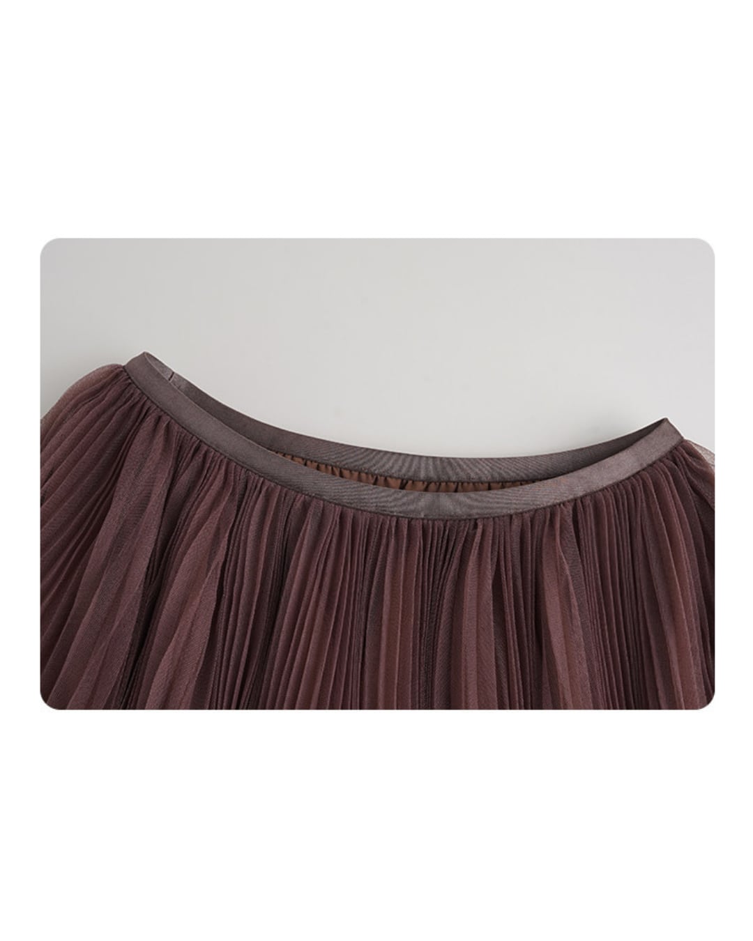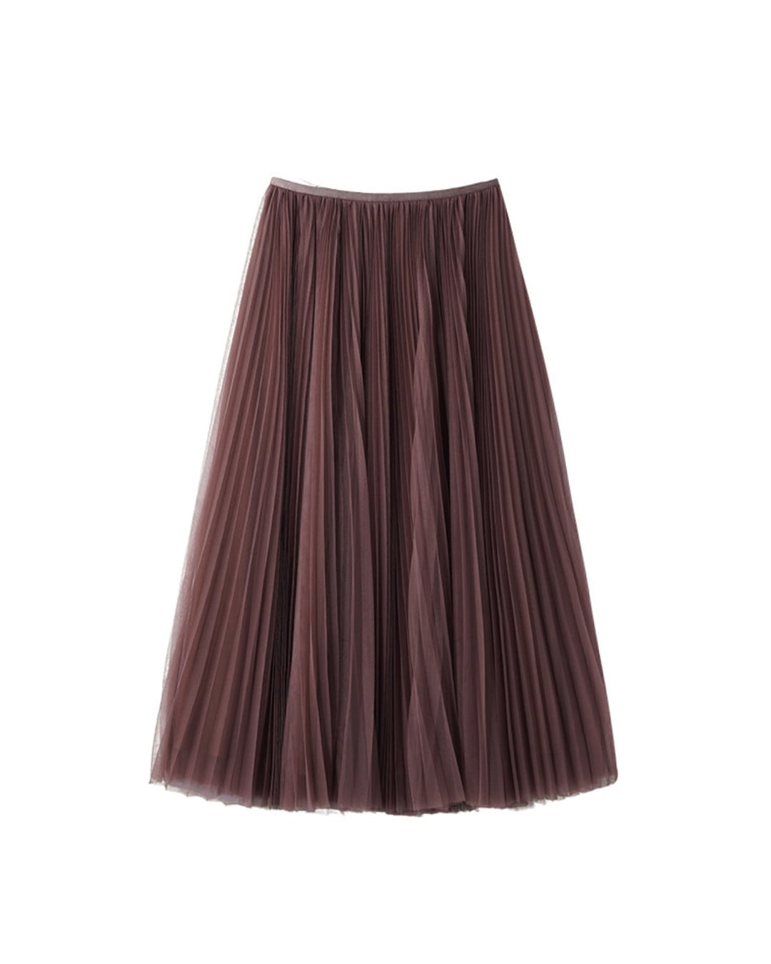 繊細なチュール素材を贅沢に使用した、女性らしさ引き立つロングスカート。細やかなプリーツが動くたびにふんわり揺れ、軽やかで華やかな印象を演出します。落ち着いたブラウンカラーで甘くなりすぎず、大人っぽく上品に着こなせる一枚。Tシャツやニット合わせはもちろん、きれいめトップスとのスタイリングにもおすすめです。