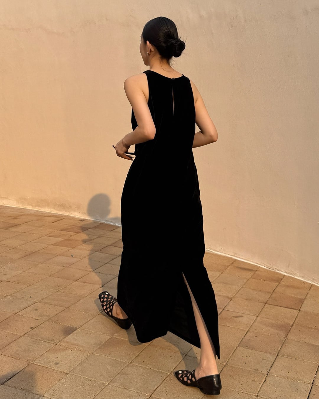 洗練されたミニマルデザインが魅力のロングワンピース。すっきりとしたIラインシルエットが縦のラインを強調し、スタイルアップ効果も叶えます。程よく開いたアームラインとバックデザインが抜け感を演出し、シンプルながら印象的な一枚に。一枚でさらりと着るだけで大人のモードスタイルが完成する、上品なブラックワンピースです。
