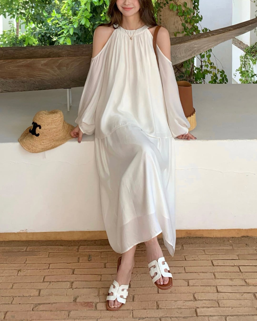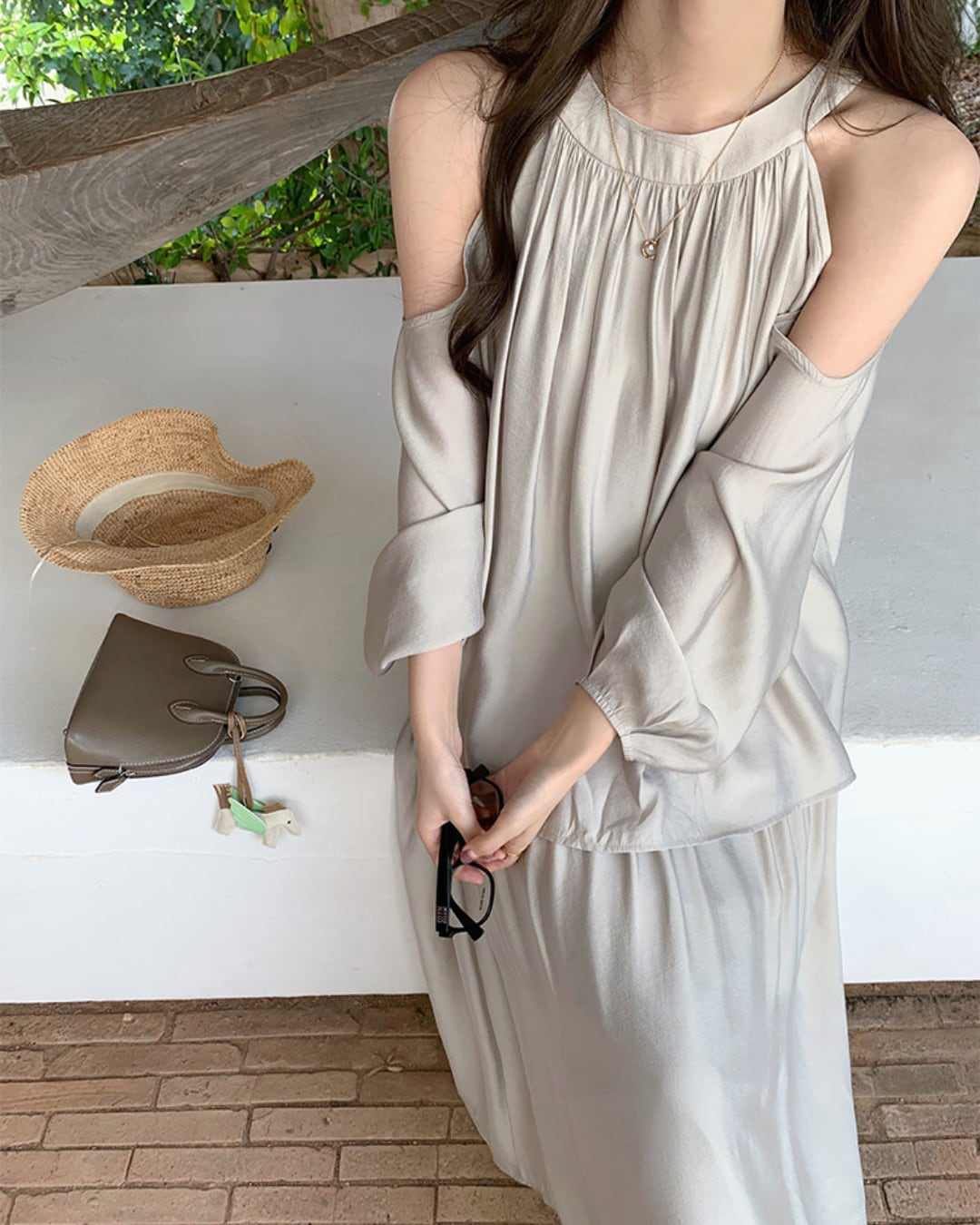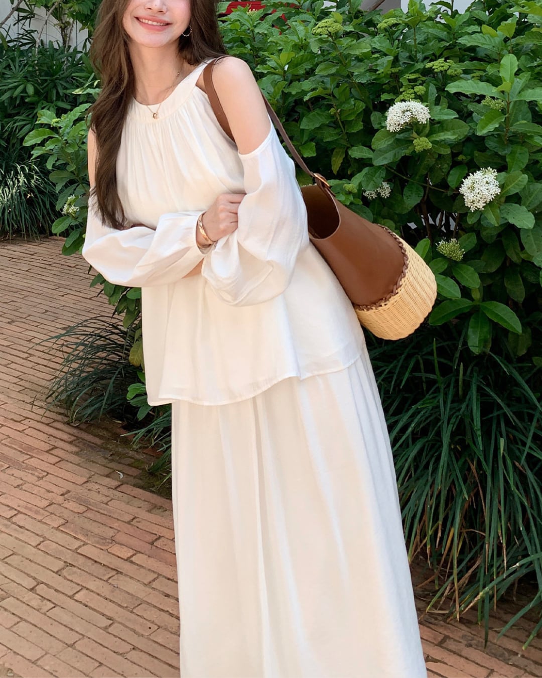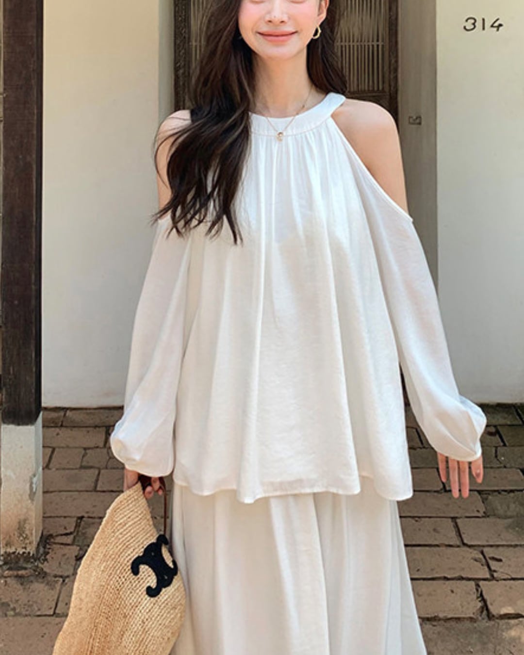 柔らかなドレープ感が魅力のトップスとロングスカートのセットアップ。肩見せデザインが女性らしい抜け感を演出し、ふんわり広がるシルエットで上品な印象に仕上げました。セットではもちろん、単品使いでも着回ししやすく、リゾートやお出かけコーデにもおすすめの一着です。