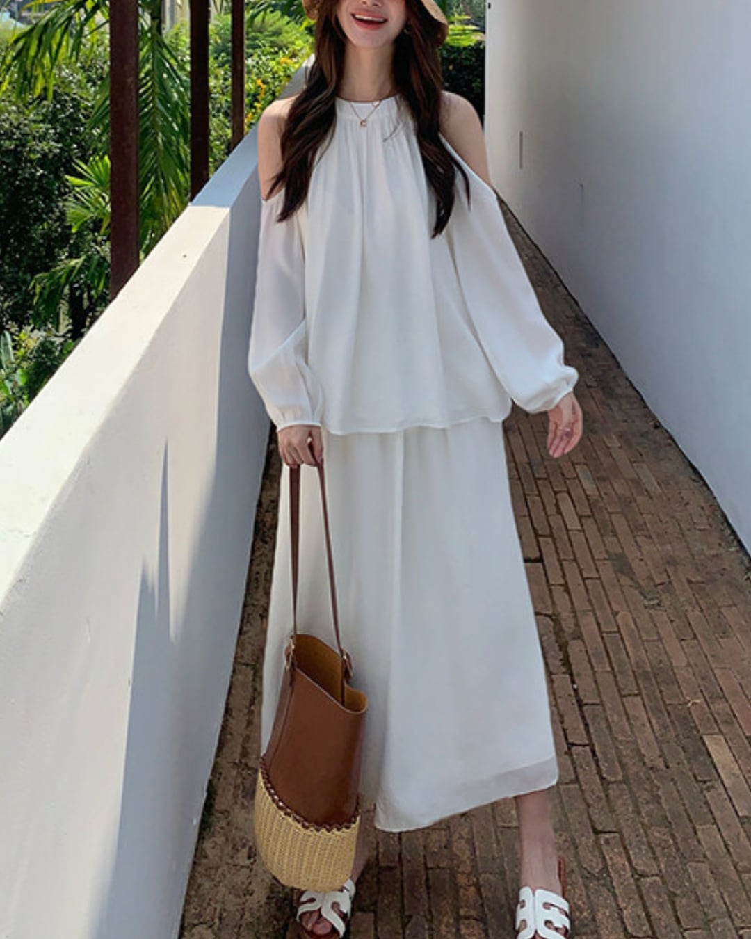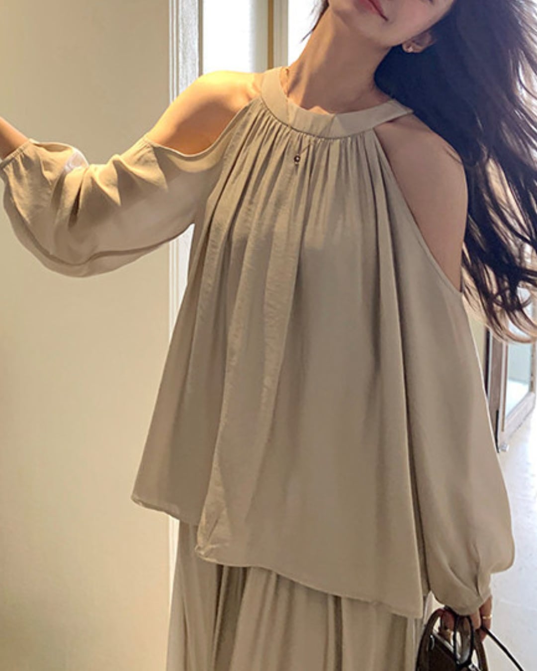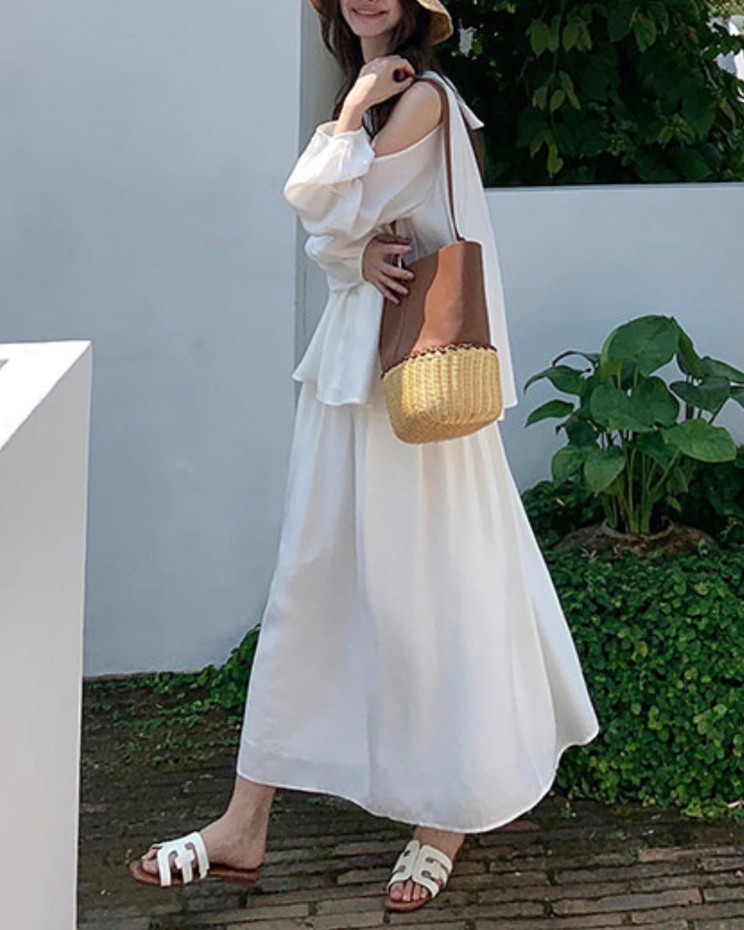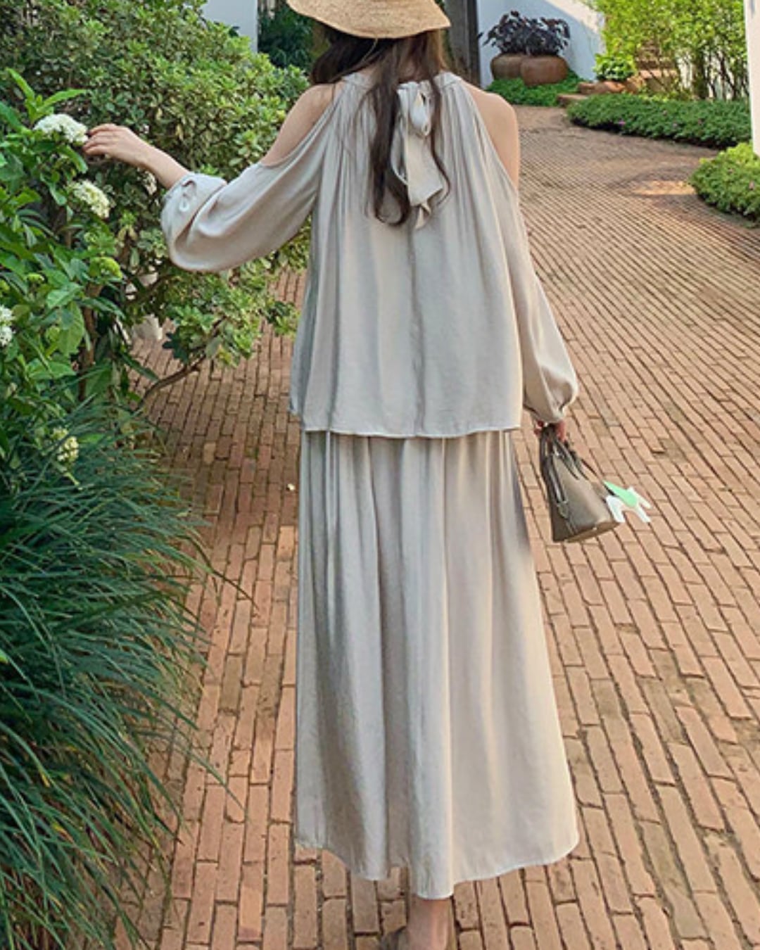 柔らかなドレープ感が魅力のトップスとロングスカートのセットアップ。肩見せデザインが女性らしい抜け感を演出し、ふんわり広がるシルエットで上品な印象に仕上げました。セットではもちろん、単品使いでも着回ししやすく、リゾートやお出かけコーデにもおすすめの一着です。