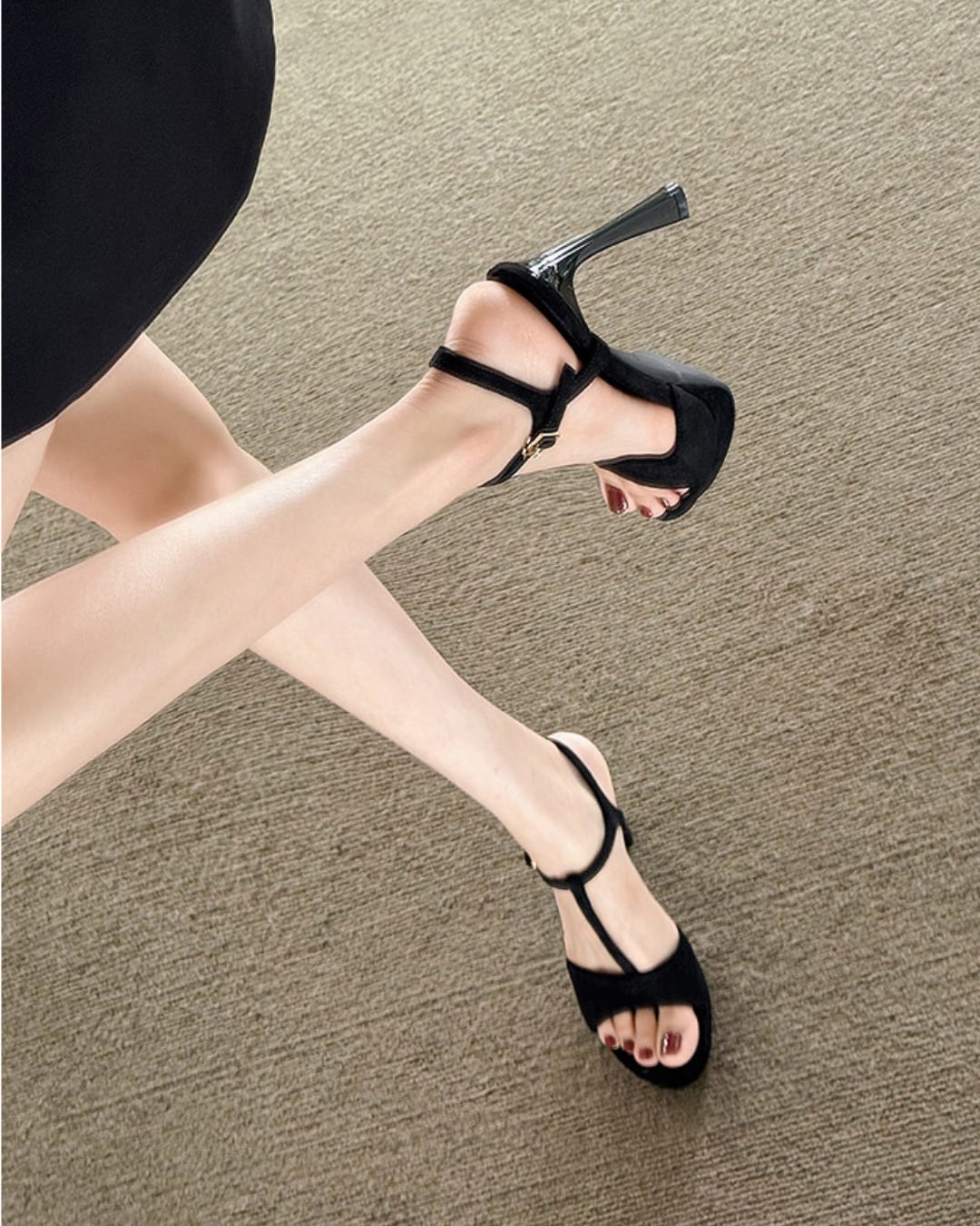 美しいTストラップラインが足元をすっきり魅せる、洗練されたヒールサンダル。程よい厚みのプラットフォームデザインで安定感があり、11cmヒールでも歩きやすい一足です。女性らしいシルエットと存在感を兼ね備え、パーティーからデイリーまで幅広く活躍します。