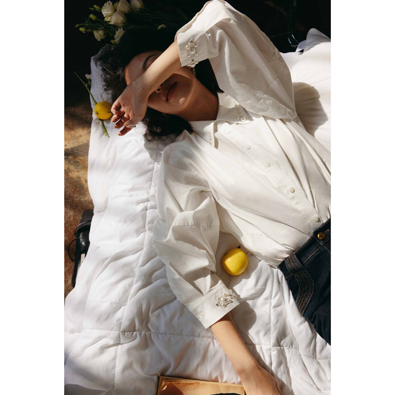 エレガントなデザインが魅力のビジューデザインシャツ。華やかなビジューが、さりげないアクセントになり、上品でオシャレな着こなしを演出します。品のあるシャツは、オフィスやパーティなど様々なシーンで活躍します。