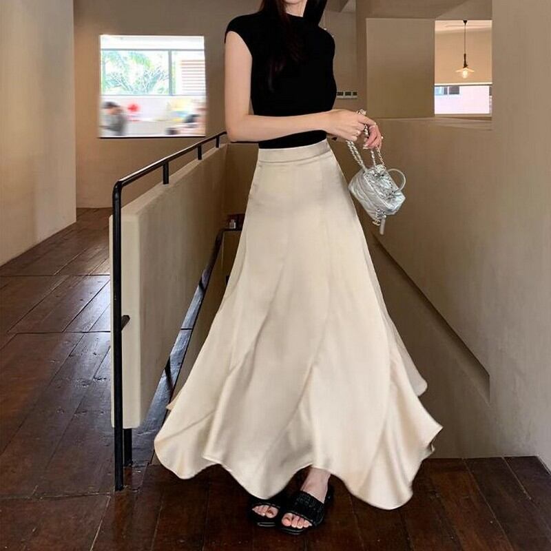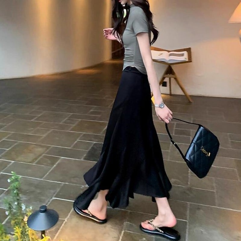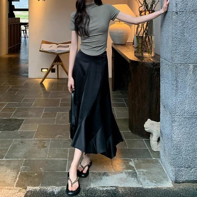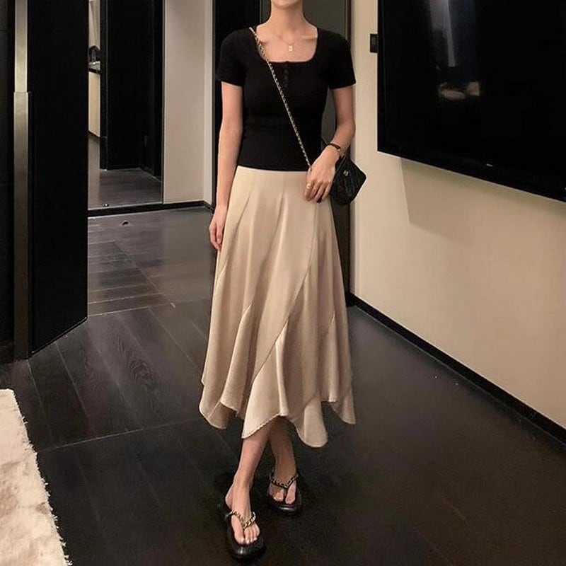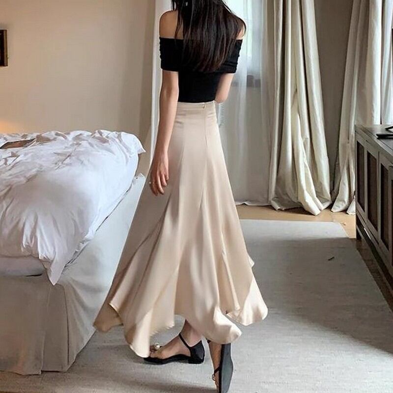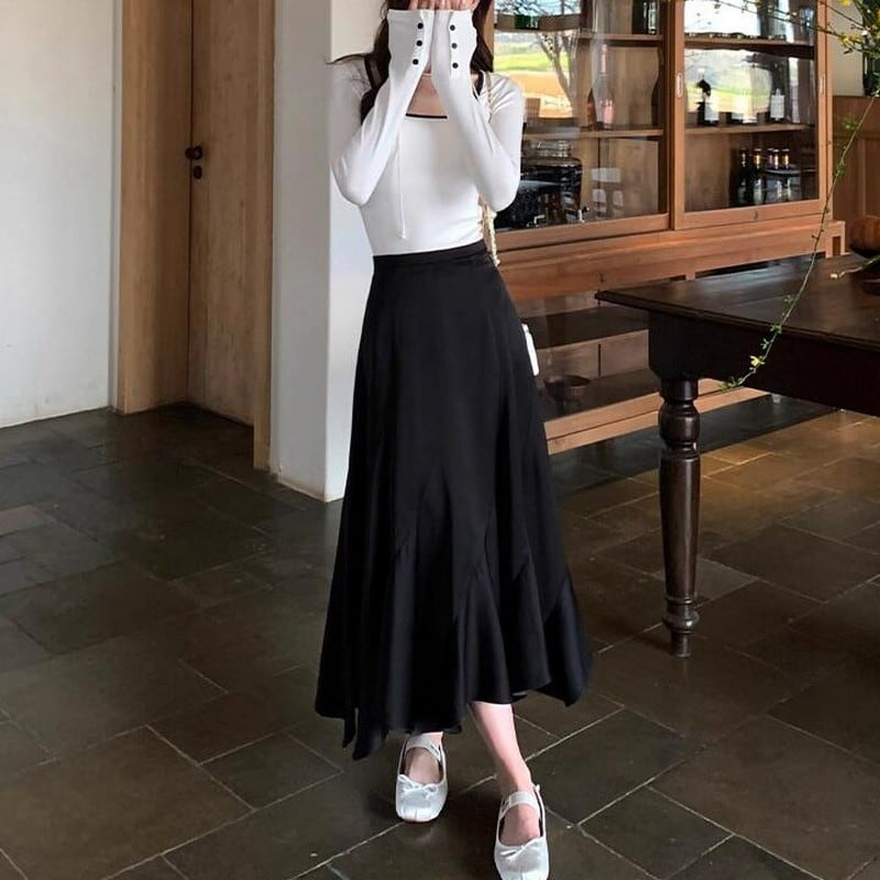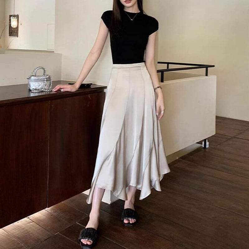 エレガントなスタイルを演出するイレギュラーロングスカート。アシンメトリーなデザインと長めの丈が、シンプルなトップスとの相性を抜群。ふんわりと広がるシルエットは、女性らしさを引き立てながら、動きのある印象を与えます。柔らかな素材感と程よい光沢も魅力のひとつで、上品さとカジュアル感を兼ね備えたデイリーアイテムです。