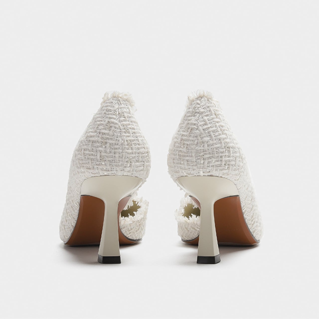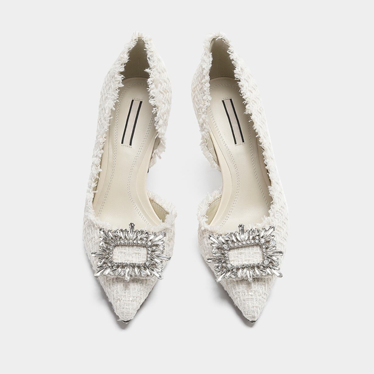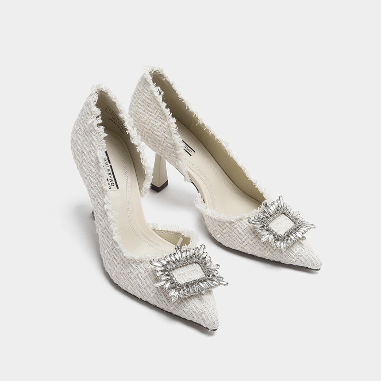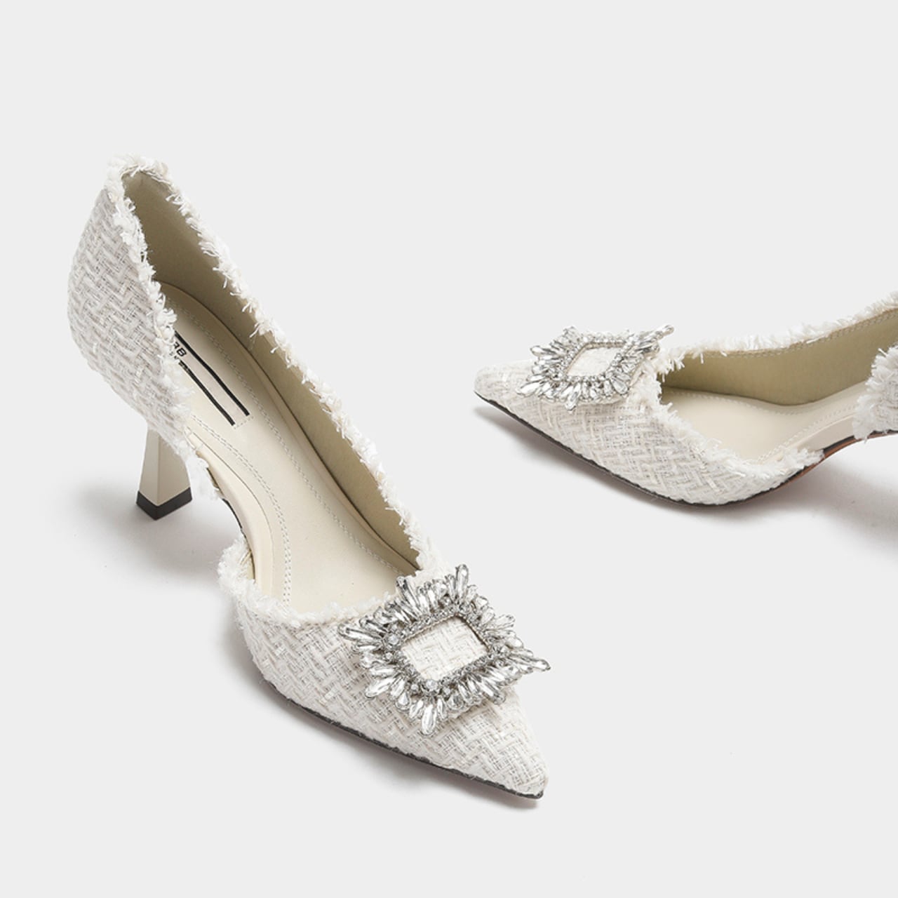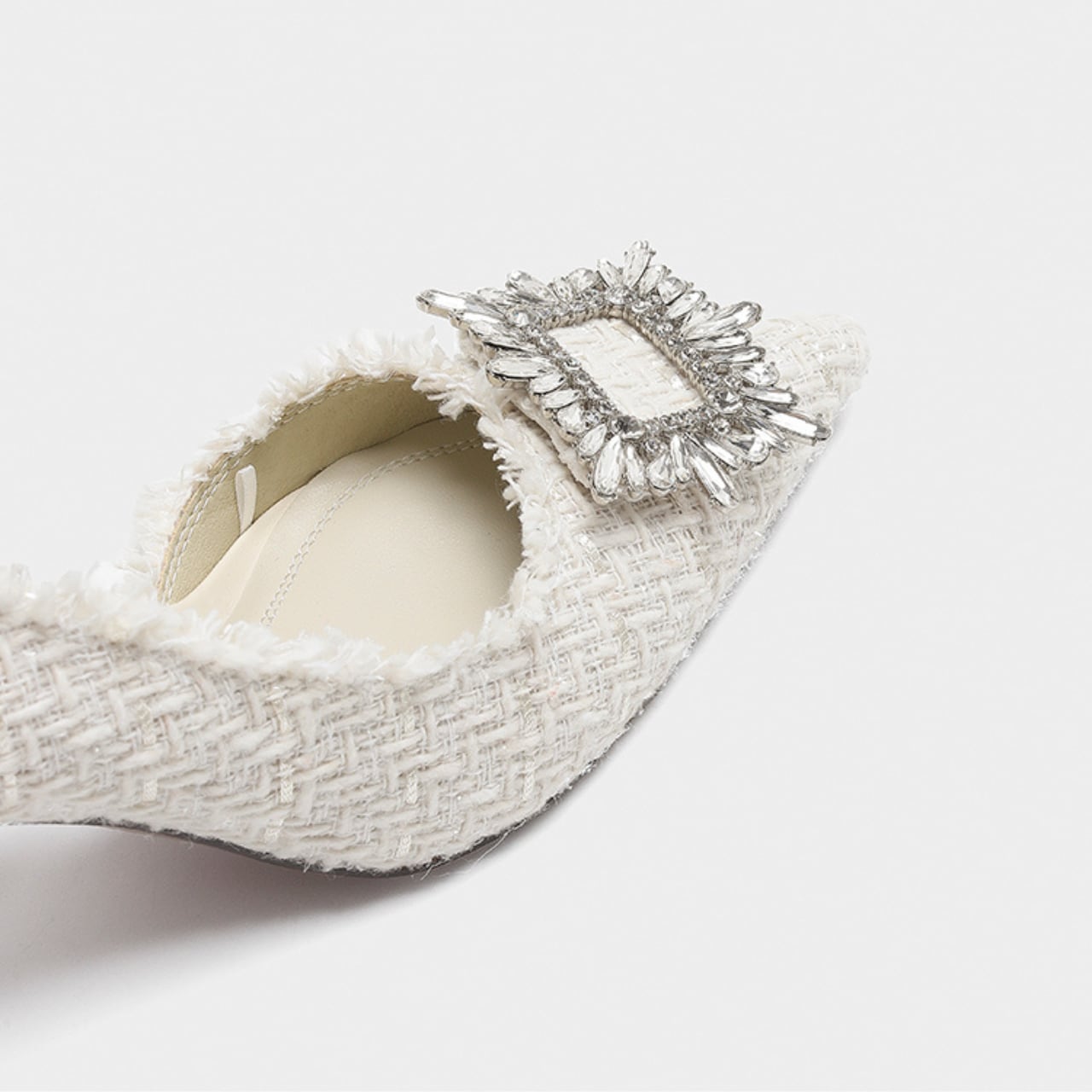 大人女性にぴったりな一足。上品なツイード素材とキラキラ輝くビジューが絶妙にマッチして、足元を華やかに演出します。シンプルなデザインなので、どんなコーディネートにも合わせやすく、カジュアルなスタイルやオフィス、パーティーなど様々なシーンでも活躍してくれるアイテムです。