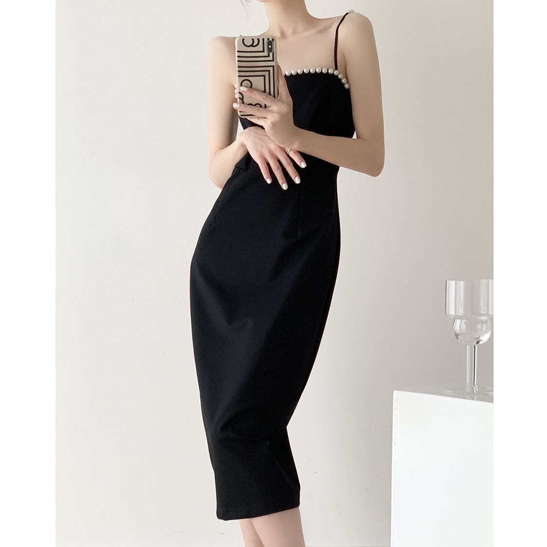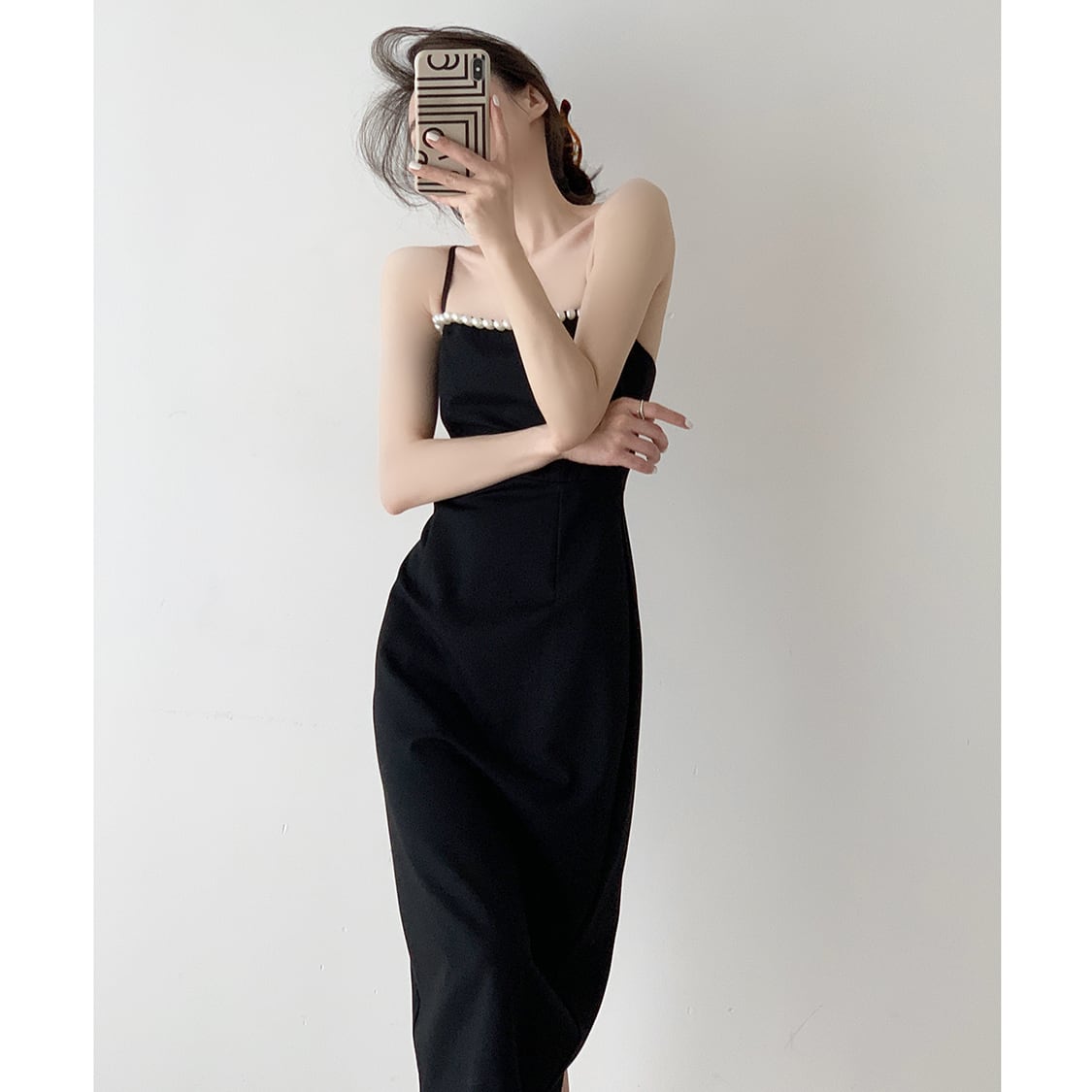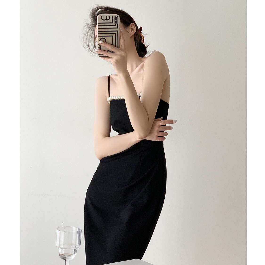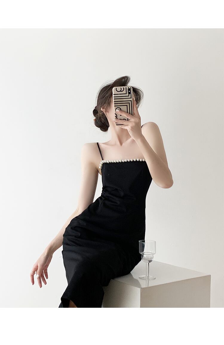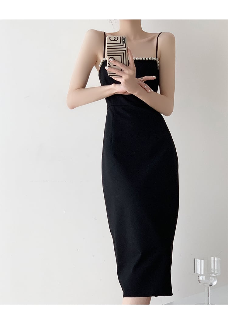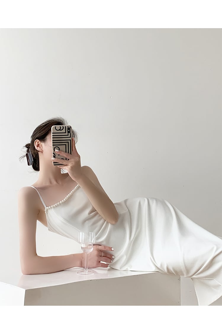 パールデザインが特徴のキャミソールドレス。体のラインを美しく見せてくれるシルエットが女性らしさを引き立て、パーティーシーンやお出かけにぴったりです。