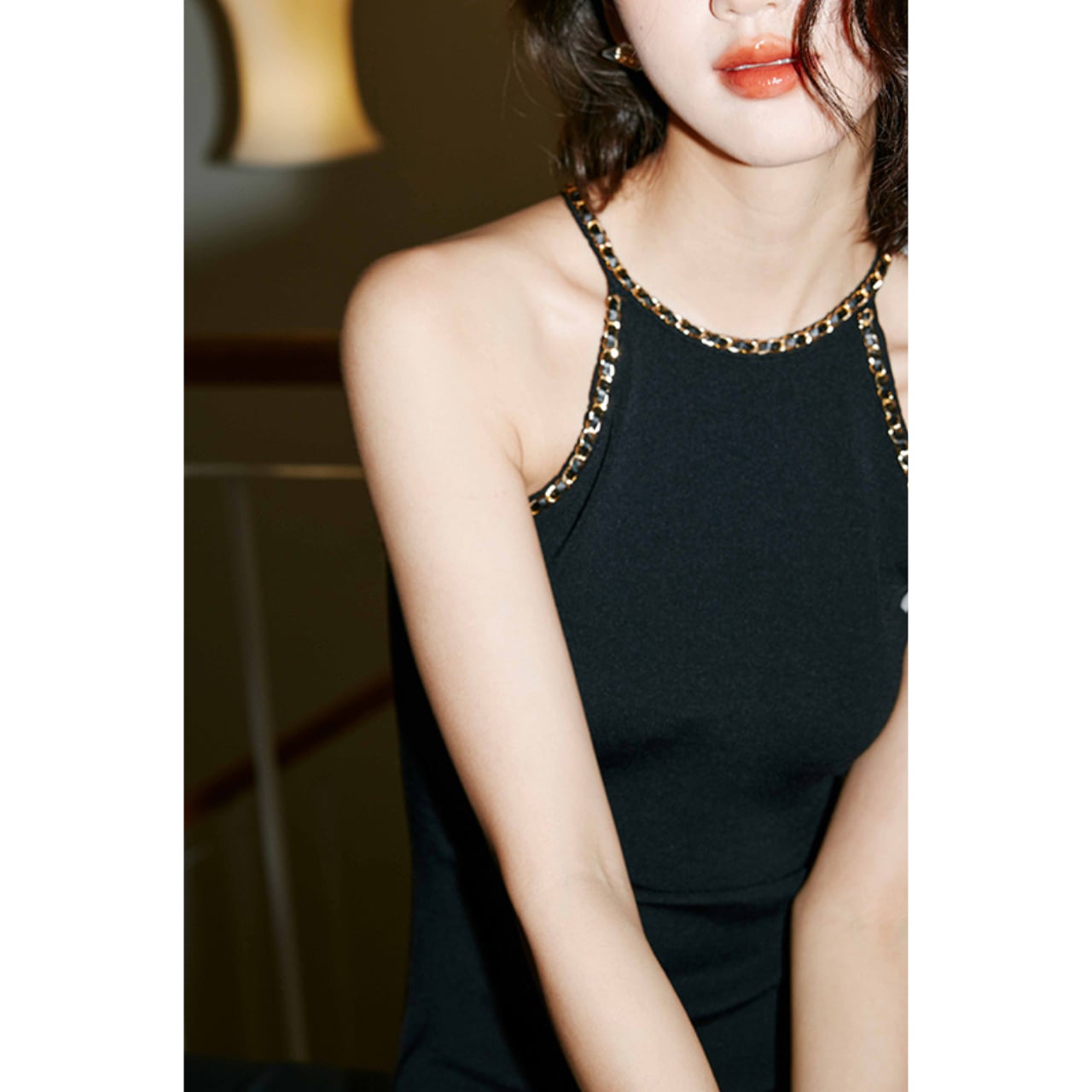 上品なゴールドチェーンが魅力のエレガントな印象を与えるアイテム。柔らかい素材で作られたニット生地は、着心地が良く、体のラインを美しく包み込んでくれます。華やかなパーティーシーンから、デートやお出かけでも活躍する一着です。