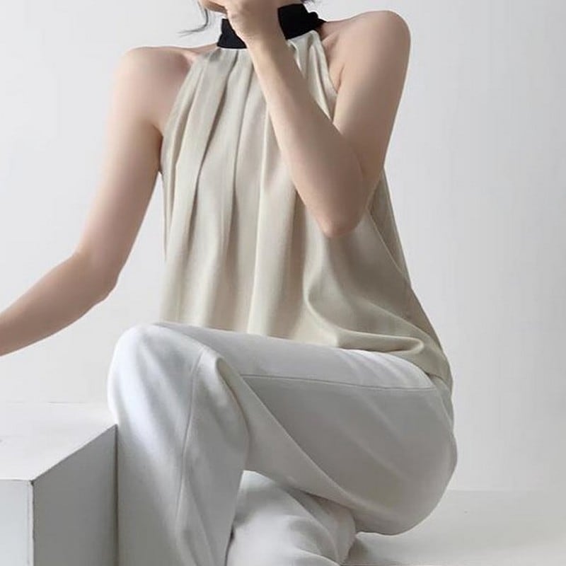 ネックリボンが可愛らしいホルターネックトップス。デコルテラインを綺麗に見せてくれるホルターネックと、女性らしいネックリボンがポイント。シンプルなデザインなので、デニムやスカートとも相性抜群です。