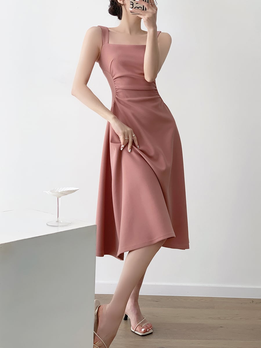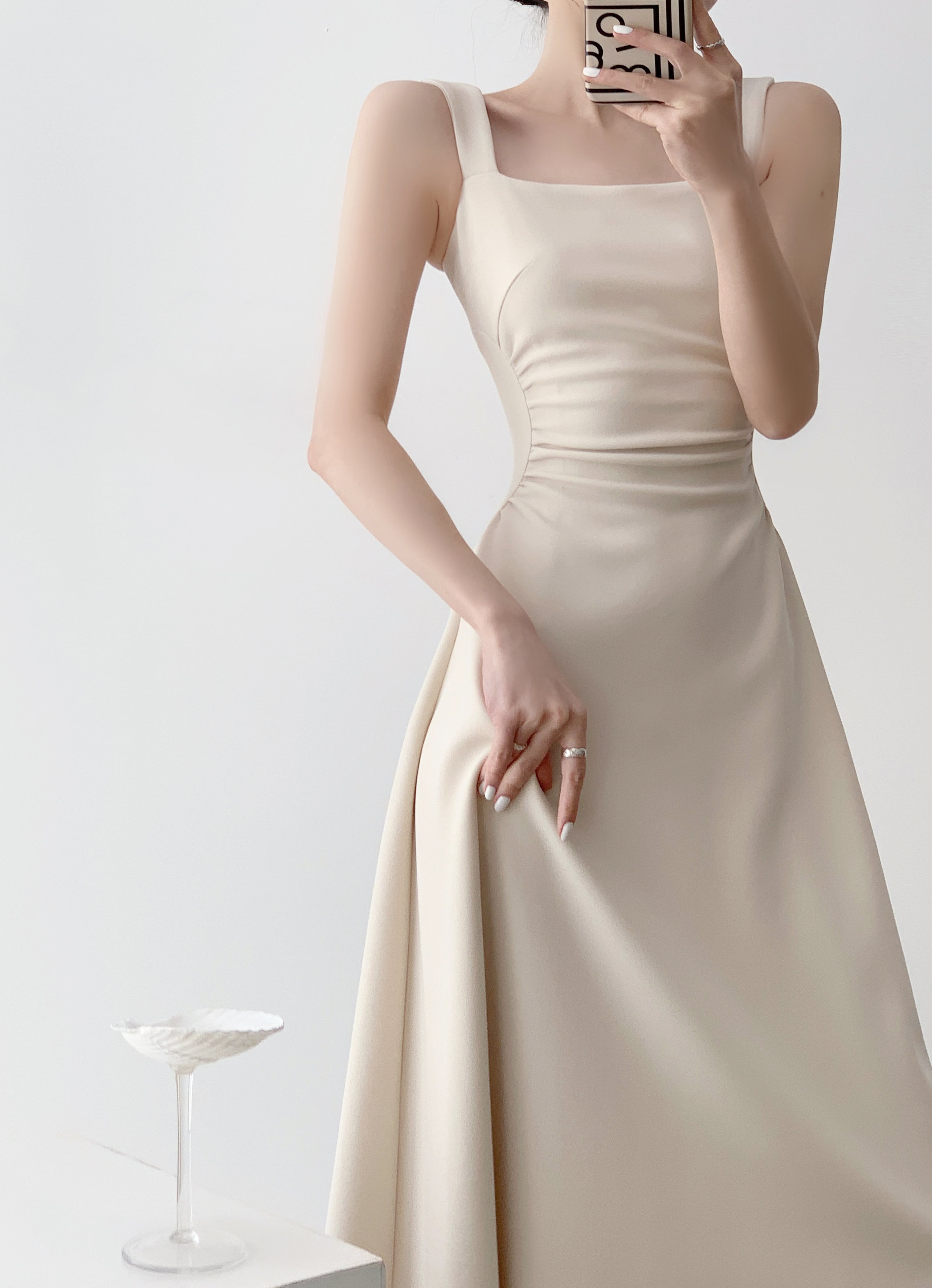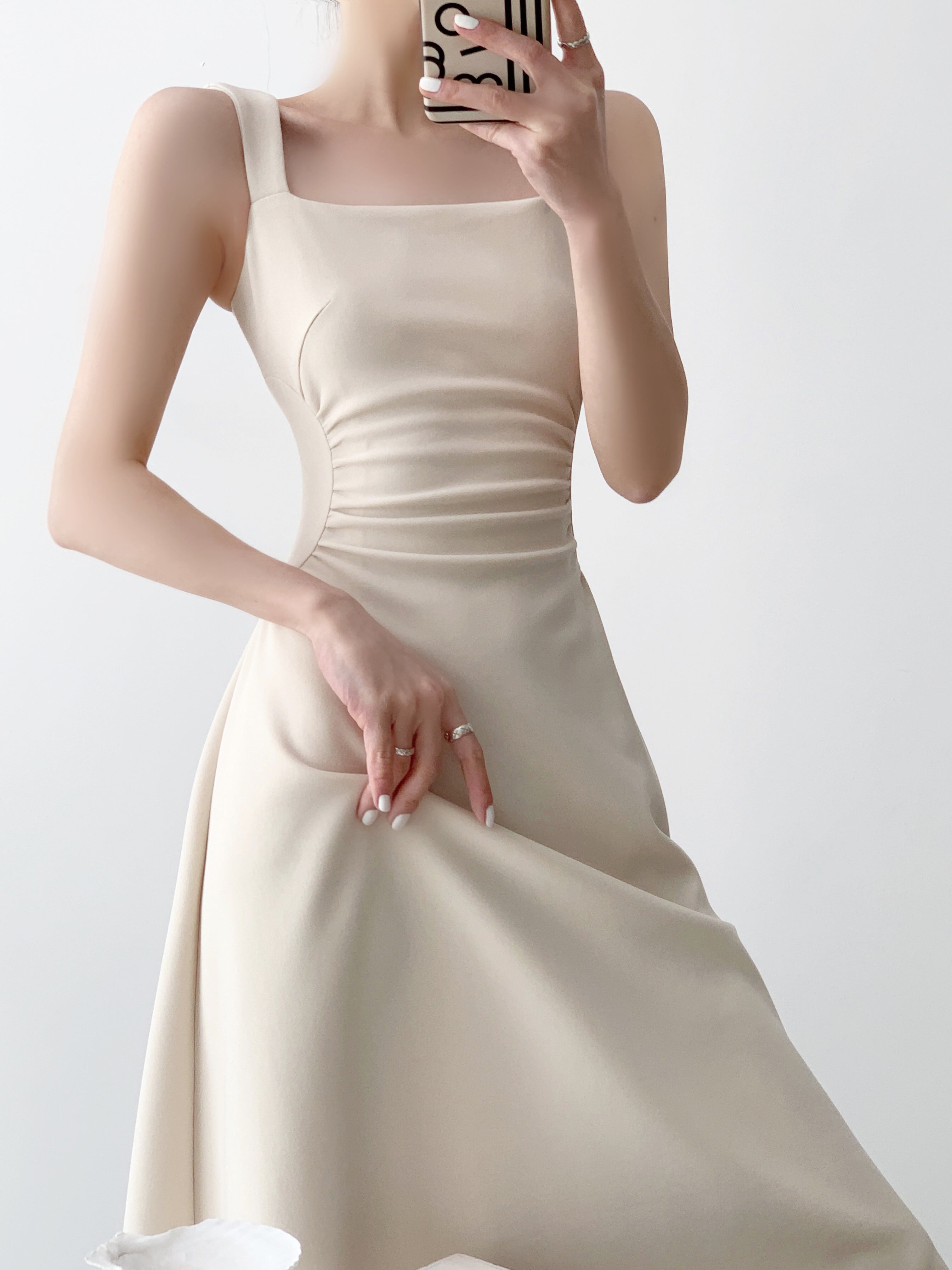 スクエアネックがシンプルかつ上品な印象を与える一着。シルエットを美しく見せてくれるタックデザインが特徴で、ウエストラインを程良くマークしてくれるので、女性らしいスタイルを演出してくれます。