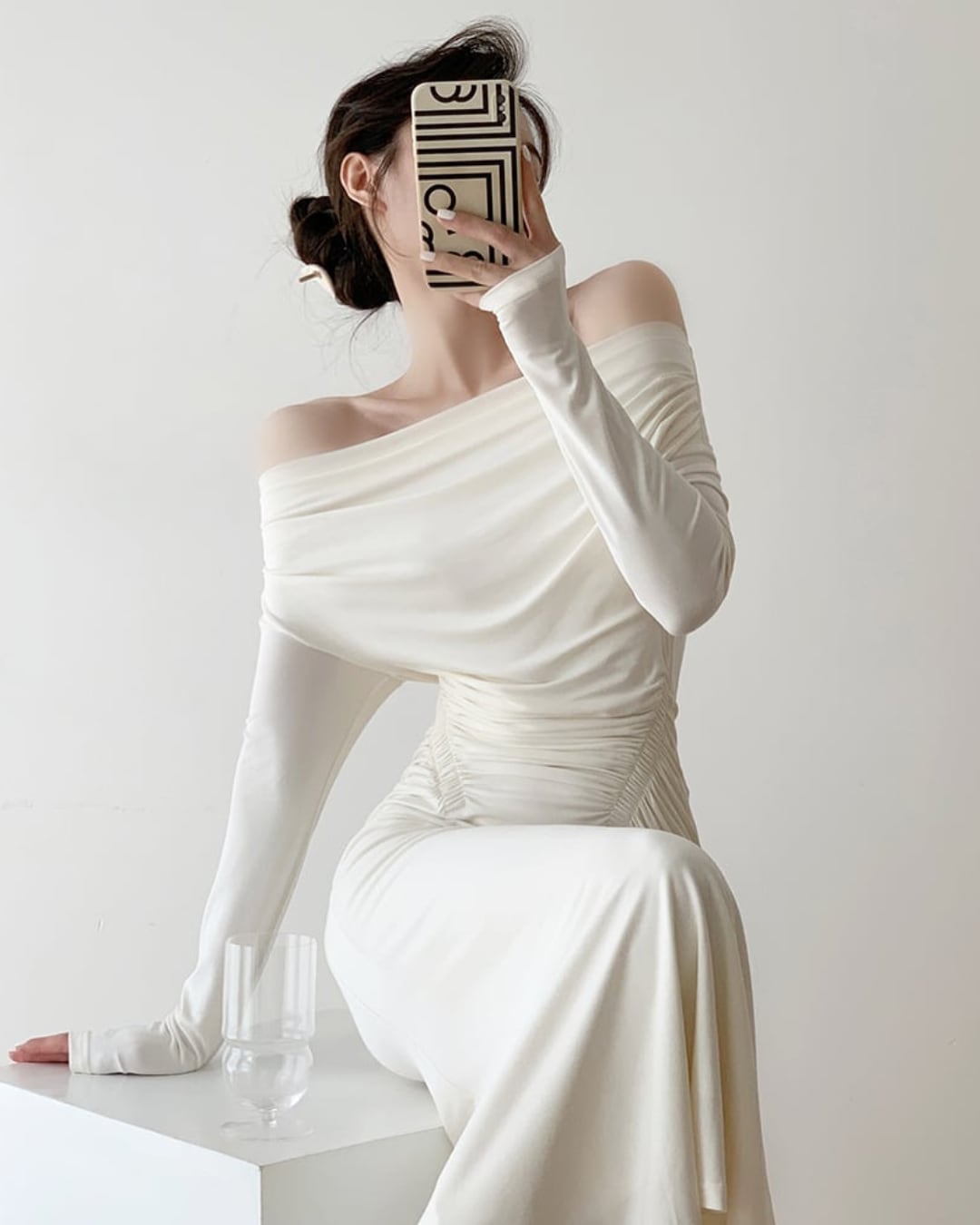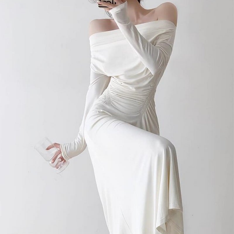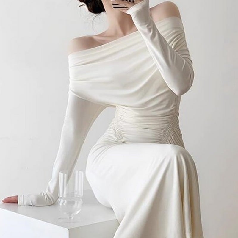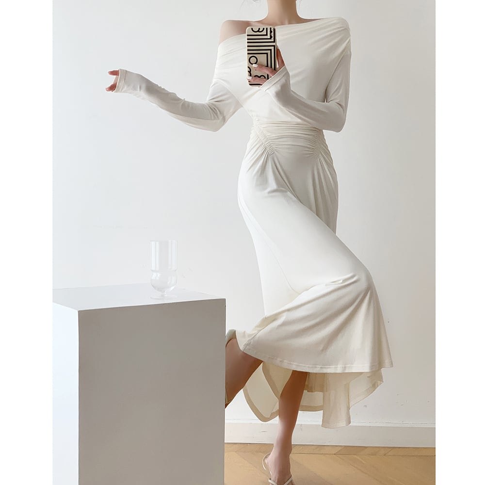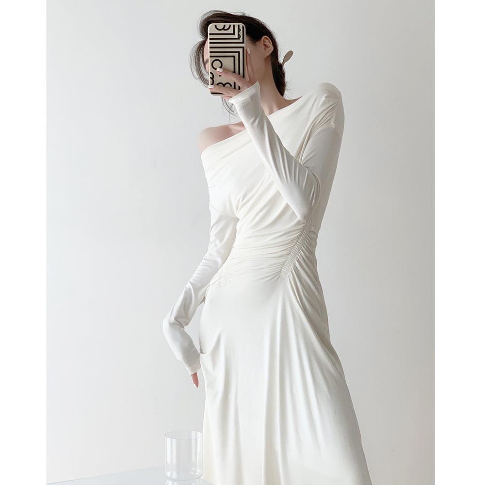 #ロングワンピース #ssホワイトワンピース #ssワンピース #オフショルダー #ドレープ #ギャザー