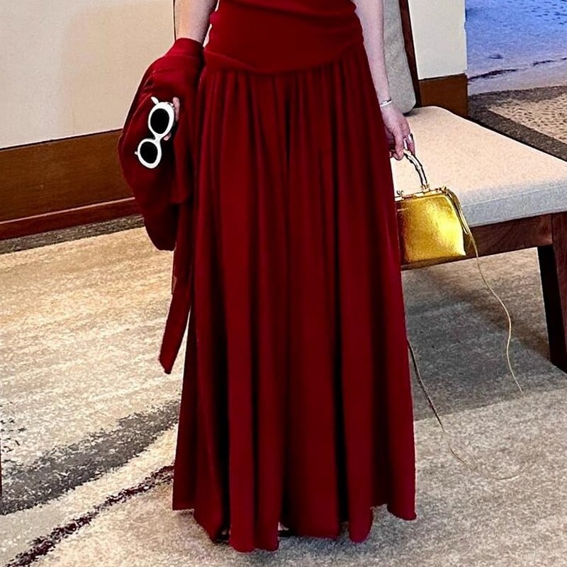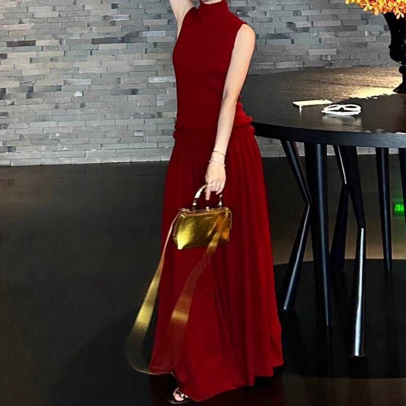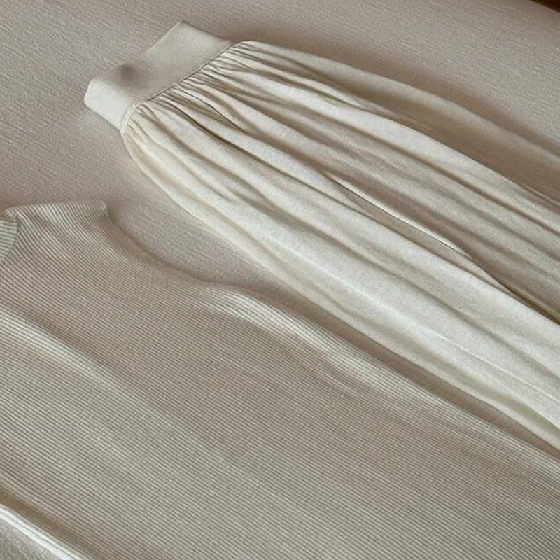 上品でお洒落なニットタートルネックと、フェミニンなスカートが一体になったセット。ニットの柔らかい肌触りと程よいタイトなフィット感が、女性らしさを引き立てます。普段使いからフォーマルな場面まで幅広く活躍するアイテムです。