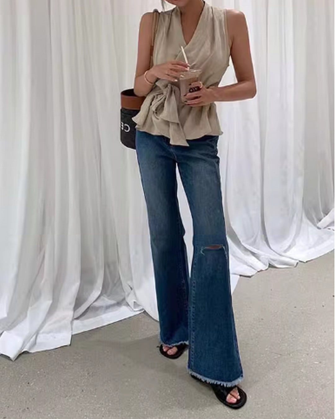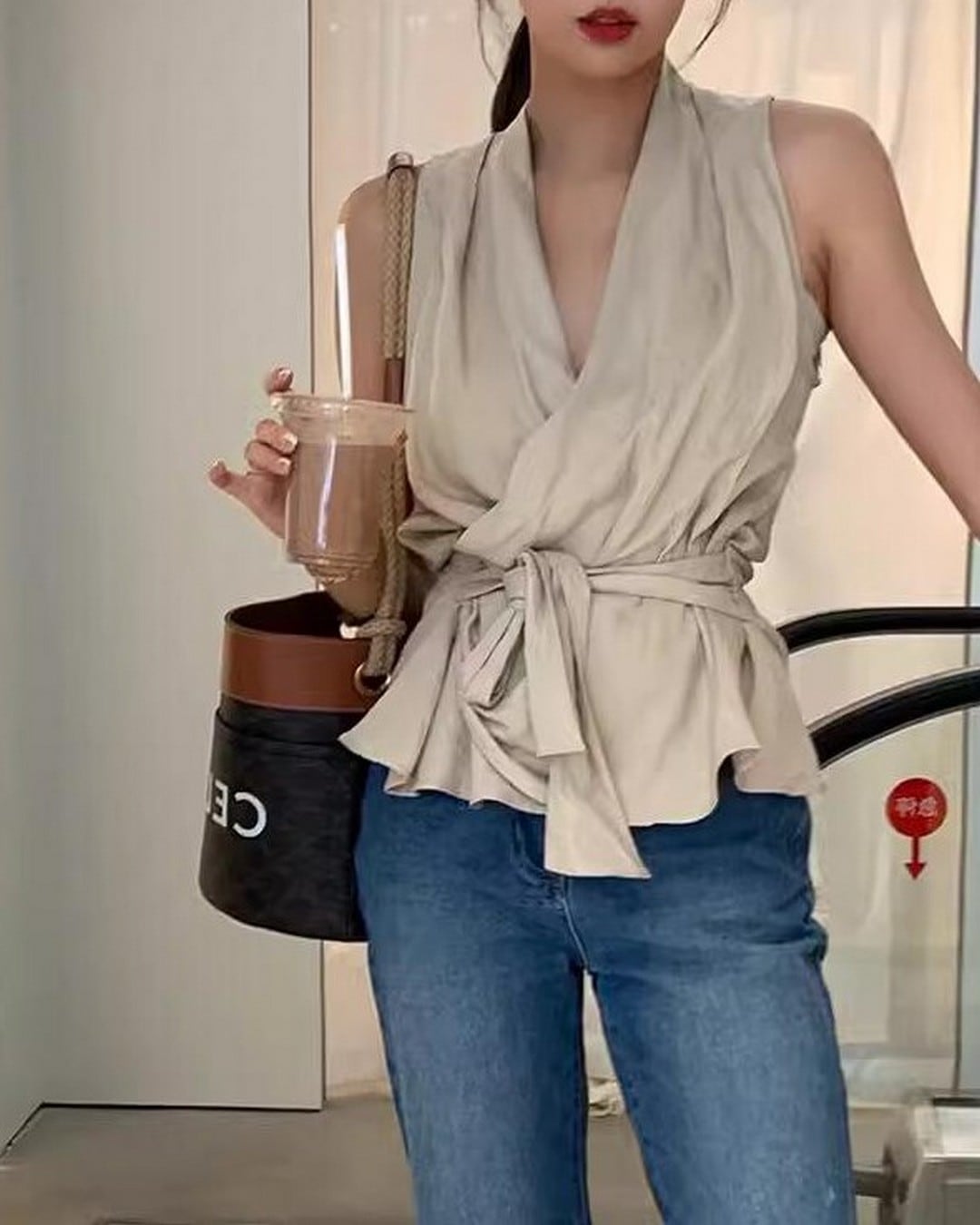 トップのカシュクールが大人っぽいトップス。お出かけシーンからオフィスカジュアルまで、幅広いシーンで活躍します。