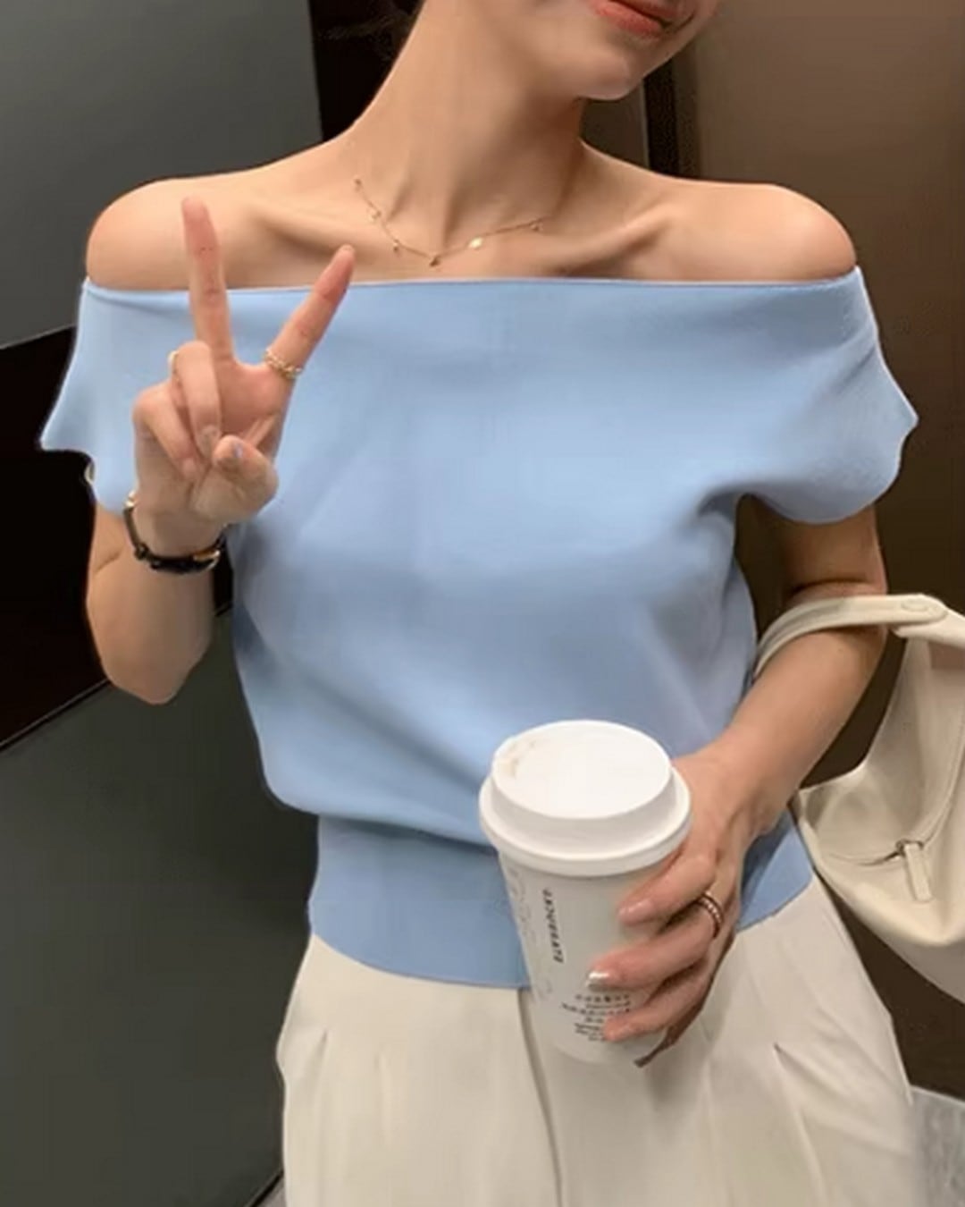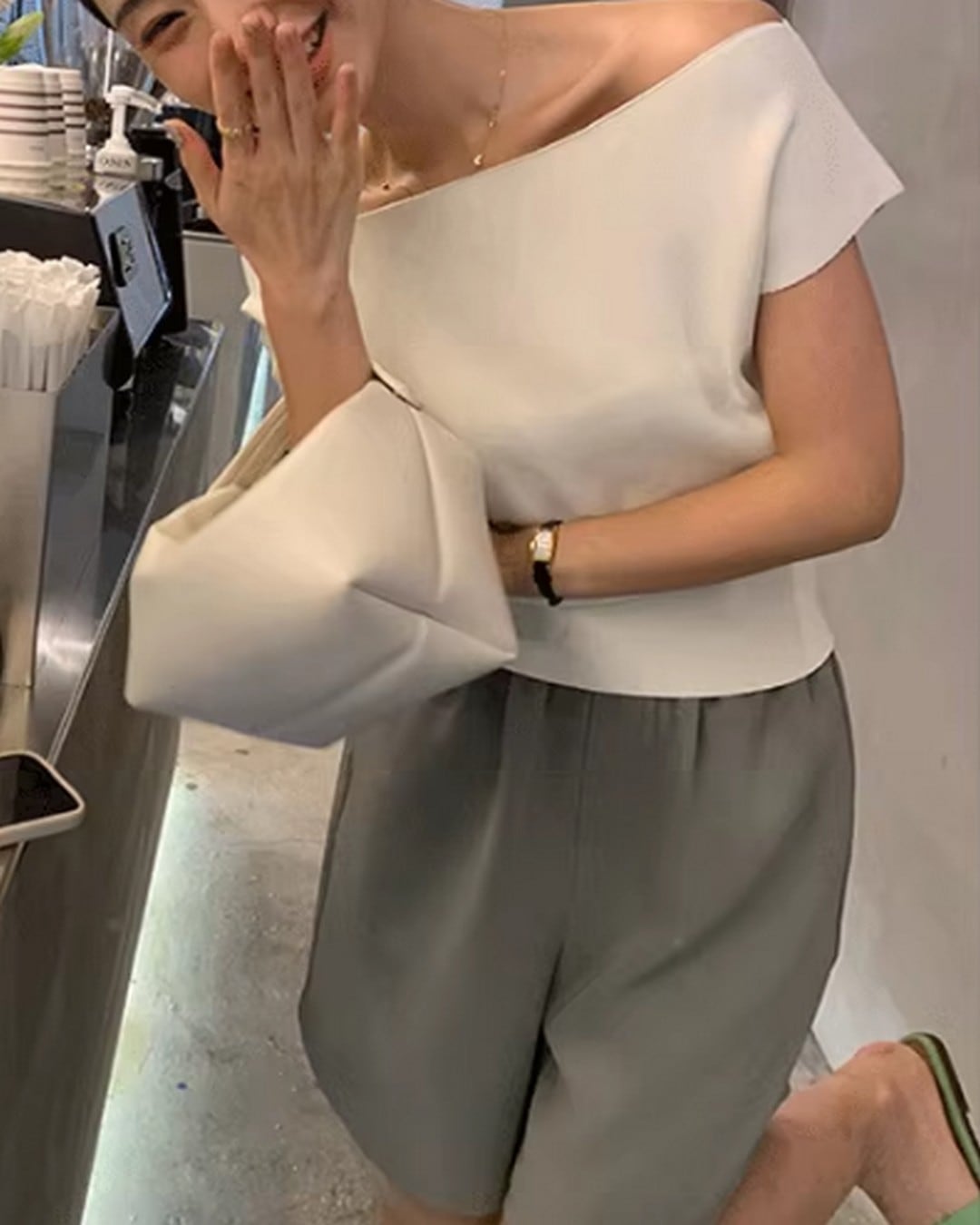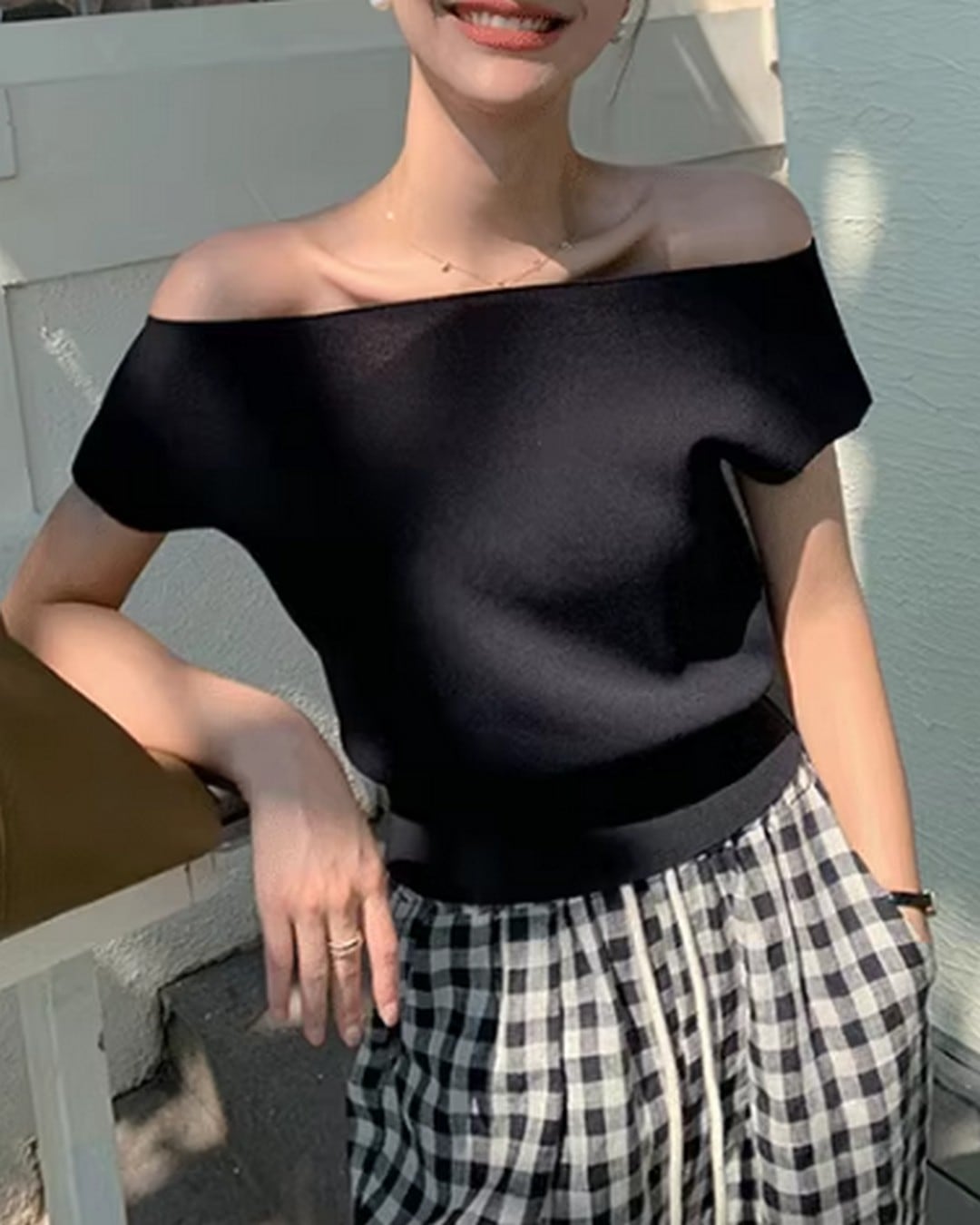シンプルなデザインでありながら一枚で女性らしさを引き立てるアイテム。肌の露出が程よく、二の腕を華奢に見せてくれるトップスです。