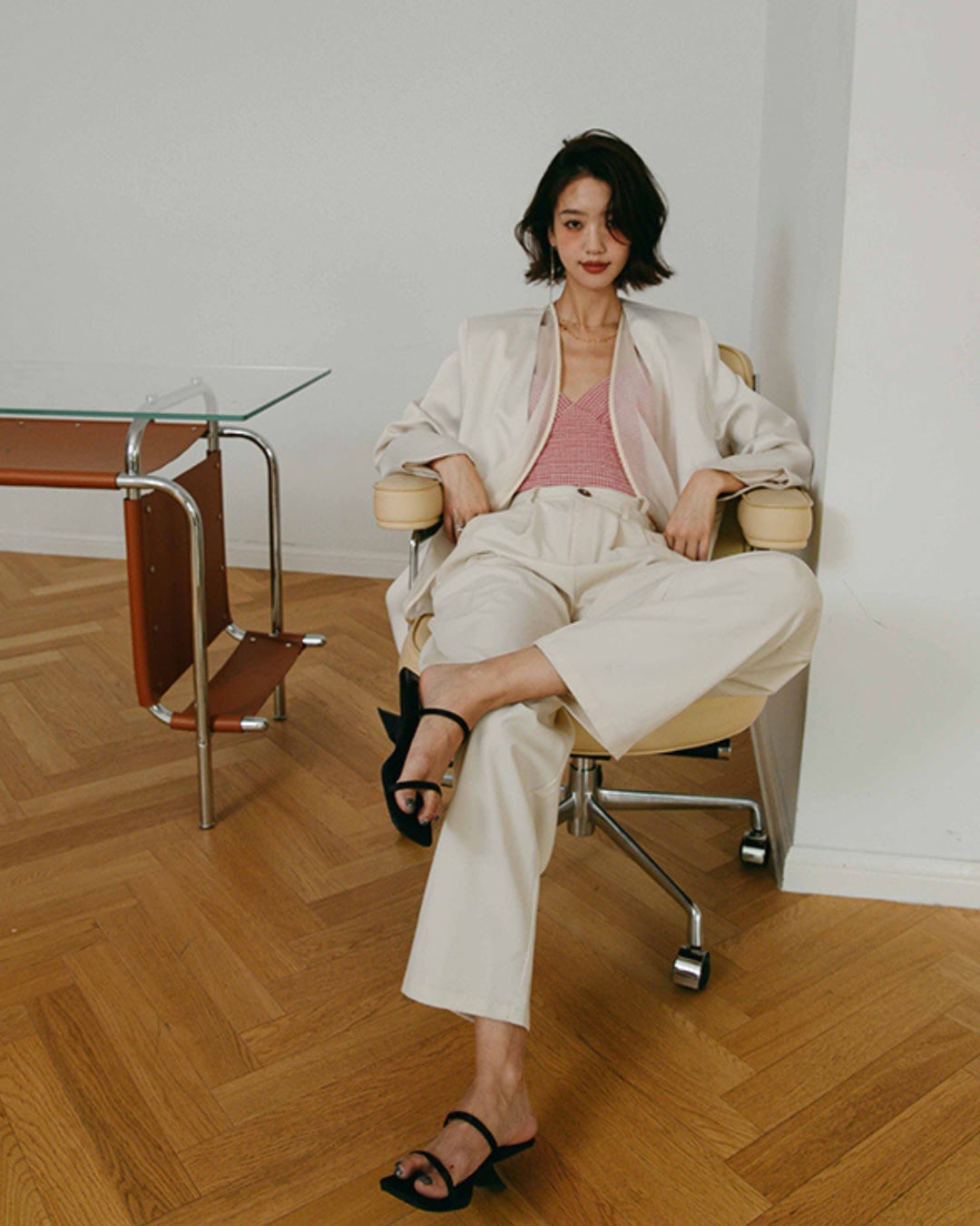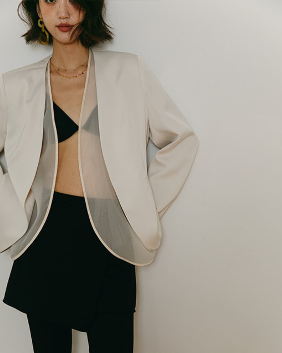 上品なオーガンジー素材が特徴のジャケット。透け感のあるオーガンジーが上品さを演出し、レイヤードデザインがおしゃれなアクセントになっています。お出かけやパーティーシーンにぴったりのアイテムです。