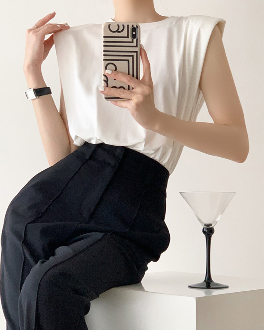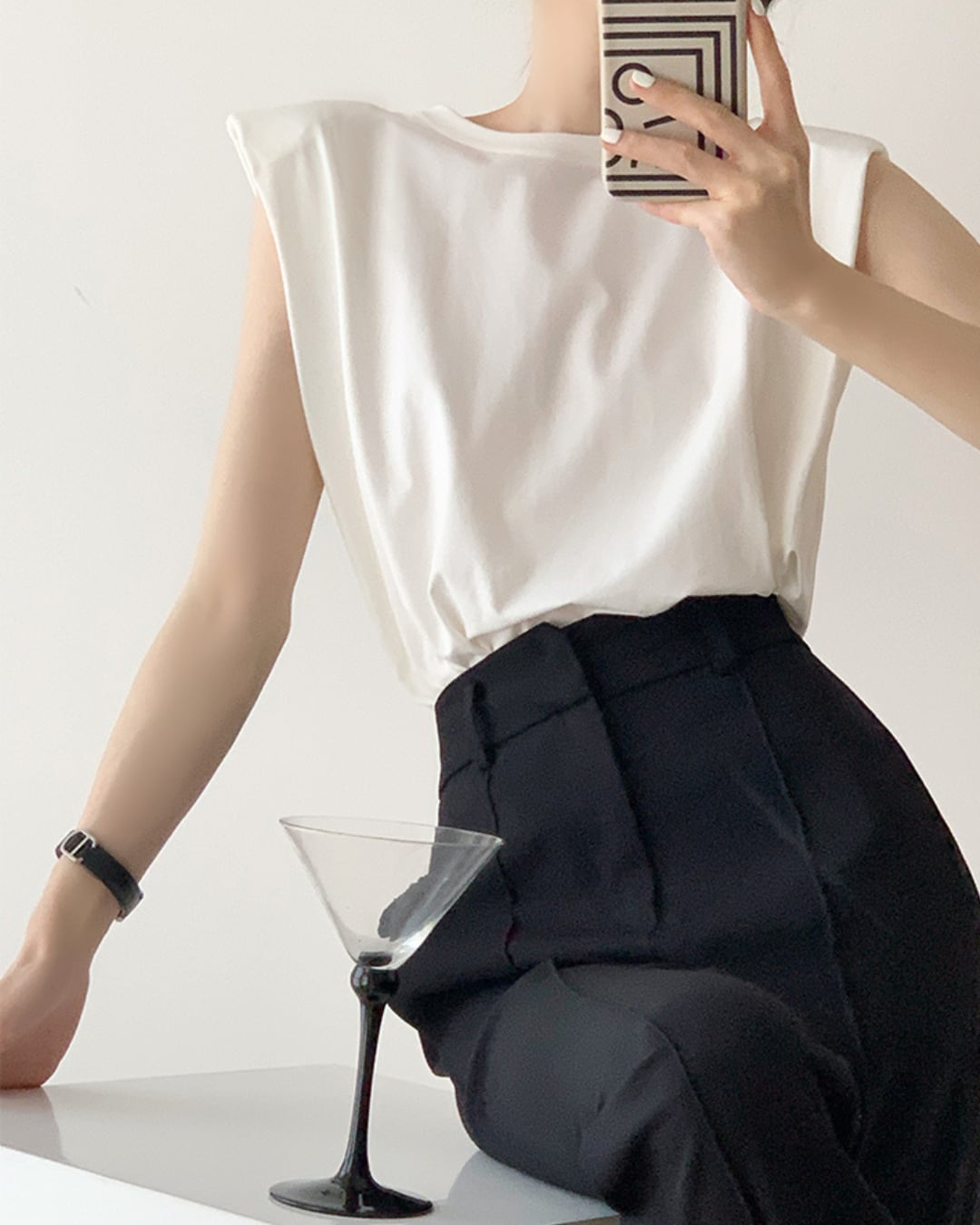 ショルダーパッドが入ったノースリーブトップスは、シルエットを美しく引き立ててくれる一枚。シンプルながらも存在感のあるデザインは、コーディネートの主役として活躍間違いなしです。