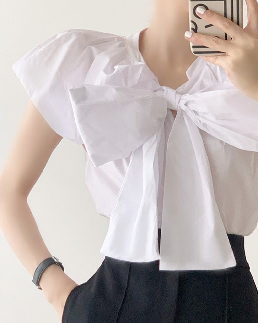 フレアな襟とリボンデザインが、上品で可愛らしい印象を与えます。シンプルなデザインながら、存在感のあるトップスで、1枚でコーディネートが完成します。