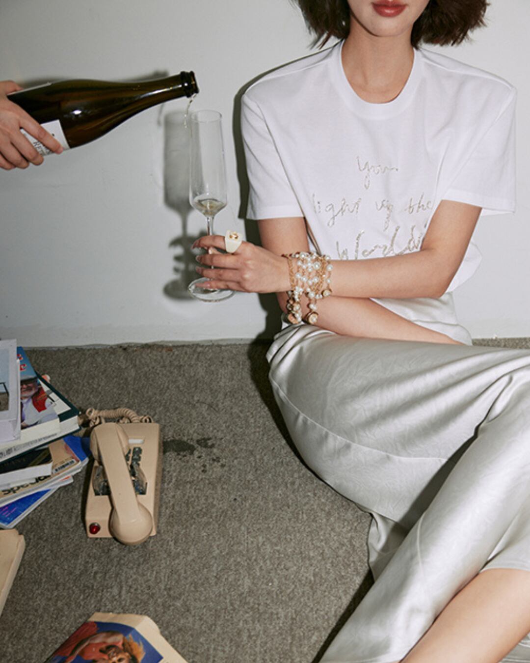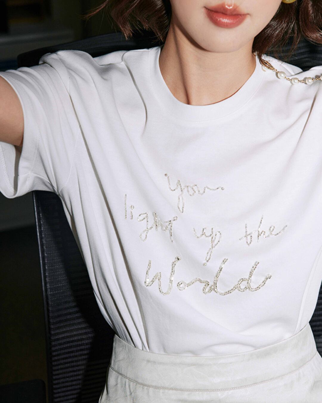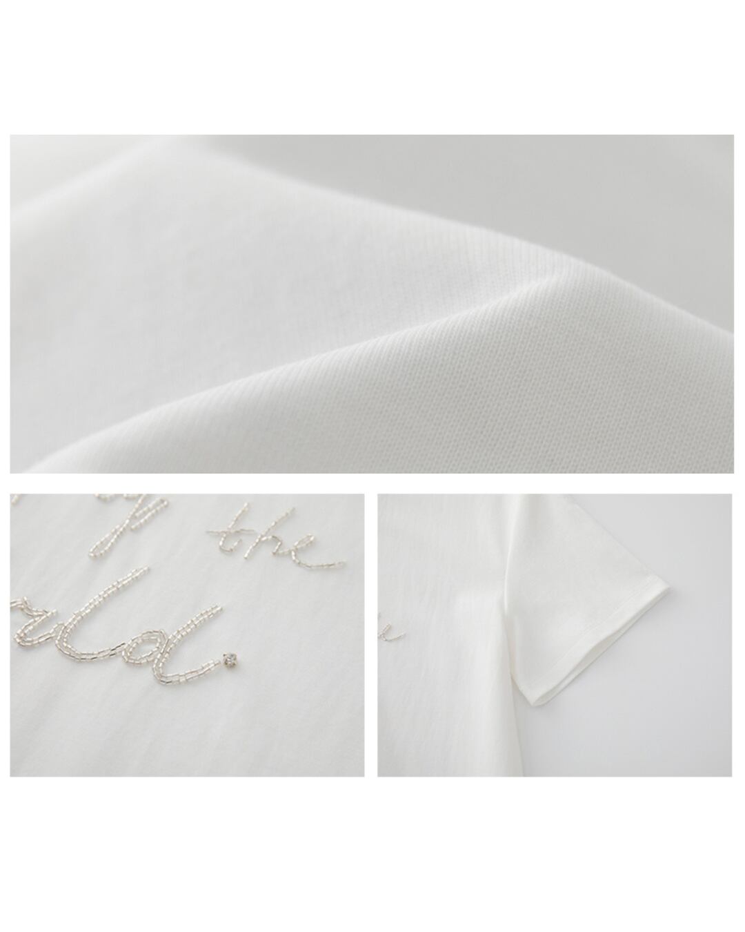 シンプルなデザインに上品なビーズ装飾が施された一枚。カジュアルなTシャツスタイルに、ちょっとしたエレガンスをプラスしてくれます。