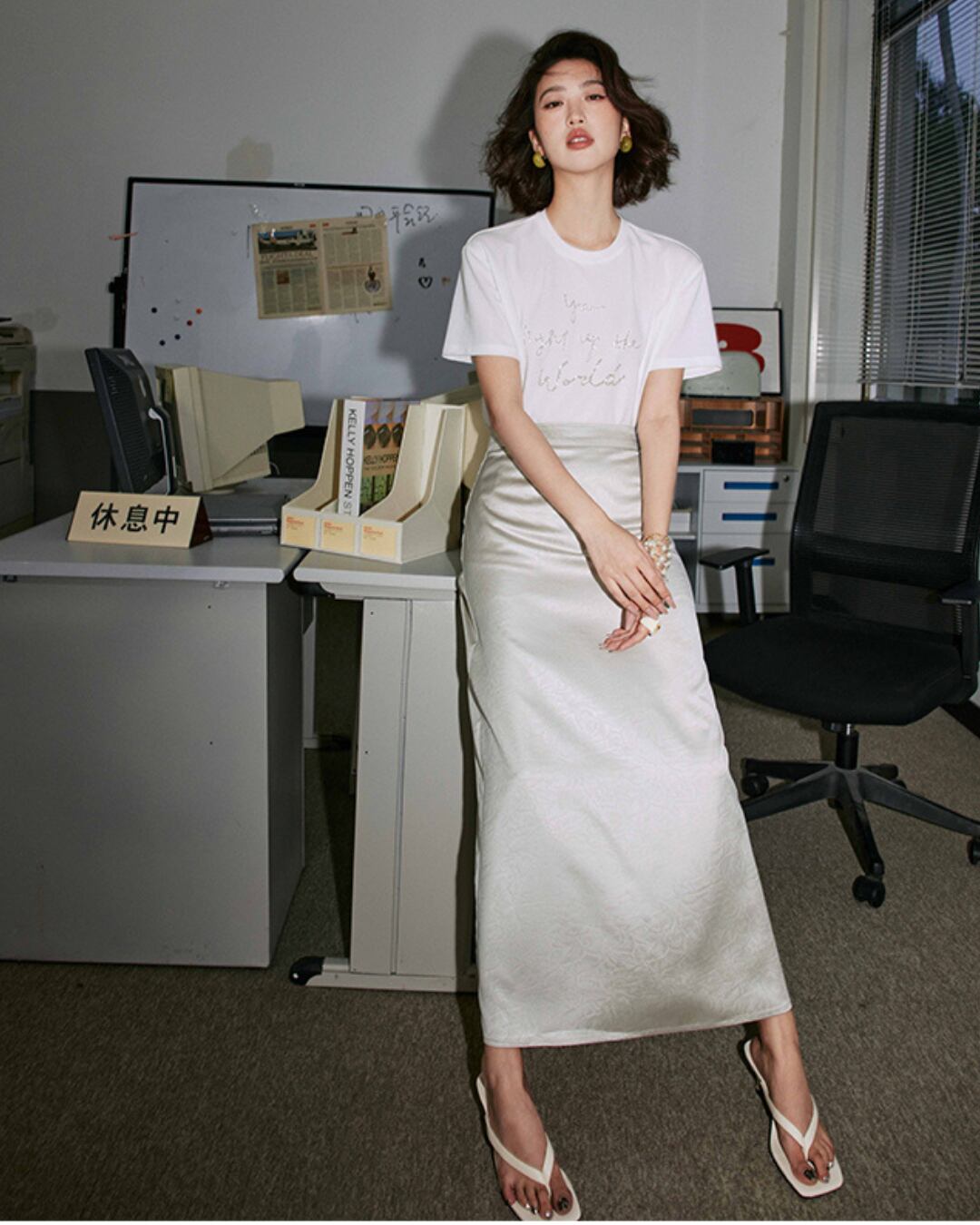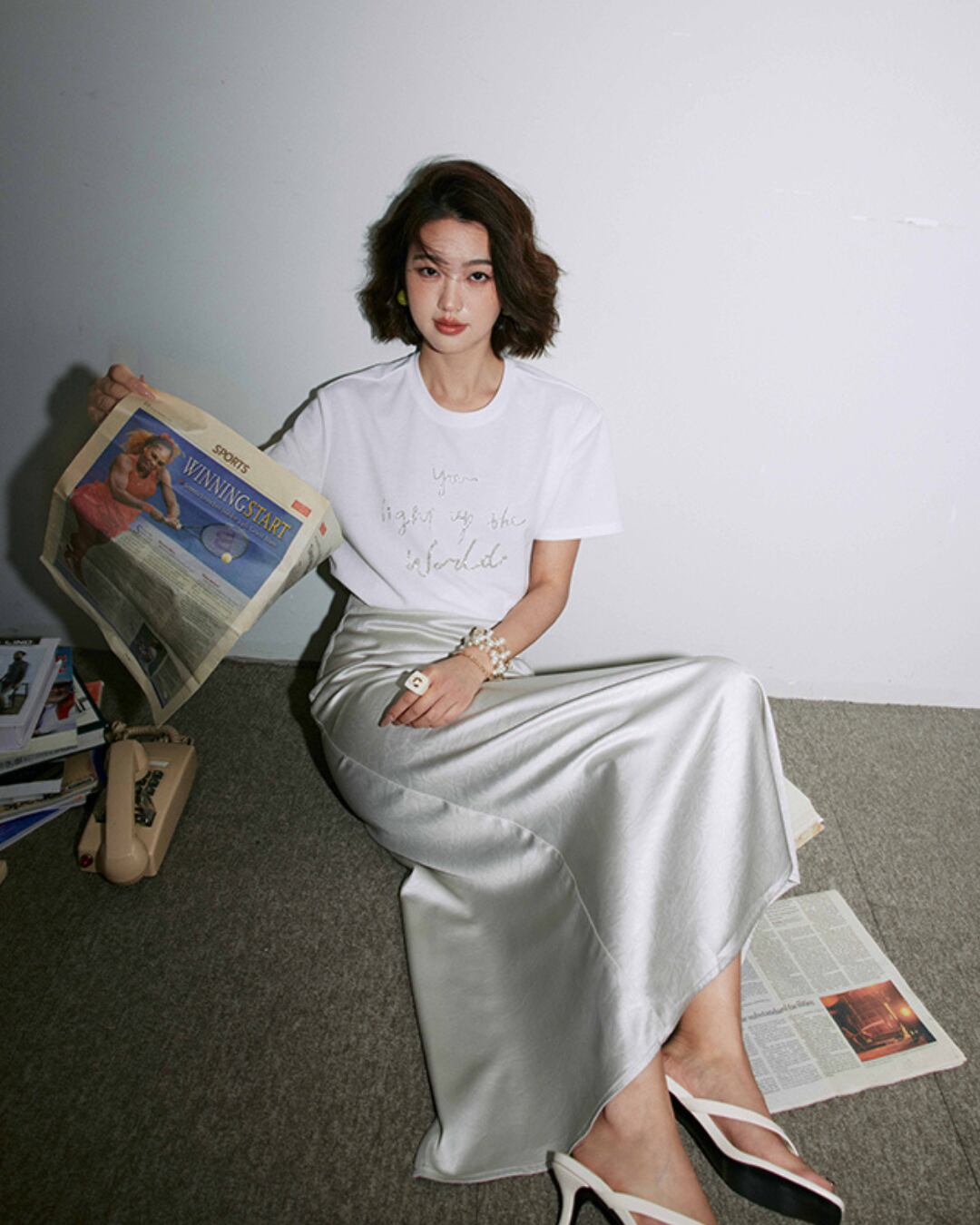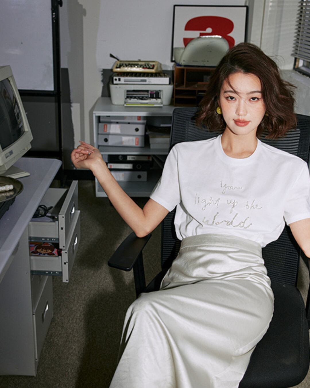シンプルなデザインに上品なビーズ装飾が施された一枚。カジュアルなTシャツスタイルに、ちょっとしたエレガンスをプラスしてくれます。