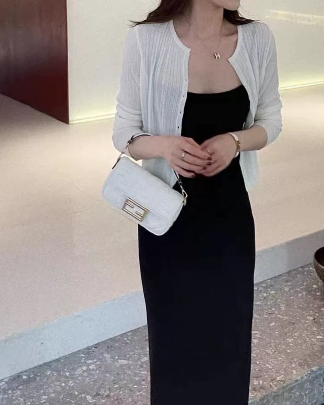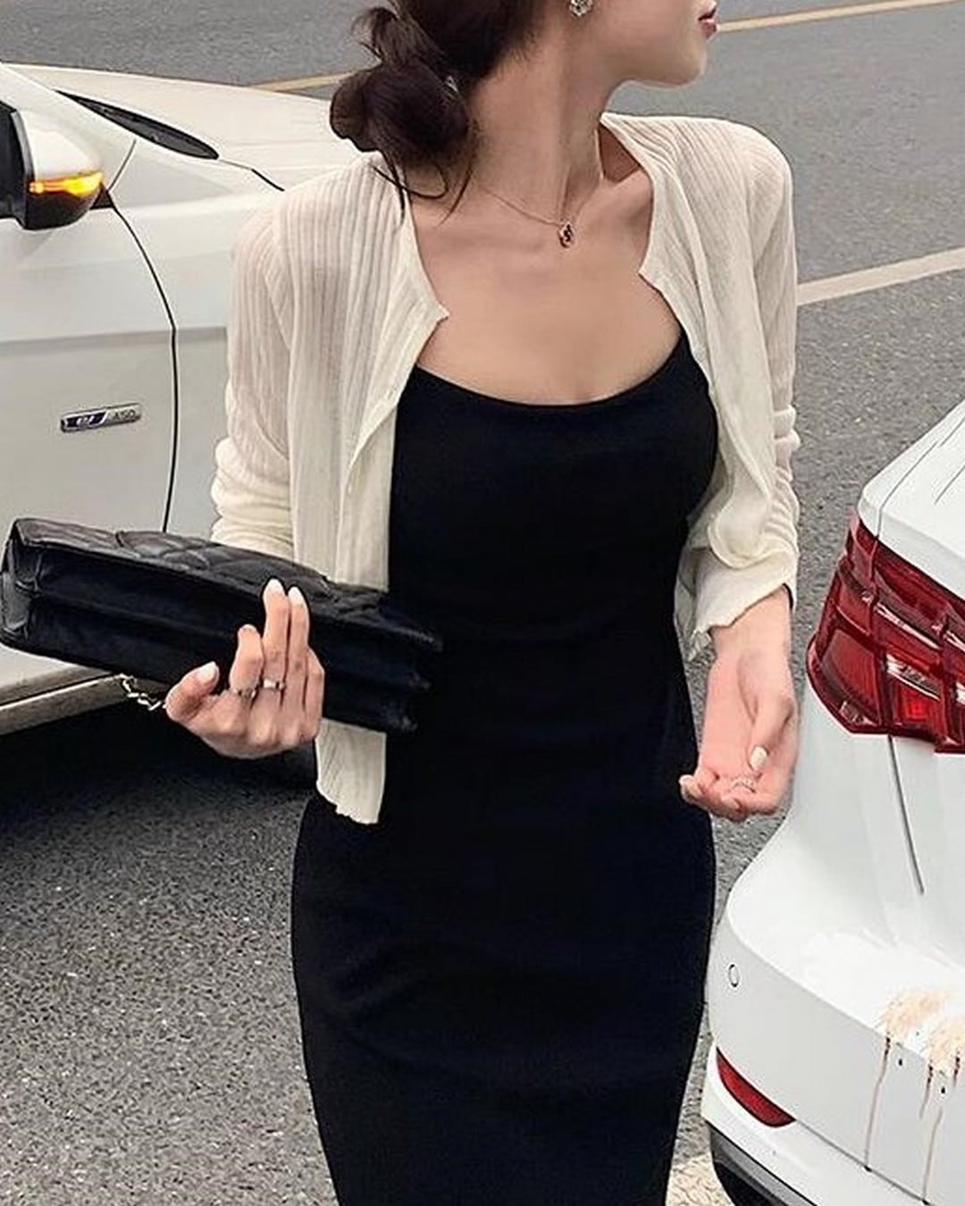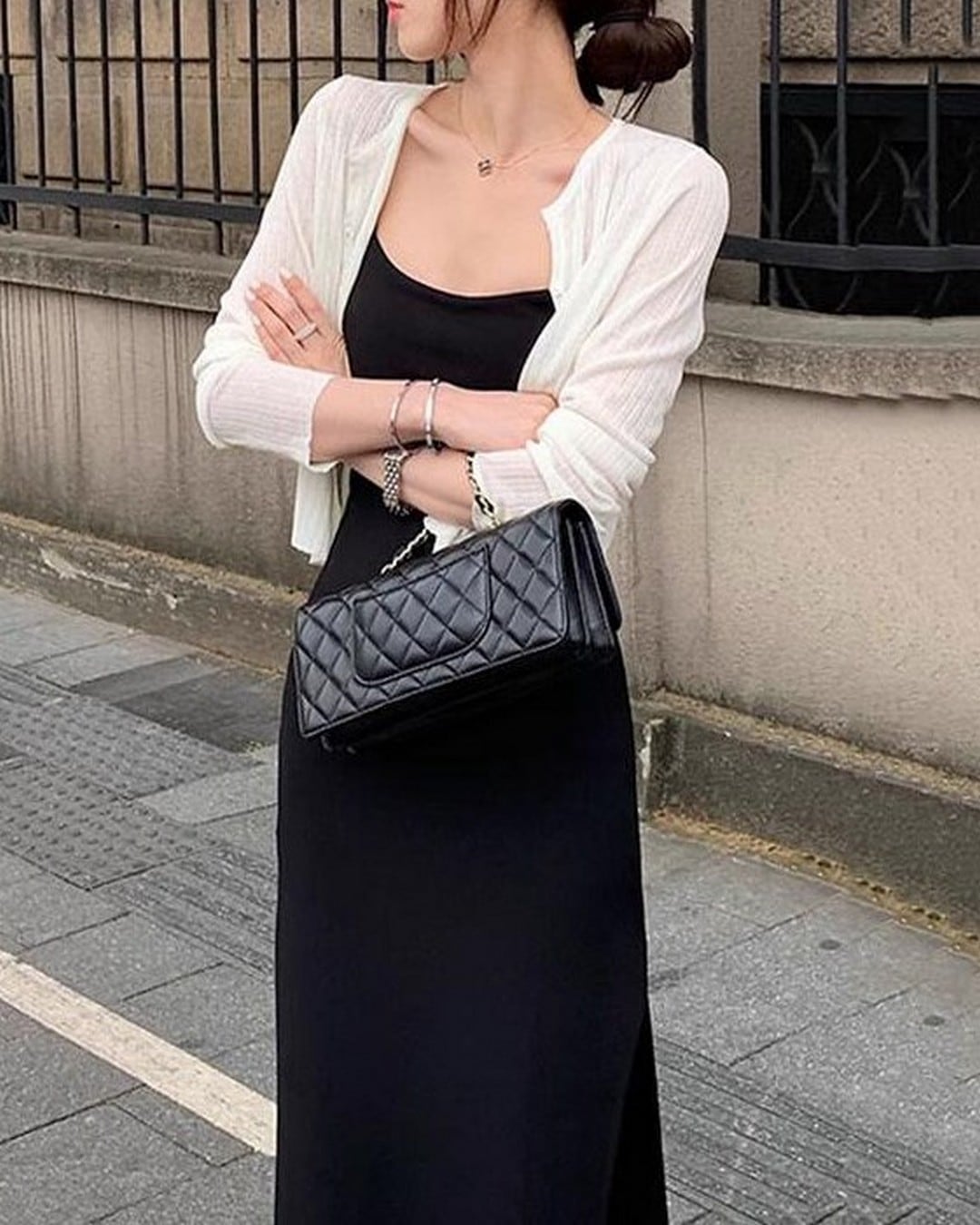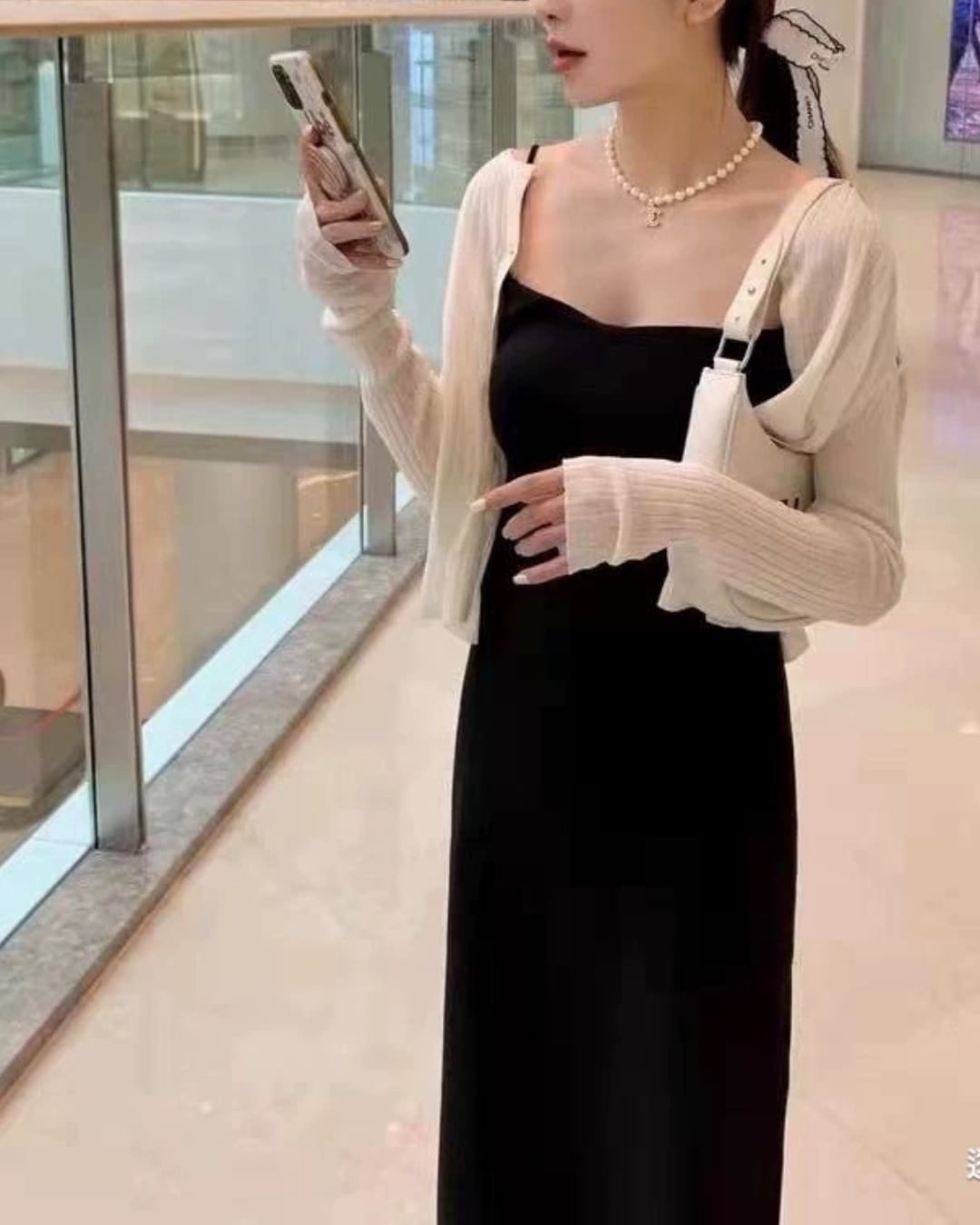 カーディガンは羽織るだけでおしゃれなレイヤードスタイルを演出し、スリットワンピースは女性らしいシルエットとセクシーなスリットが魅力的です。また、カーディガンとスリットワンピースを別々に着用することもでき、着まわしの幅が広がります。