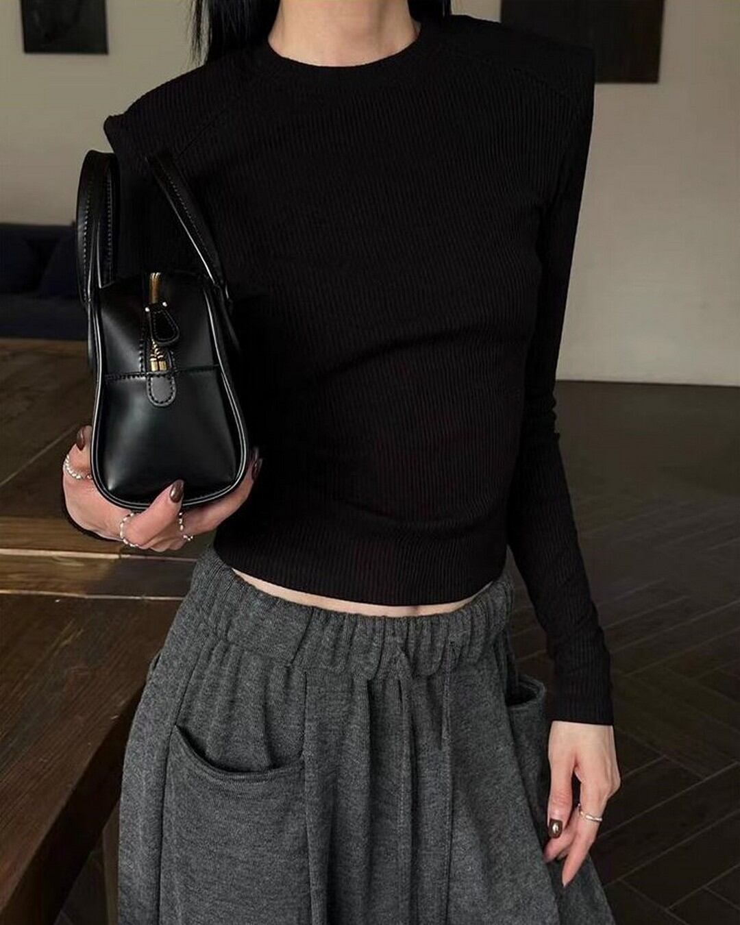 肩にパッドが入ったショート丈のトップス。肩のラインを強調してスタイリッシュで引き締まった印象を与えることができます。バランスの良いシルエットを作り出す効果があり、トップスがショート丈なので、ウエストラインを強調してスタイリングすることができるアイテムです。