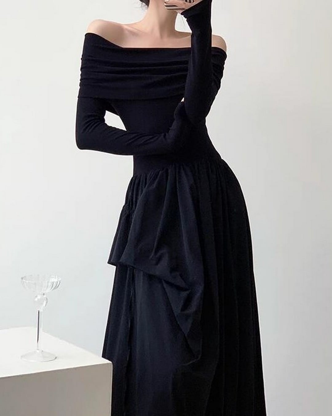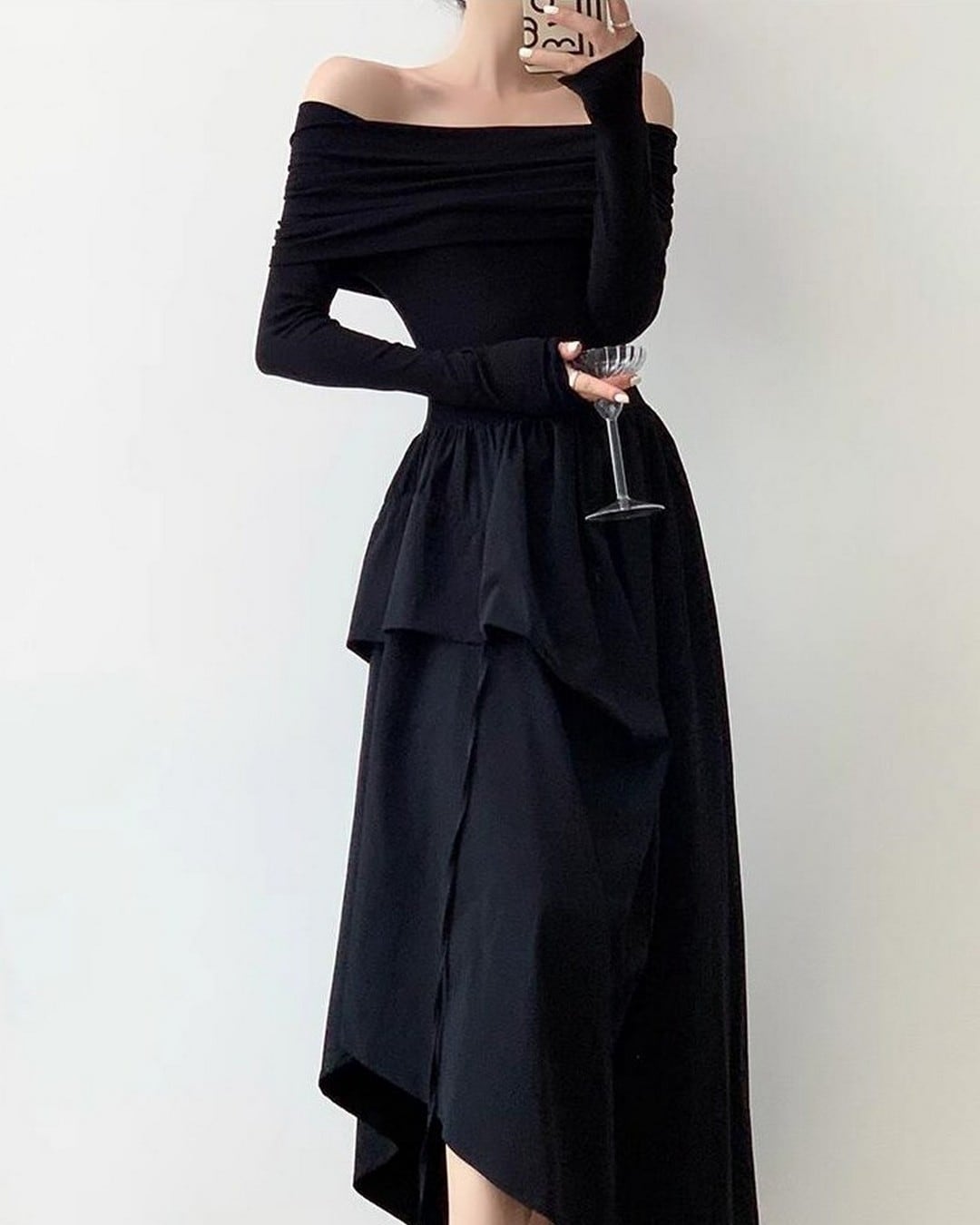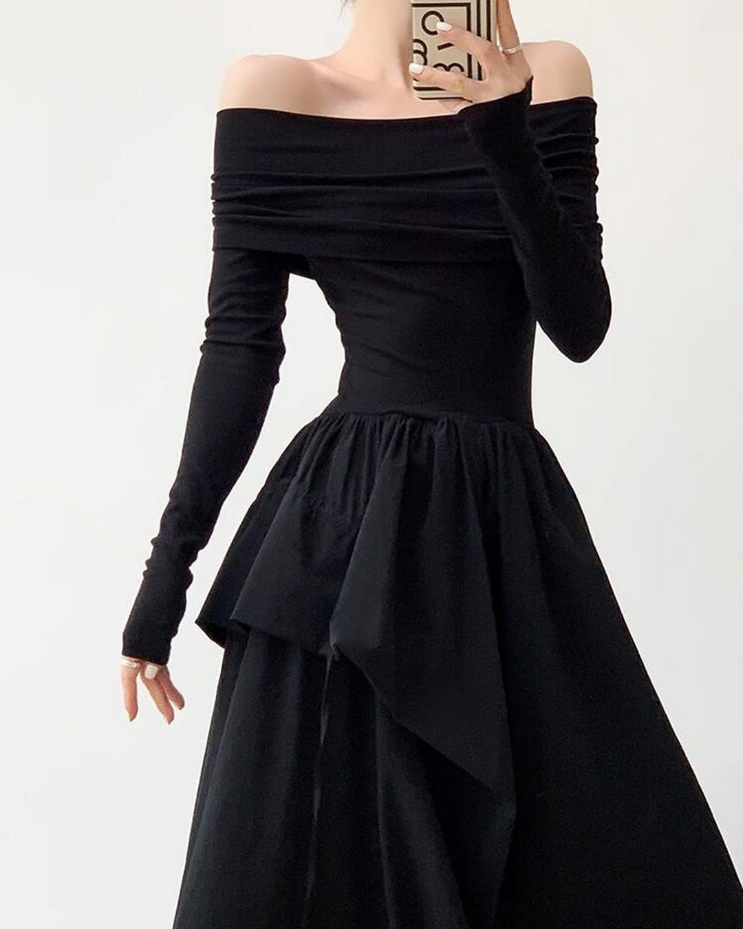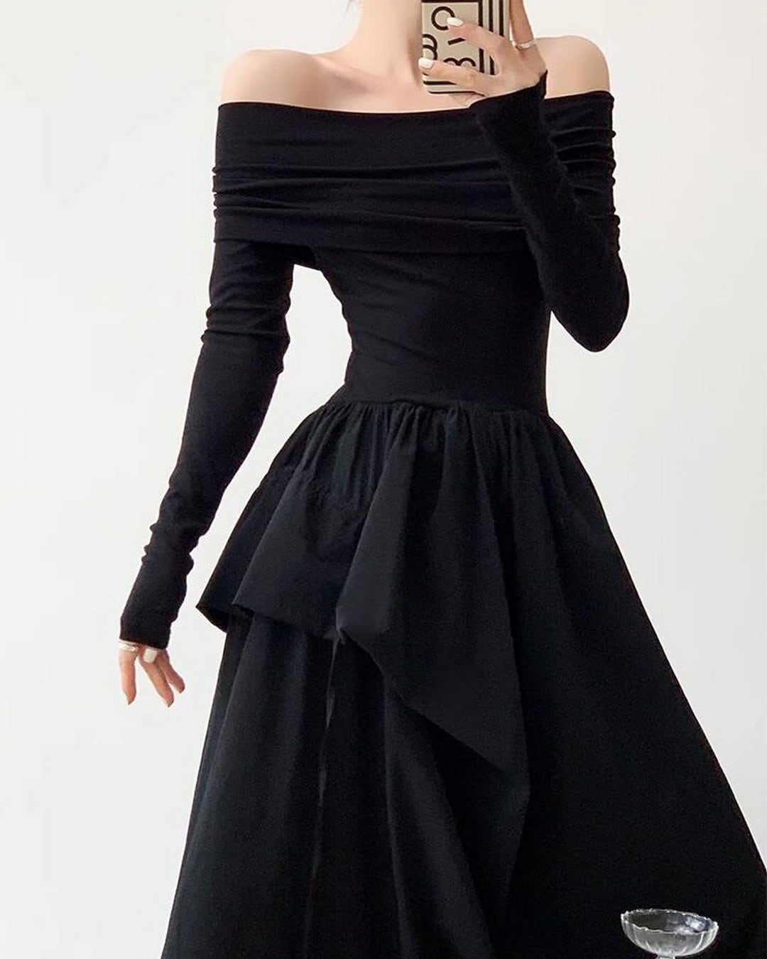 肩を華やかに露出させるデザインが女性らしい魅力を引き立て、華やかな印象を演出します。フレアデザインで広がるスカート部分が、動くたびに揺れて優雅な雰囲気を演出し、女性らしいシルエットを作り出します。