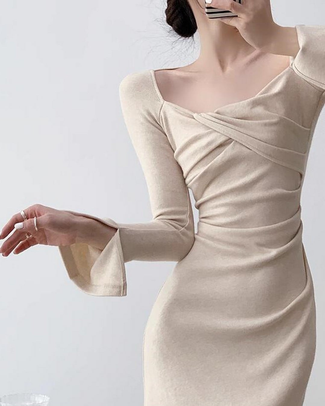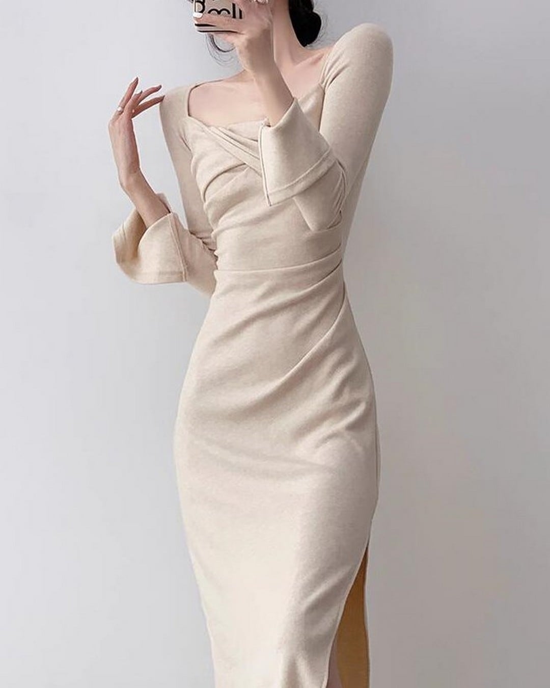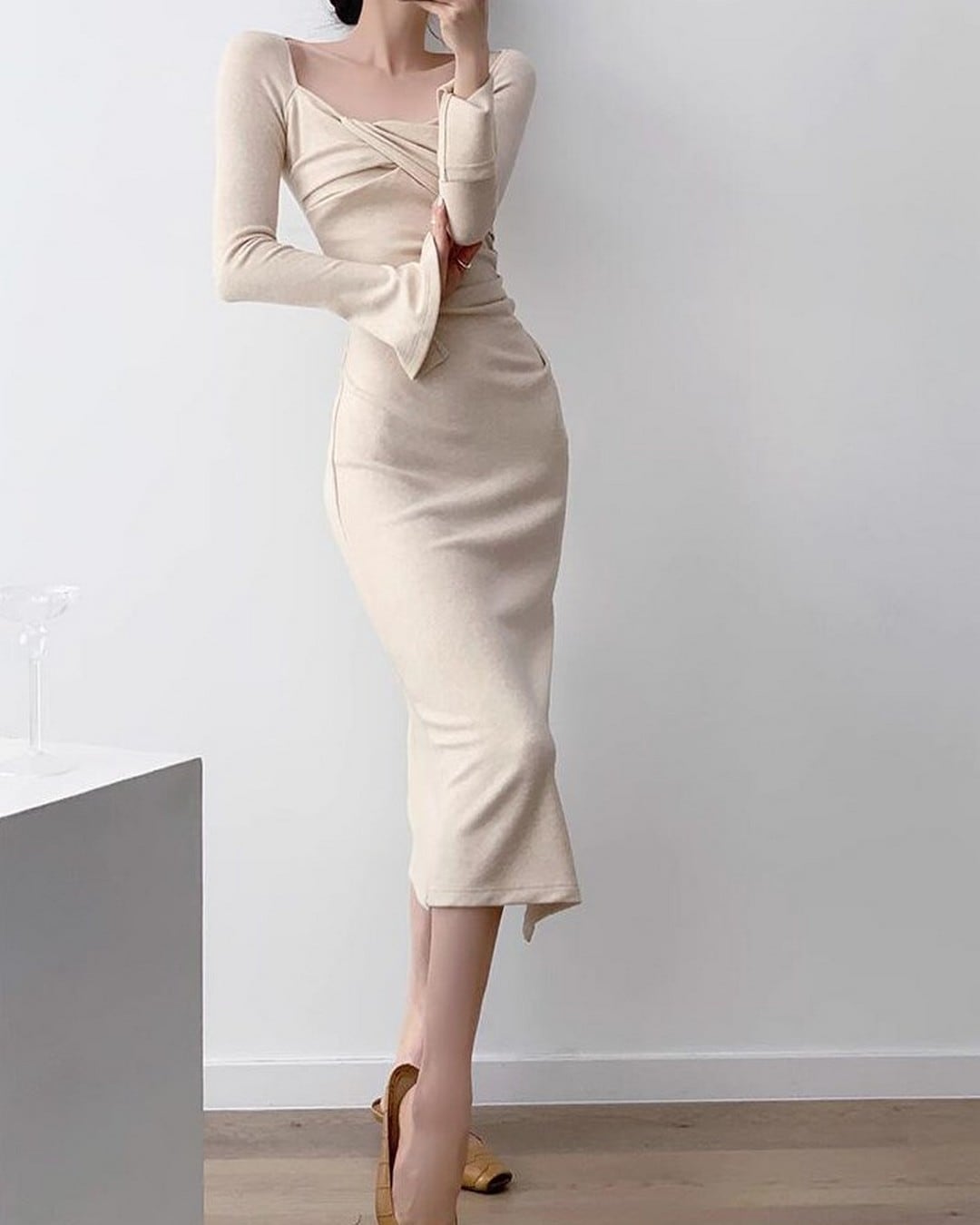 フレアのあるヘムスリーブが女性らしい柔らかな印象を演出し、スリットが入っていることで、モダンなセクシーさをプラスしたデザインです。様々なシーンで着用できる、スタイリッシュで魅力的なワンピースです。
