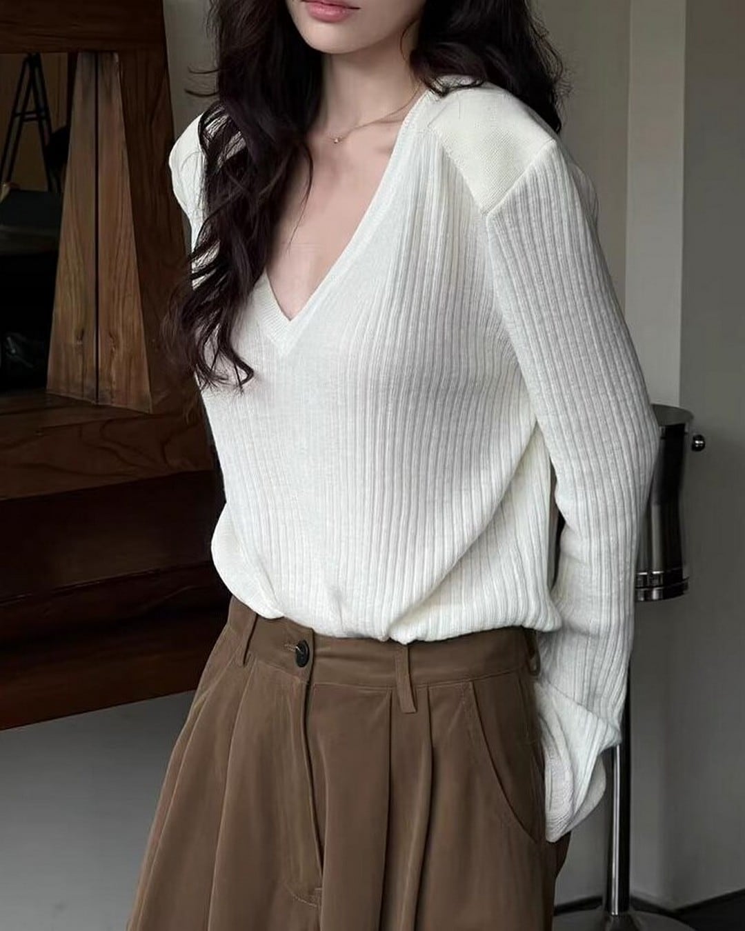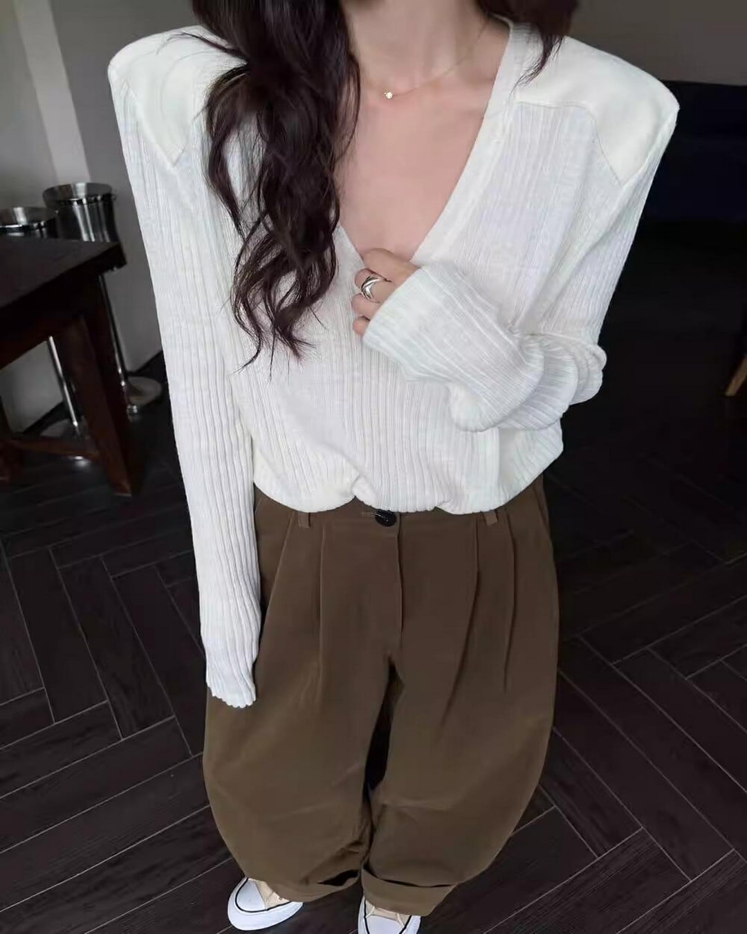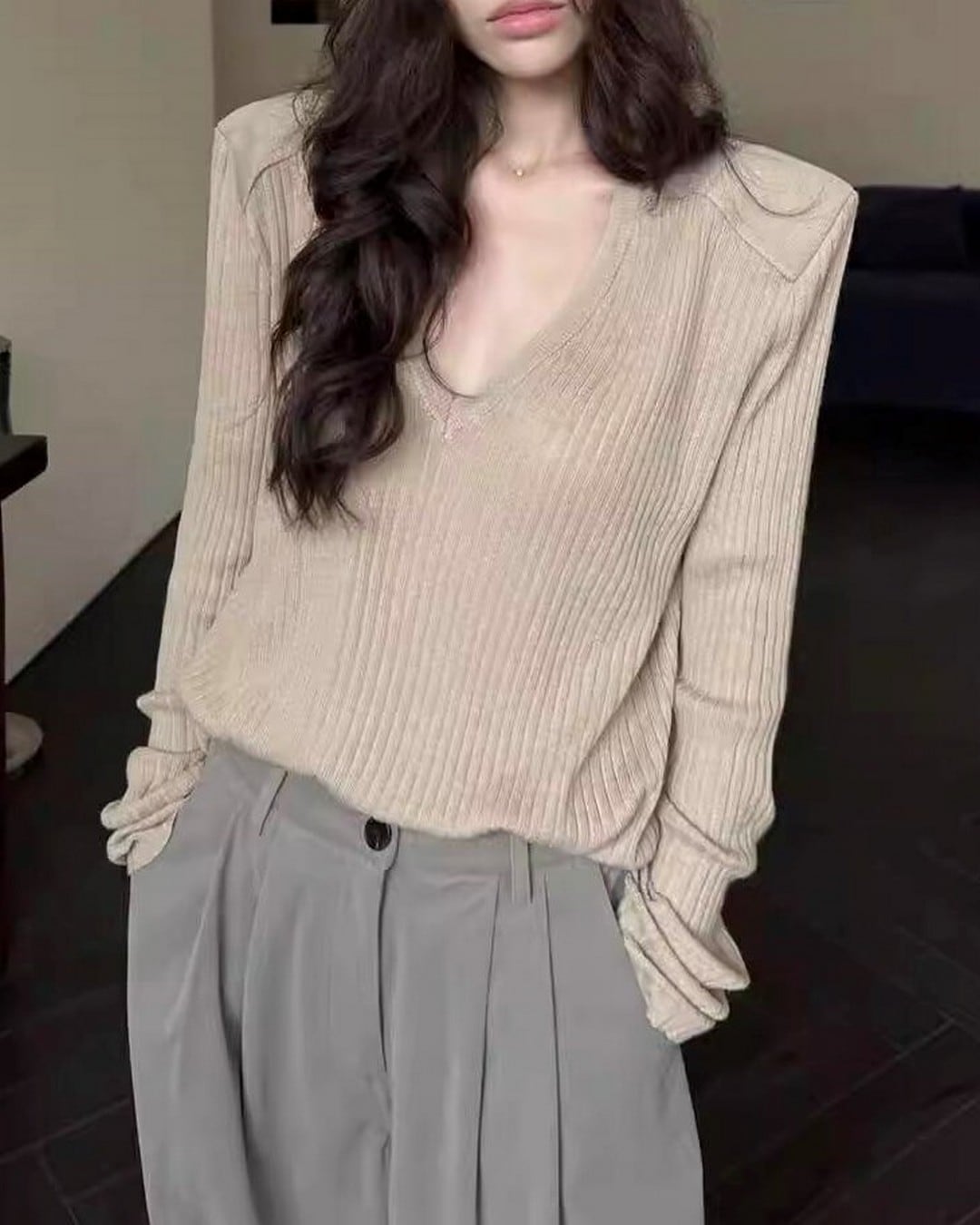 このニットはさりげなく肩を露出させることで、肌の露出を程よく取り入れ、洗練されたスタイリングを演出します。Vネックとショルダーデザインが組み合わさることで、モダンでスタイリッシュな印象を与えるアイテムです。