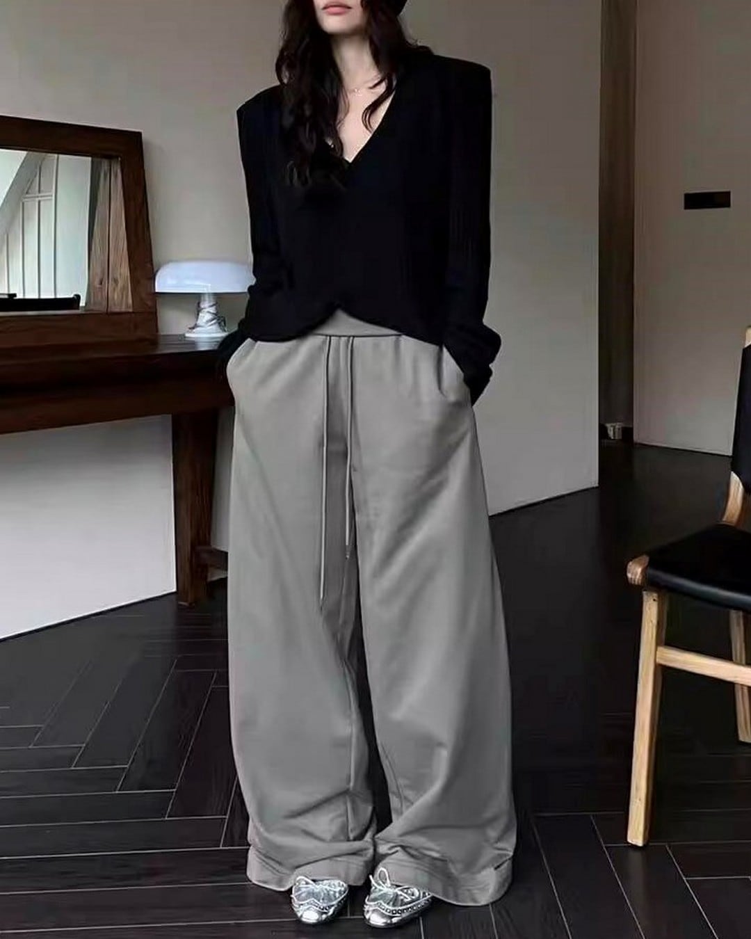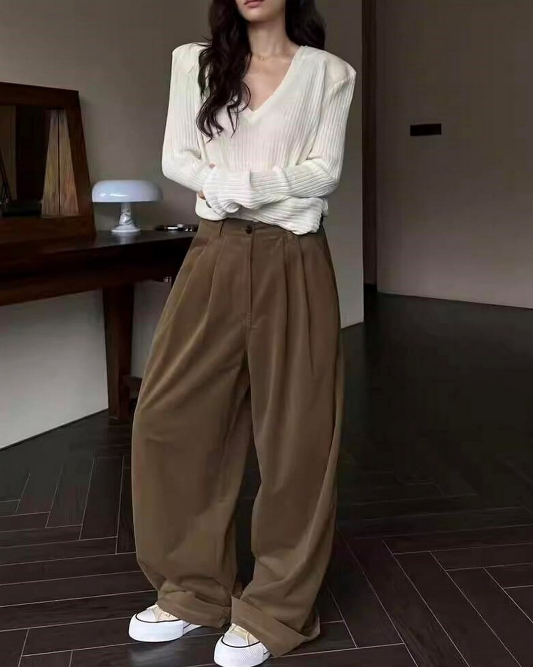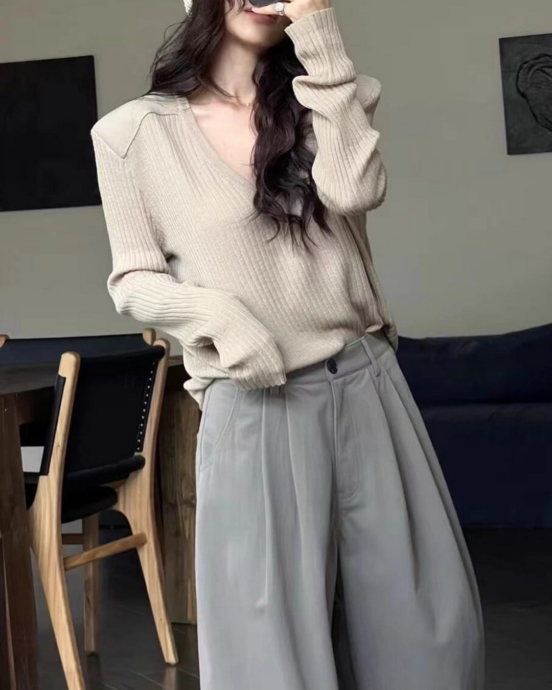 このニットはさりげなく肩を露出させることで、肌の露出を程よく取り入れ、洗練されたスタイリングを演出します。Vネックとショルダーデザインが組み合わさることで、モダンでスタイリッシュな印象を与えるアイテムです。