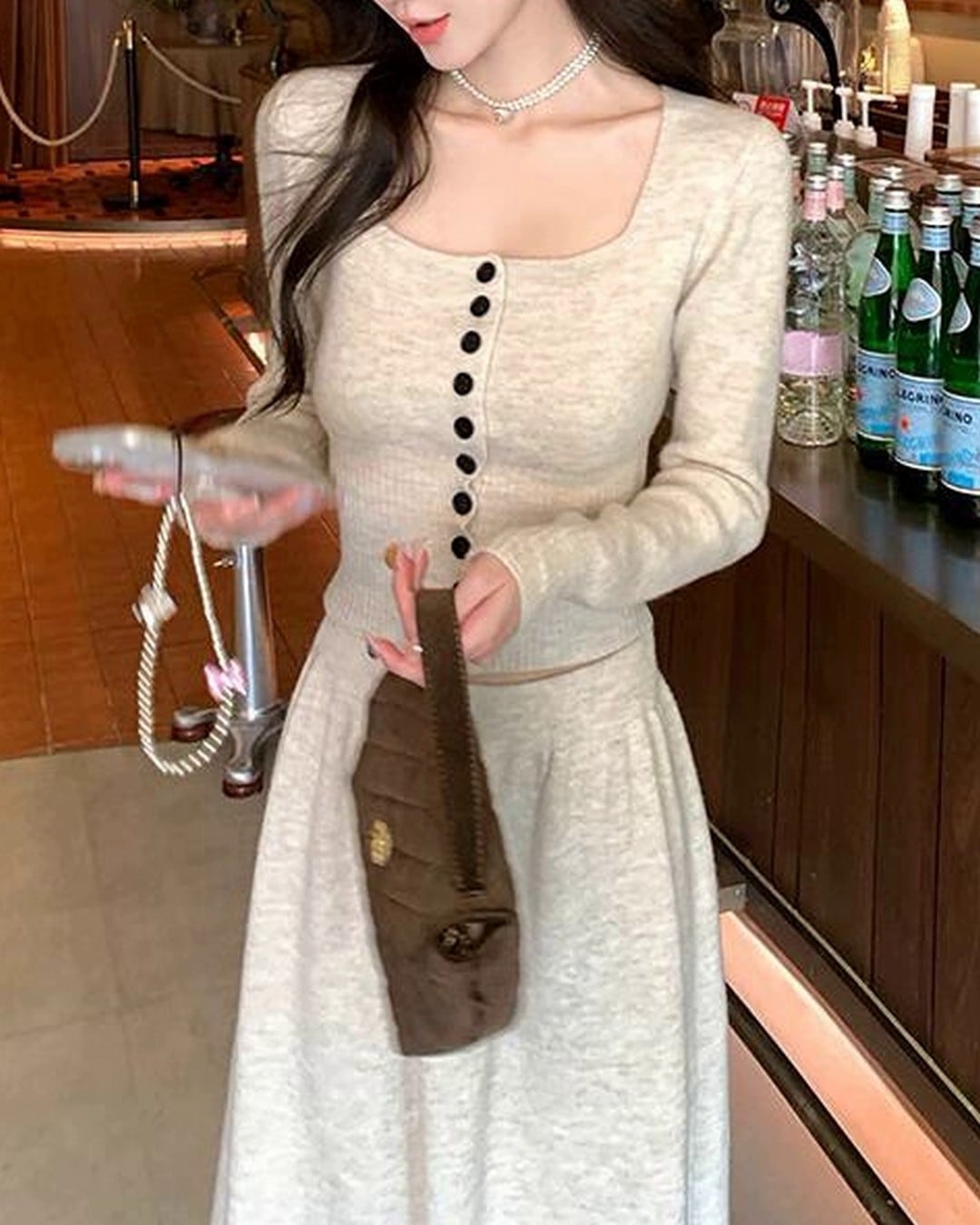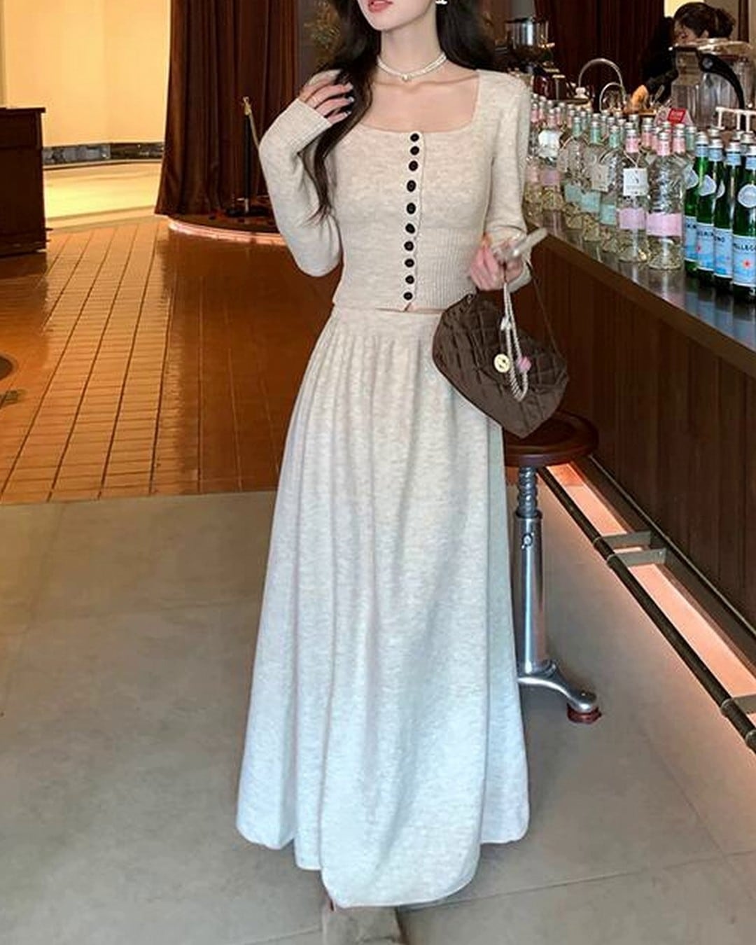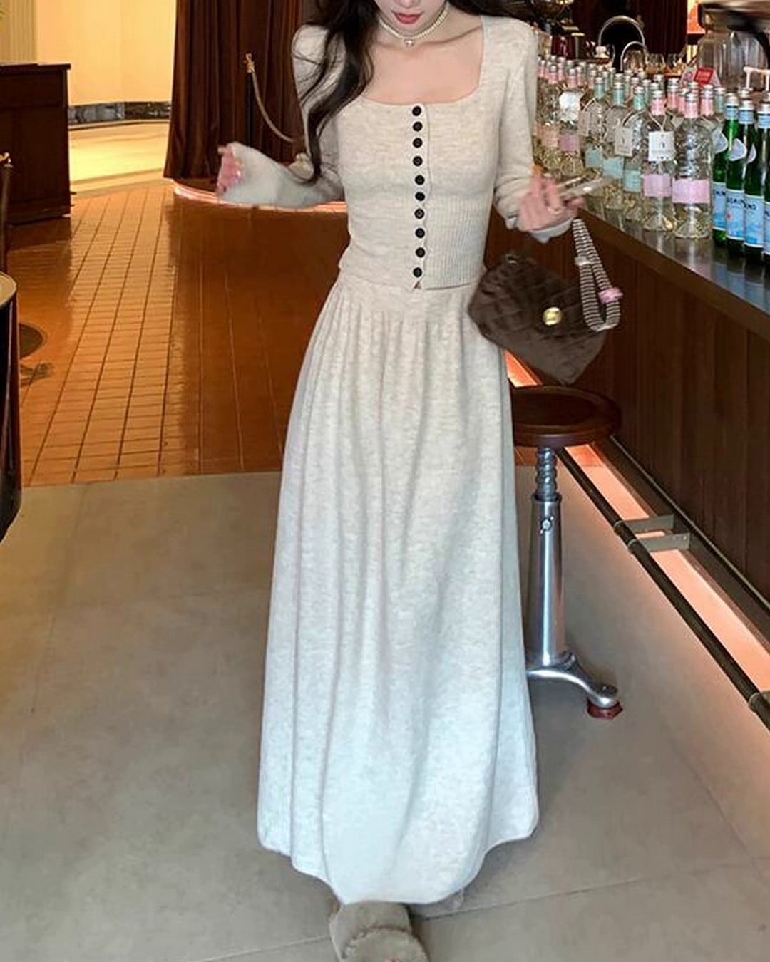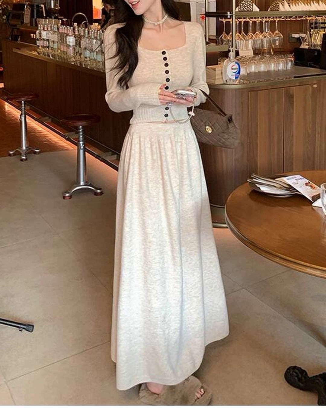デコルテが美しく見えるスクエアネックデザインで、カジュアルにもエレガントにも合わせることができます。ロングスカートは柔らかい素材感で、ふんわりとしたシルエットが魅力的です。日常のコーディネートはもちろん、特別な日のお出かけにもぴったりです。