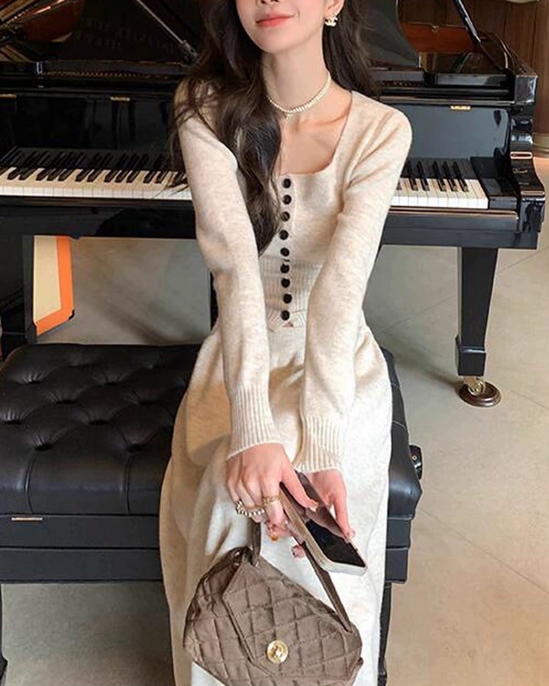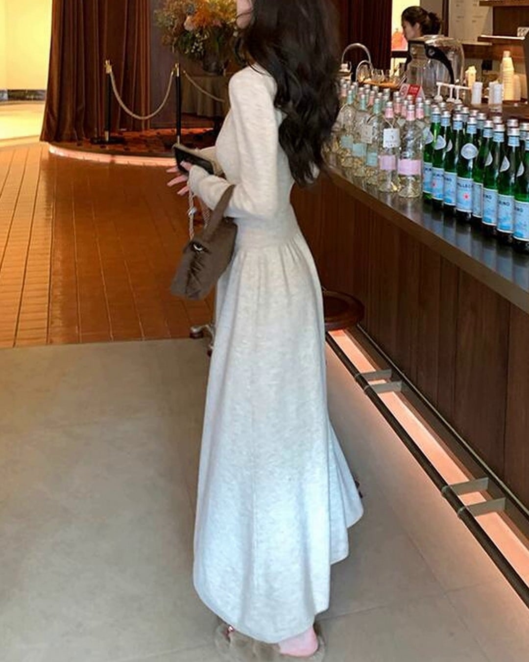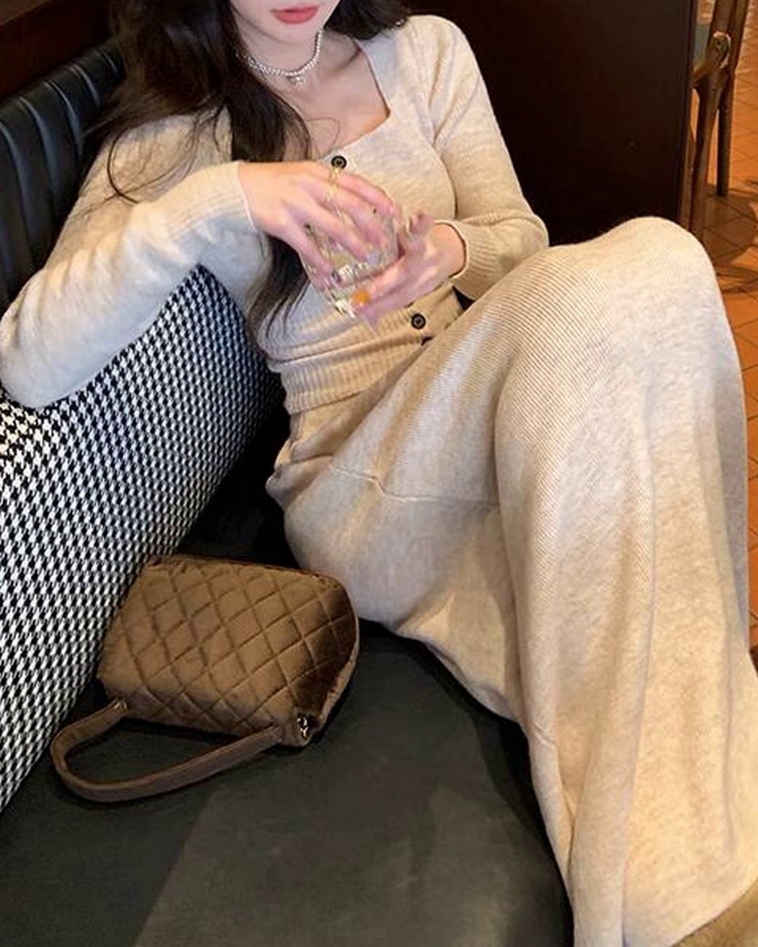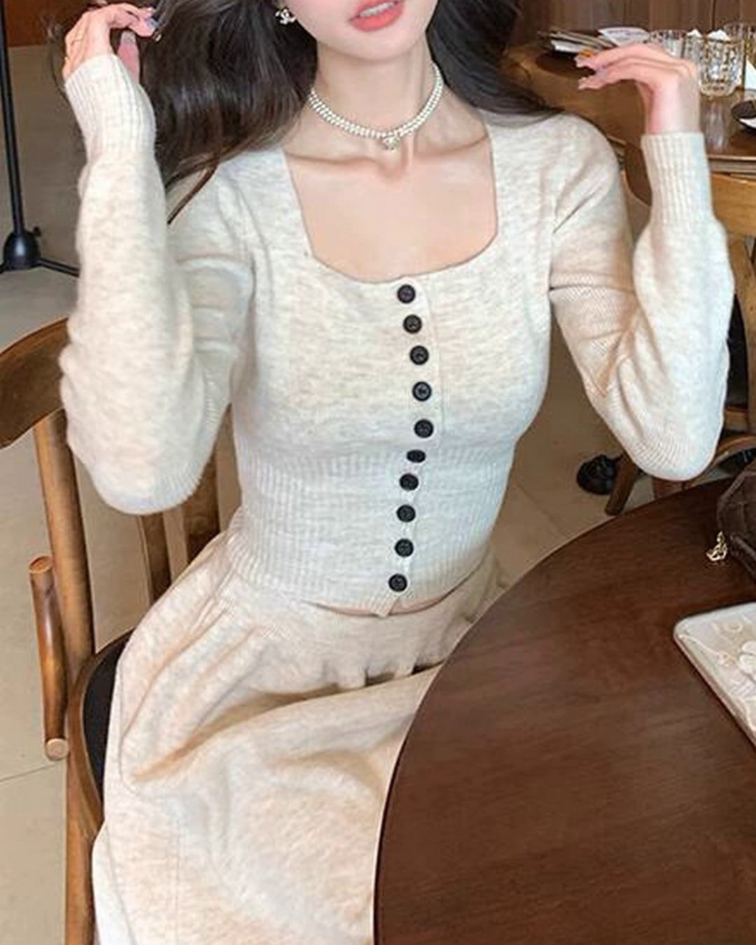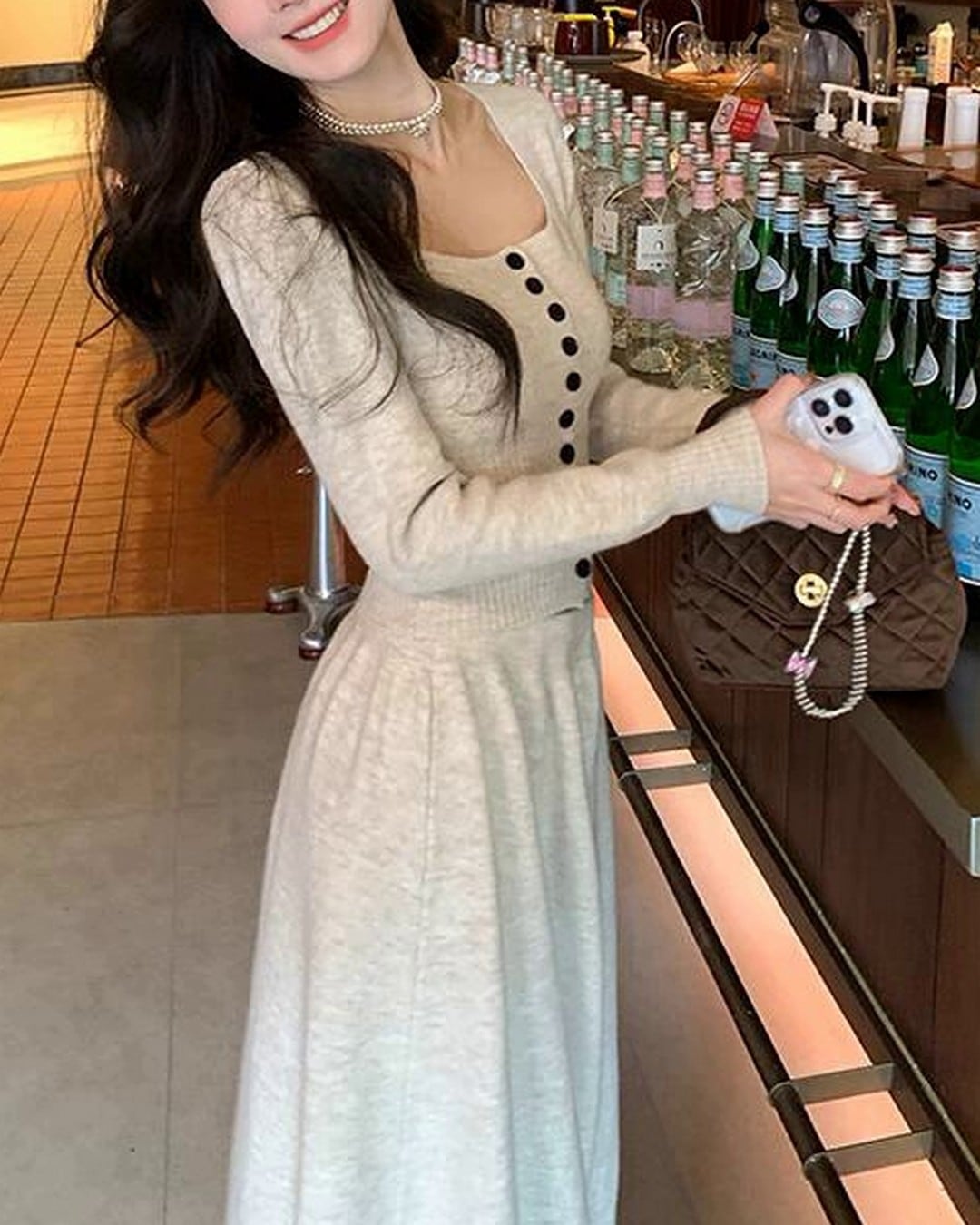 デコルテが美しく見えるスクエアネックデザインで、カジュアルにもエレガントにも合わせることができます。ロングスカートは柔らかい素材感で、ふんわりとしたシルエットが魅力的です。日常のコーディネートはもちろん、特別な日のお出かけにもぴったりです。