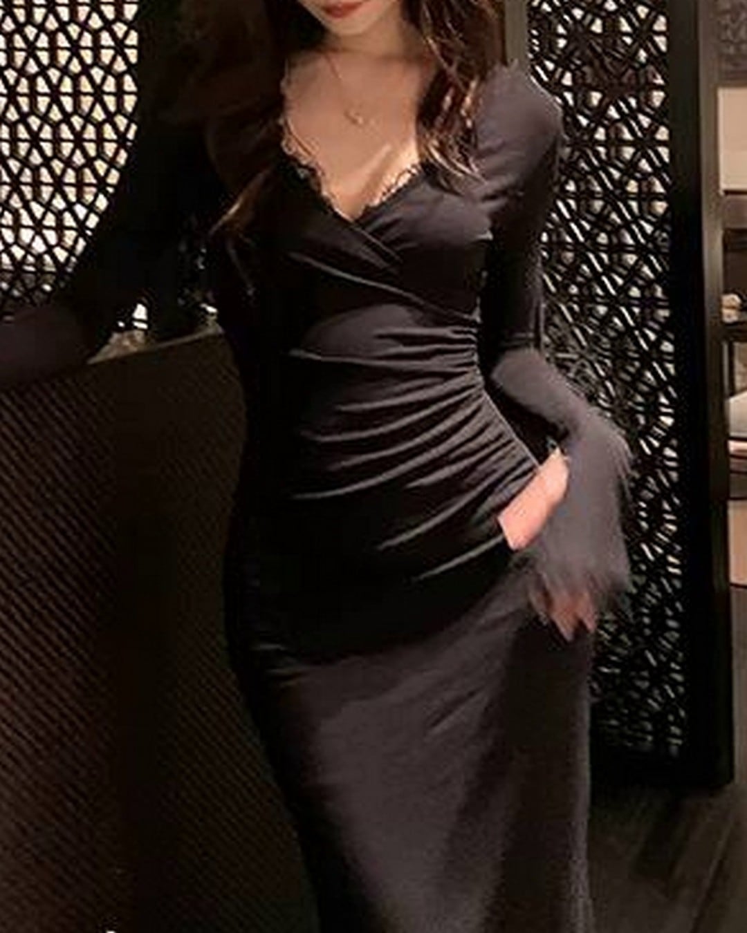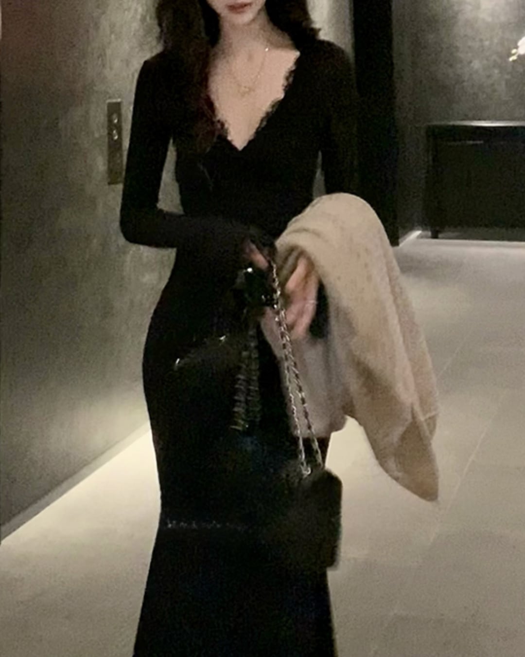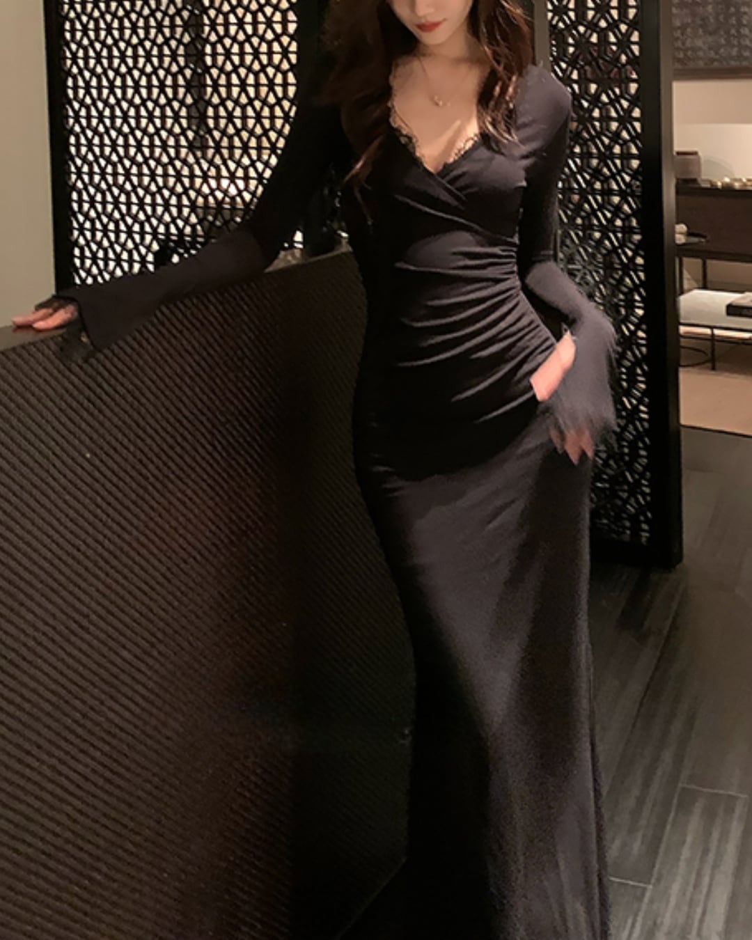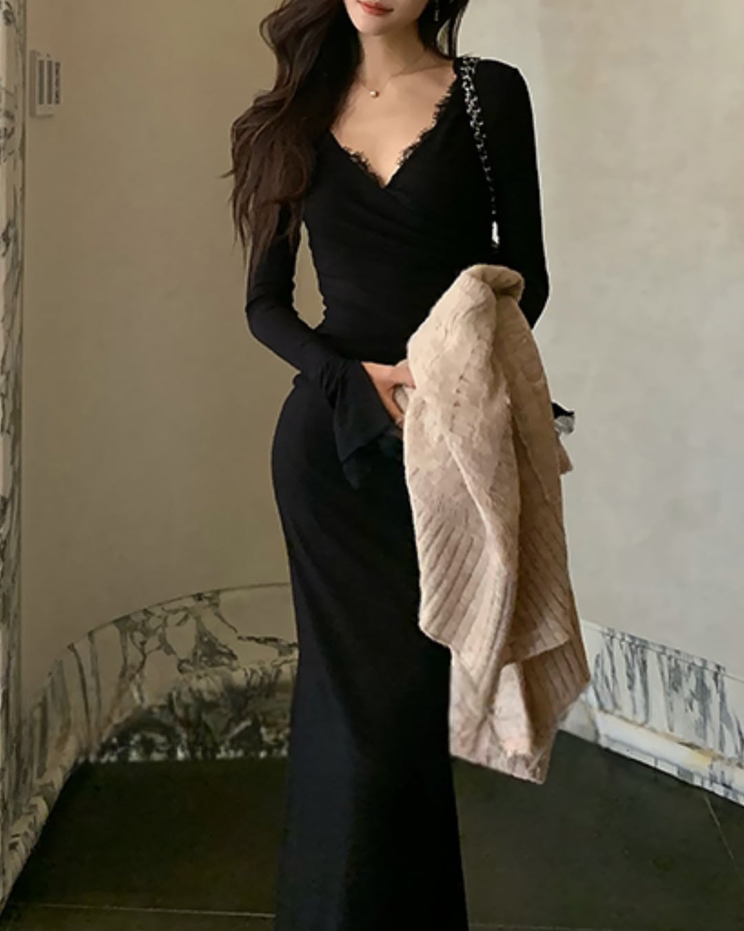 エレガントな印象を与えるVネックデザインのレースドレス。華やかなレースのディテールが、特別な日やパーティーシーンにぴったり。スリーブが広がったデザインも魅力でフィットしたウエストが女性らしいラインを演出します。