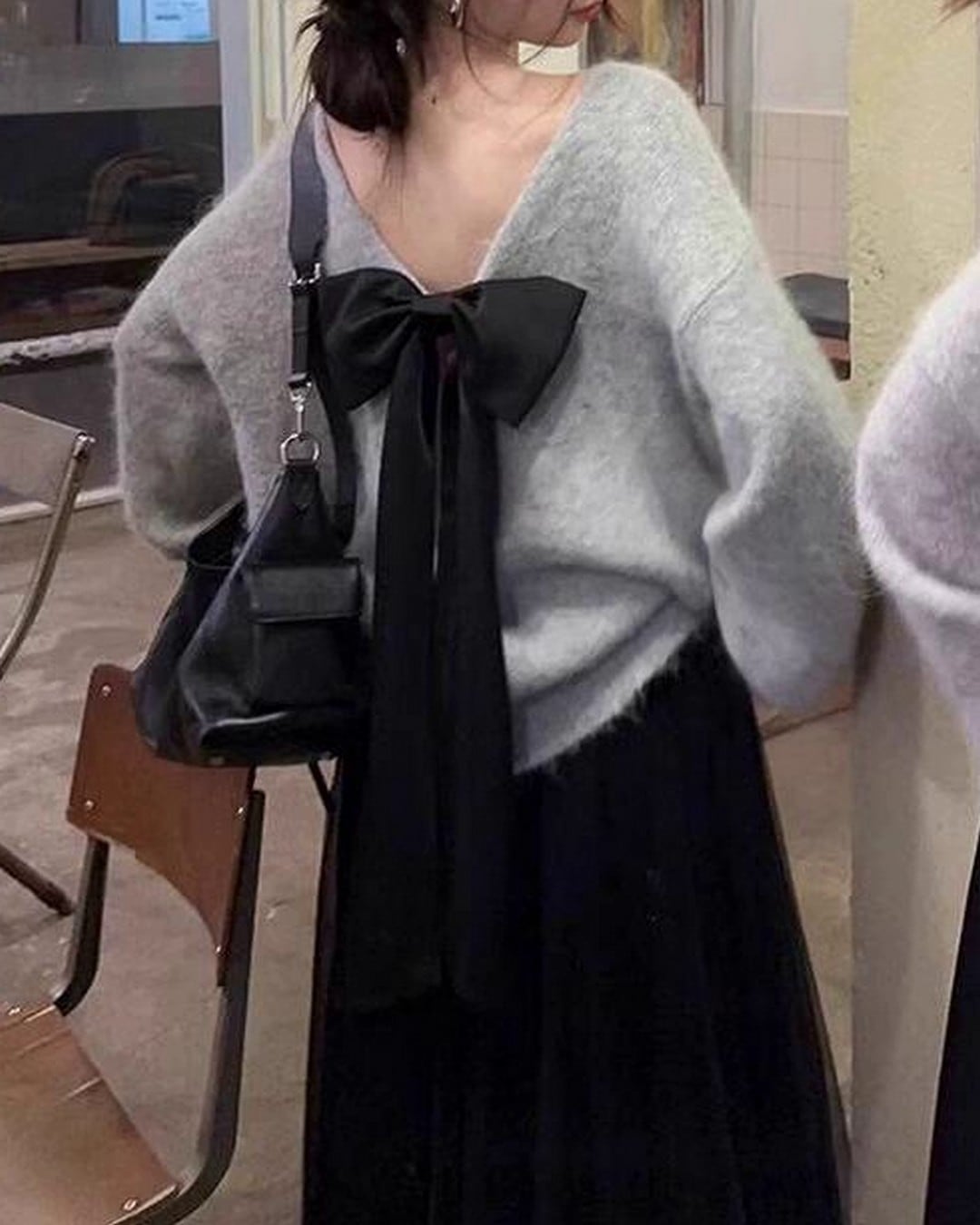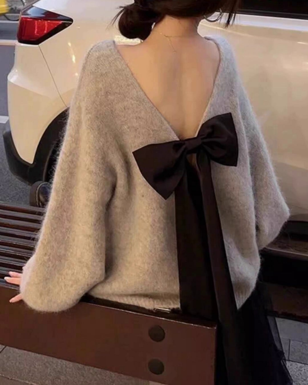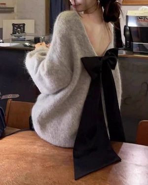 バックスタイルにかわいいリボンデザインがポイント。シックな印象を与えるバックオープンリボンニットは、日常のコーディネートを華やかに彩ります。肌触りの良い素材感と優れたフィット感が特徴で、着心地も抜群です。