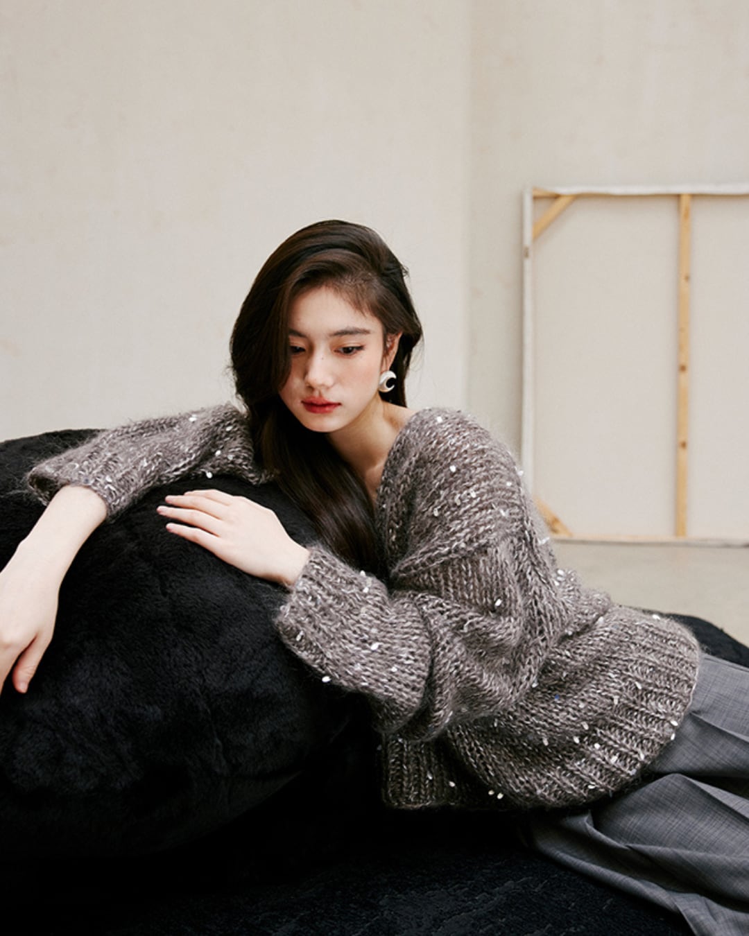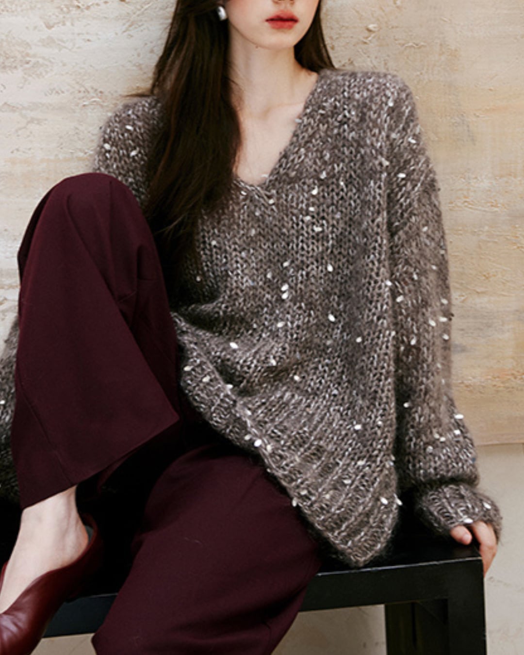 華やかなスパンコールが施されたワイドニットは、シンプルなコーディネートに輝きをプラスします。柔らかな質感とゆったりとしたシルエットが特徴で、カジュアルな日常使いからちょっとしたお出かけまで幅広く活躍できるアイテムです。