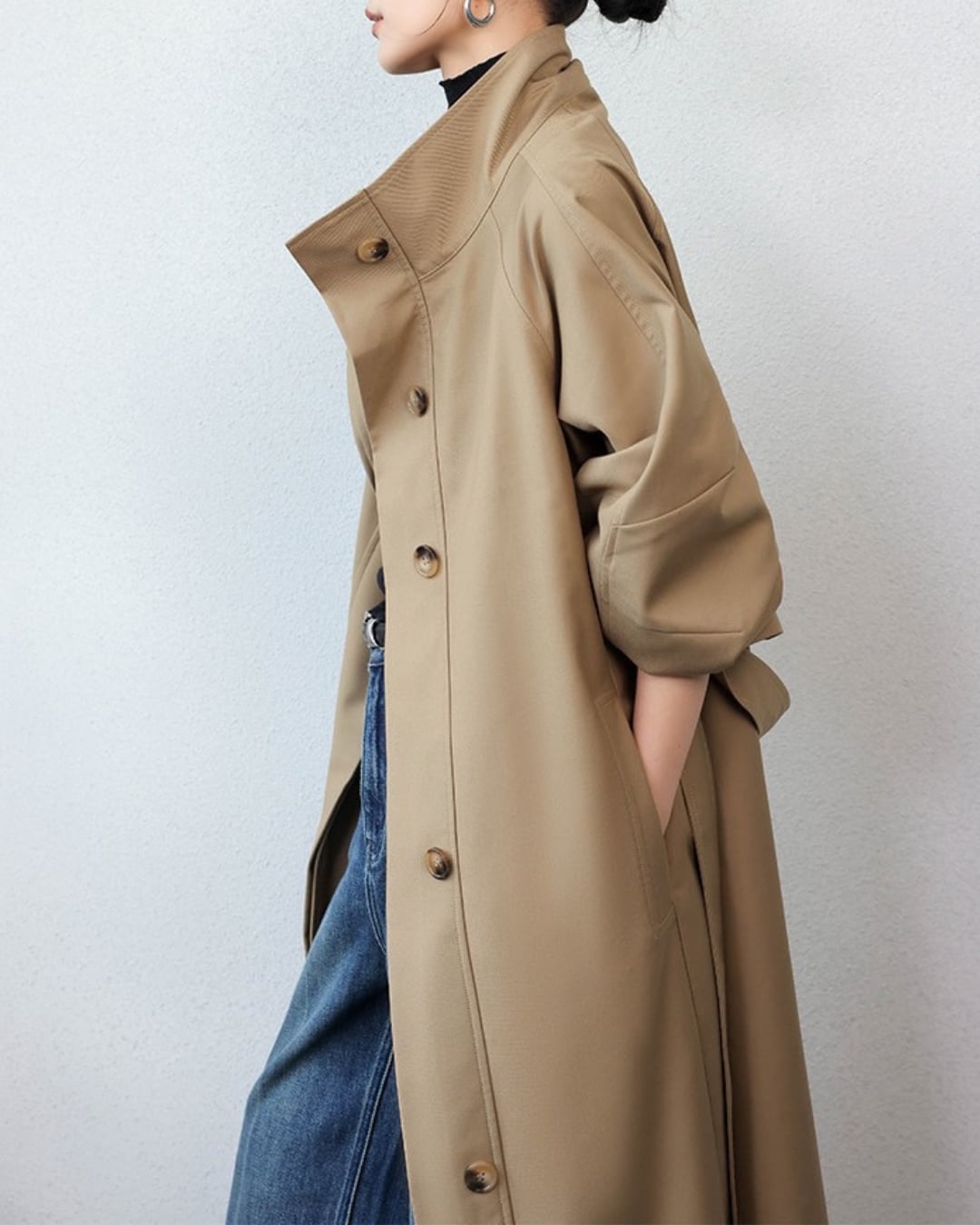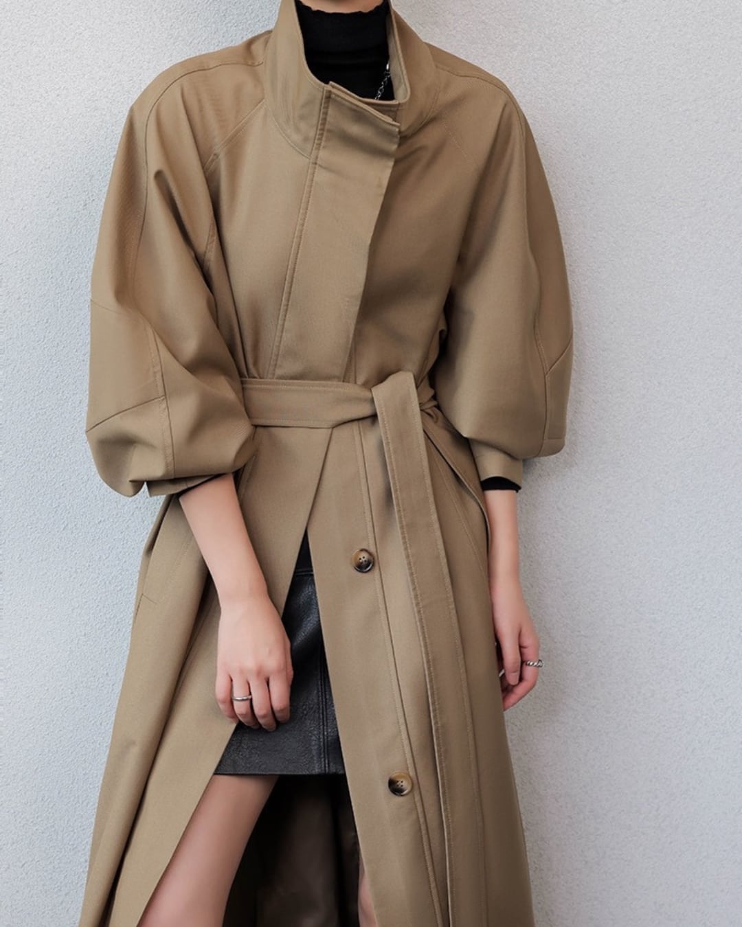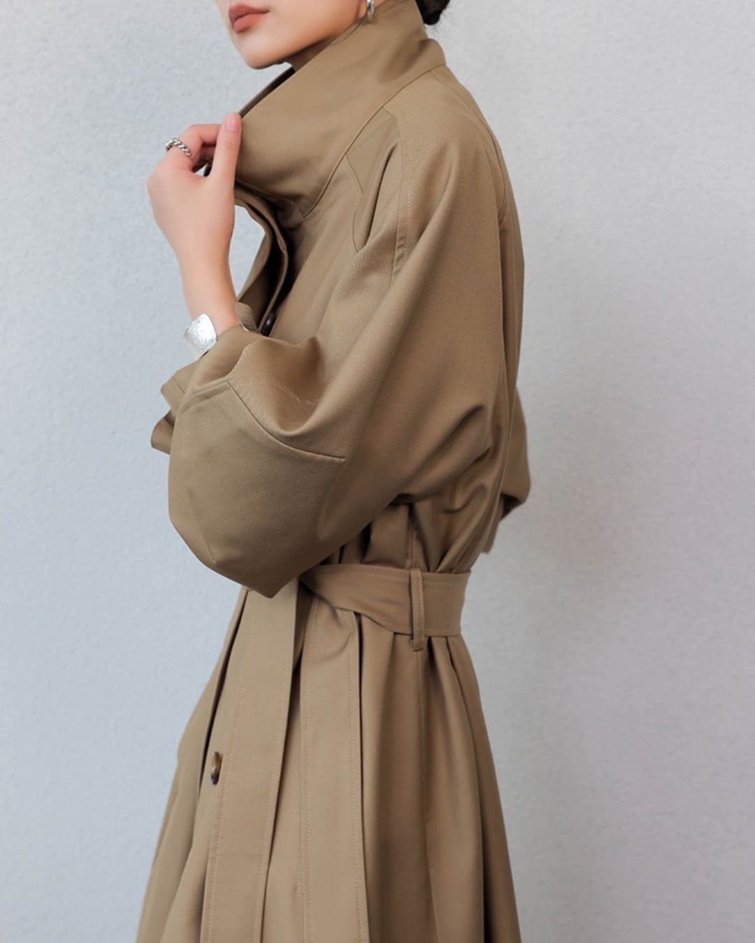 上品なハイネックデザインが洗練された印象を与え、スタイリッシュに見せるハイネックトレンチコート。しっかりとした素材感は、普段使いから特別なシーンまで多彩に活用できることが期待できるアイテムです。トレンチのクラシックなシルエットが、着る人の魅力を一層引き立てること間違いなしです。