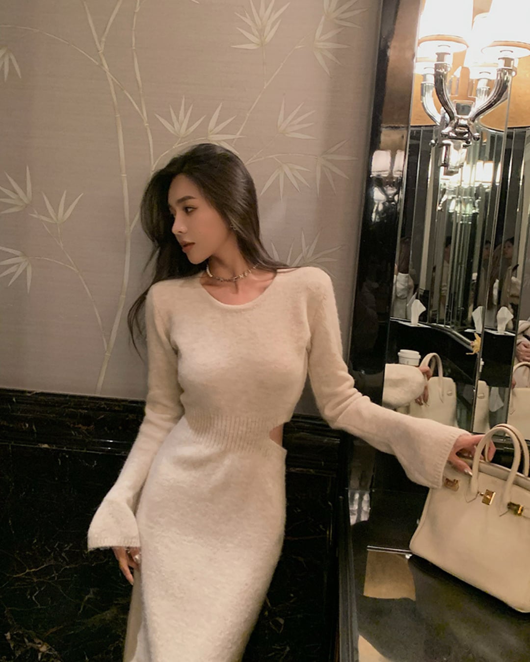 ウエストカットのデザインが魅力的なニットワンピース。カジュアルなお出かけからデートシーンまで、様々なシーンで活躍する一着。ウエストカットのスタイルが、女性らしいシルエットを引き立て、着るだけで洗練された印象を与えます。