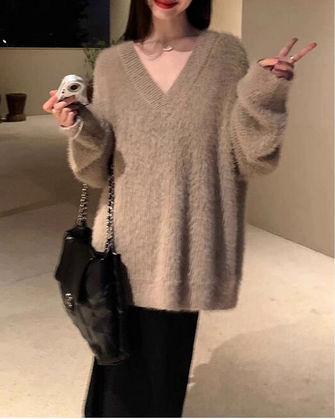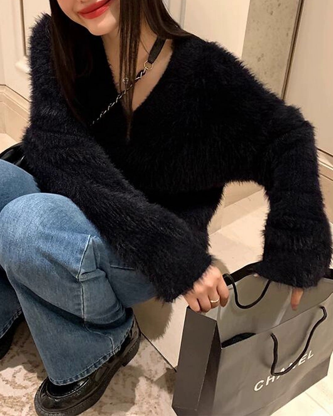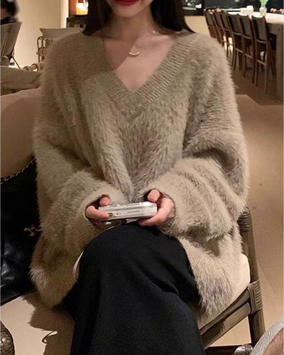 温かみのある素材感とスタイリッシュなデザインが魅力です。深めのVネックは、顔周りをすっきりと見せ、重ね着もしやすく、様々なスタイルに合わせてお楽しみいただけます。柔らかなファー調のニット素材が、優しい印象を与えてくれるので、カジュアルなシーンからちょっとしたお出かけまで幅広く活躍します。
