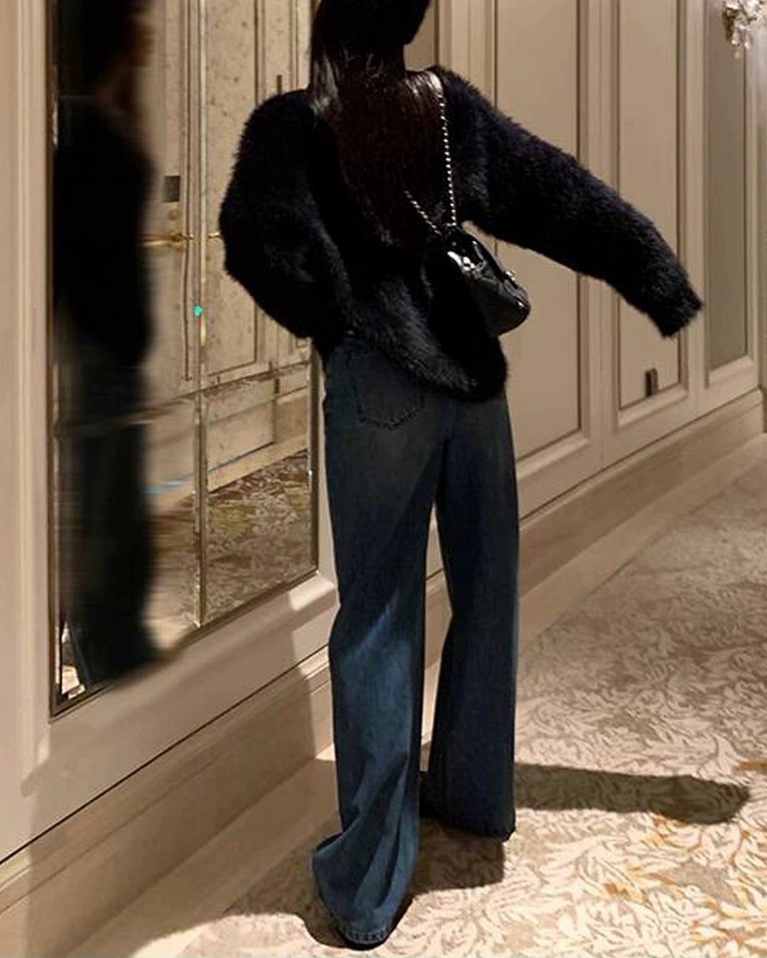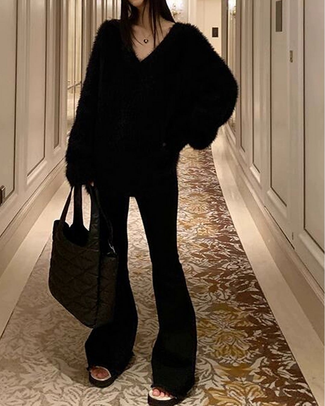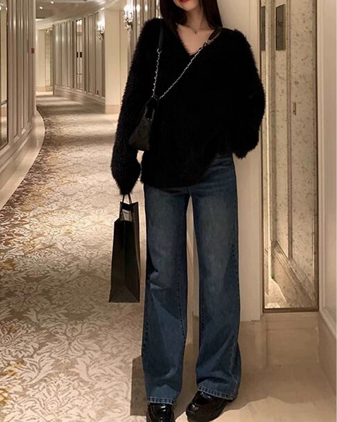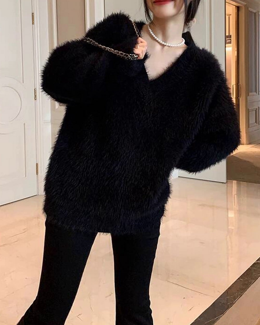 温かみのある素材感とスタイリッシュなデザインが魅力です。深めのVネックは、顔周りをすっきりと見せ、重ね着もしやすく、様々なスタイルに合わせてお楽しみいただけます。柔らかなファー調のニット素材が、優しい印象を与えてくれるので、カジュアルなシーンからちょっとしたお出かけまで幅広く活躍します。