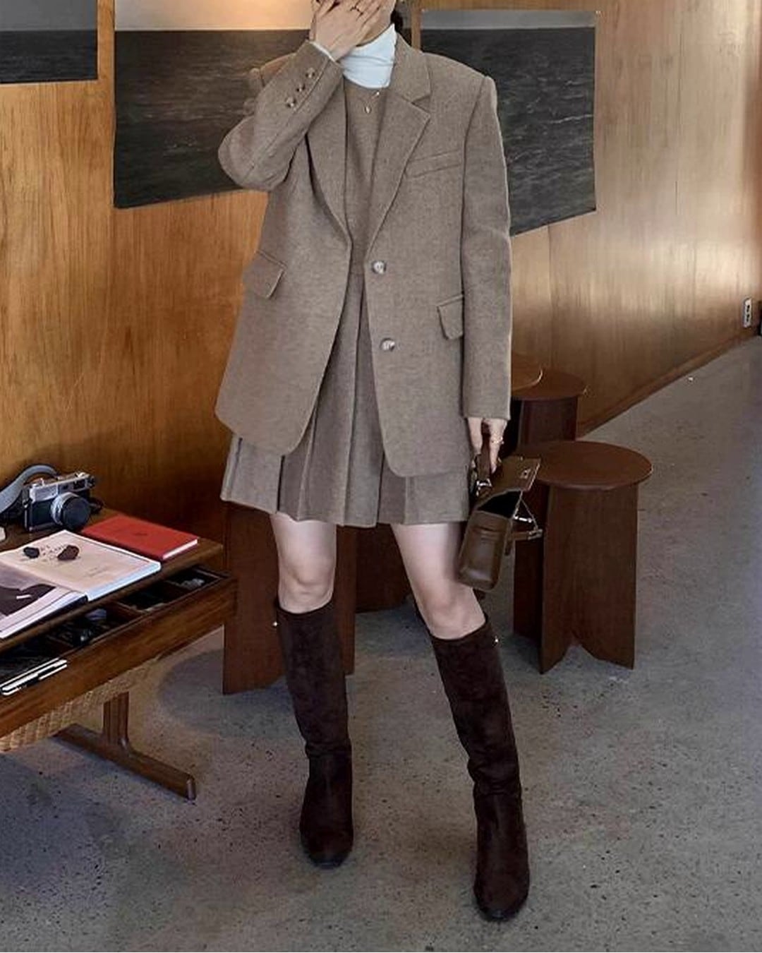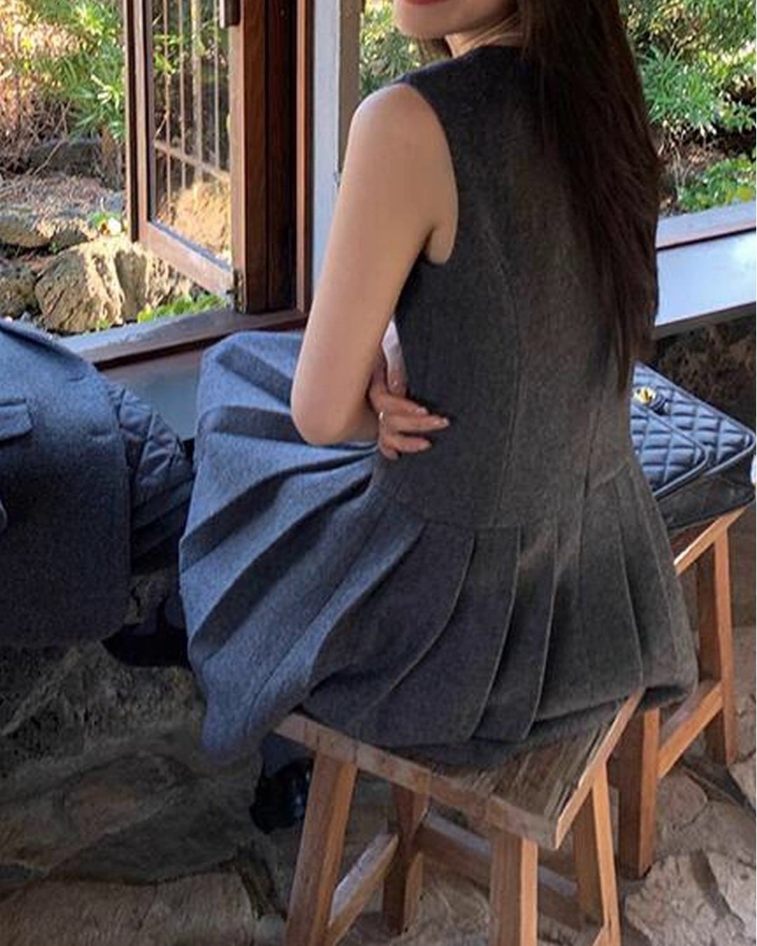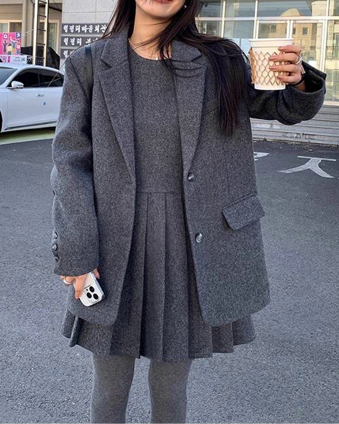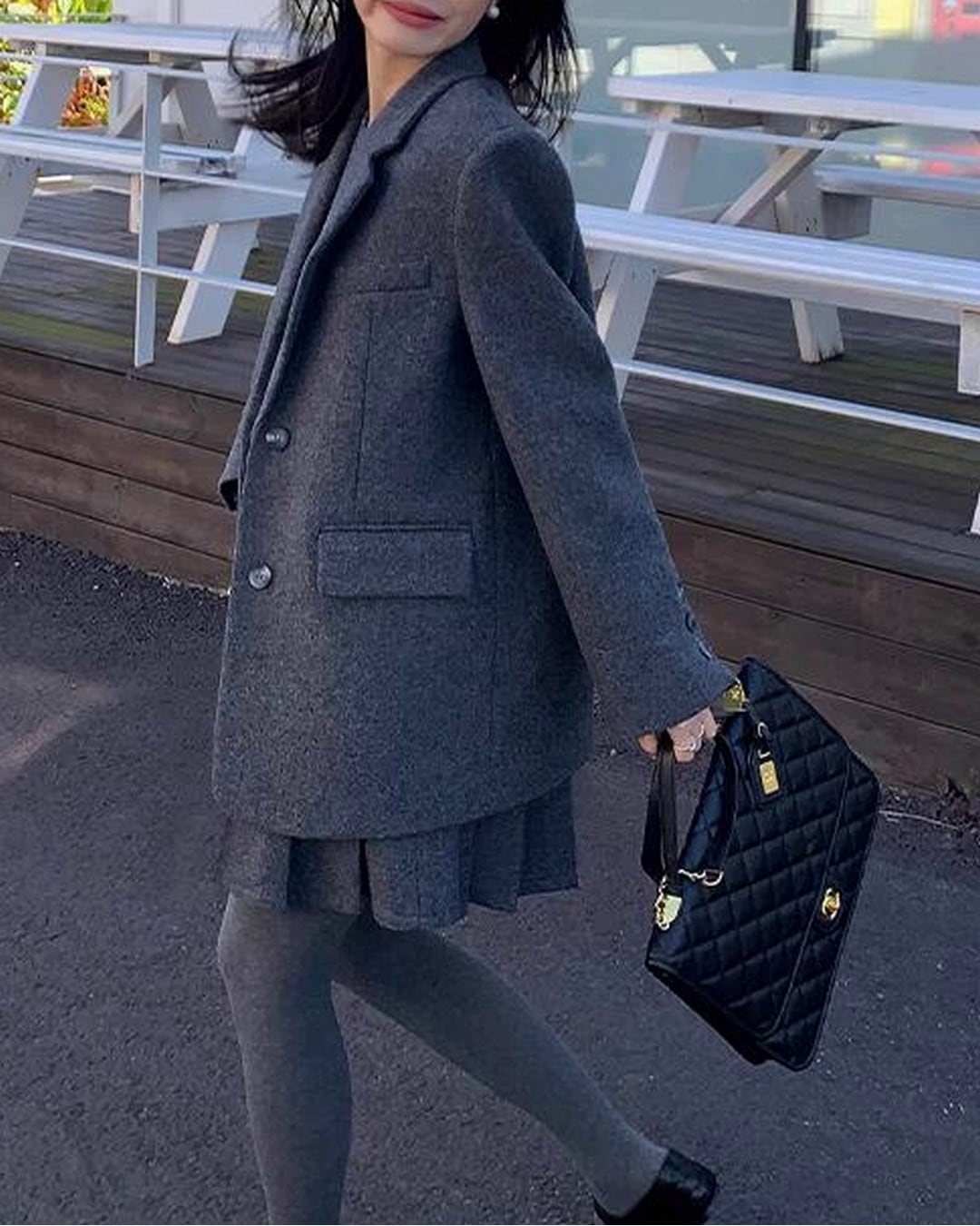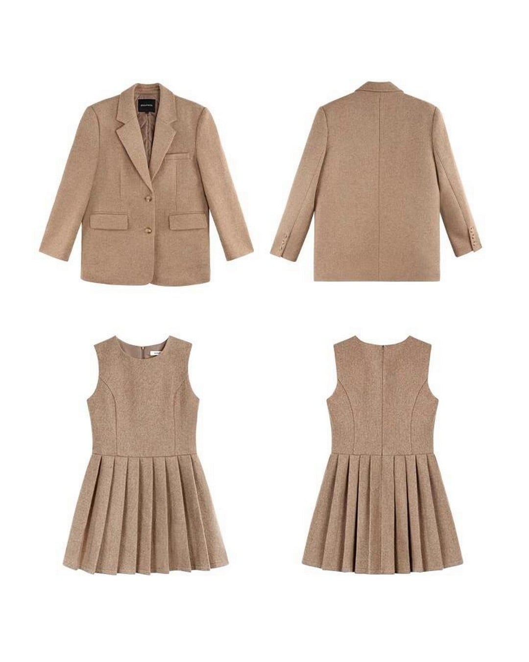 シンプルでありながら上品さを兼ね備えたスタイルを実現します。ジャケットとプリーツワンピースのセットで、場面を選ばず着用できるアイテムです。ワンピースの流れるようなプリーツデザインが女性らしさを引き立てます。