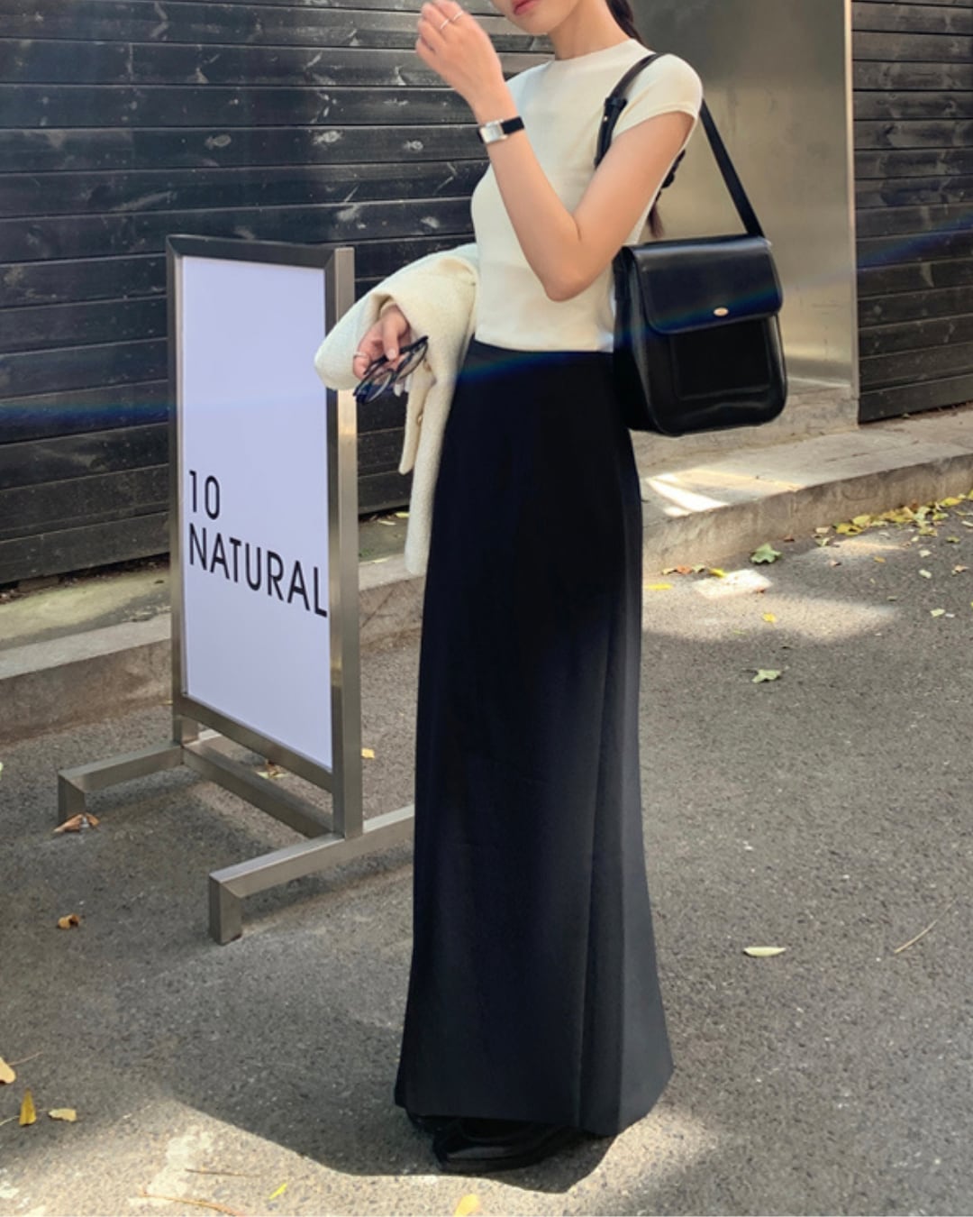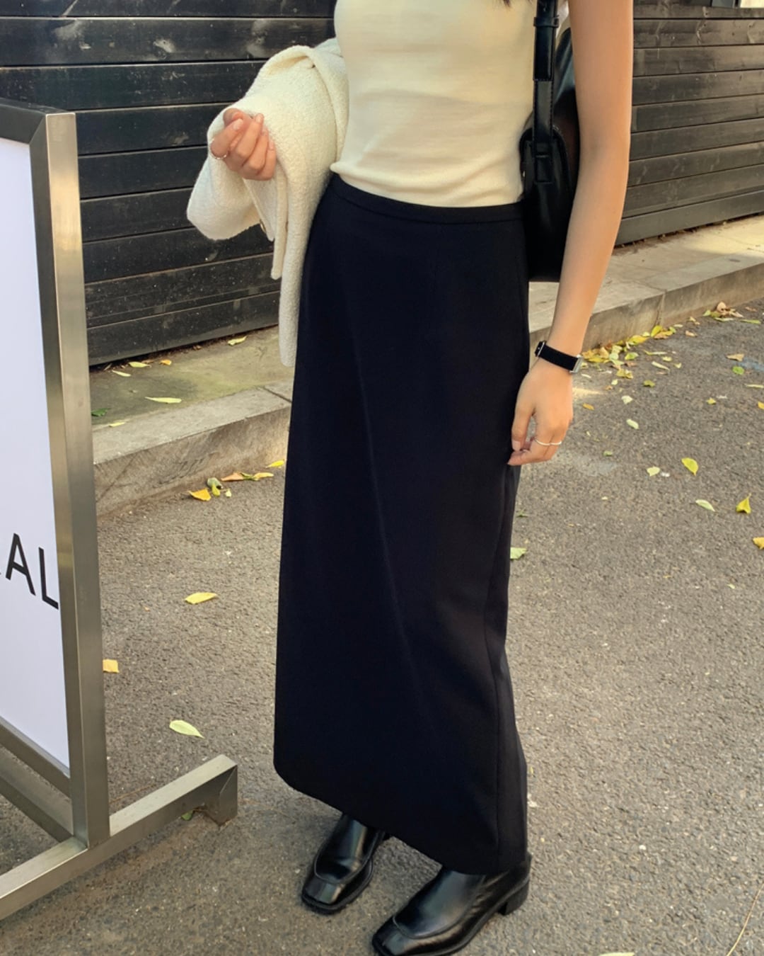 ハイウエストデザインが美しいシルエットを実現するスリムロングスカート。どんなトップスとも相性が良く、カジュアルにもフォーマルにもご使用いただけます。スタイルアップ効果も期待できる一着です。
