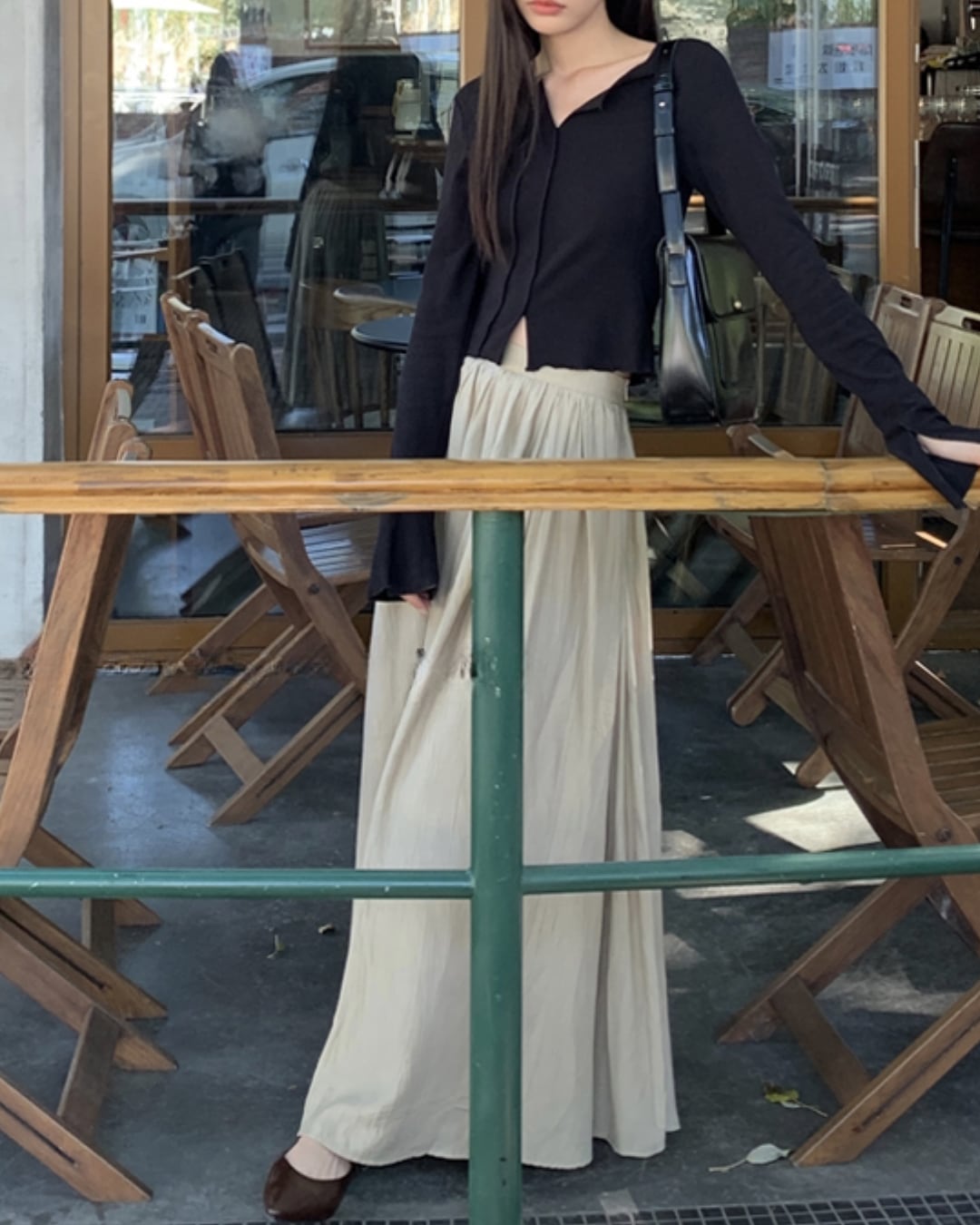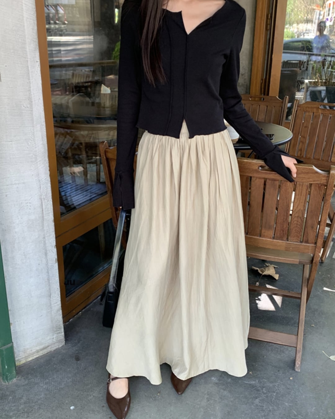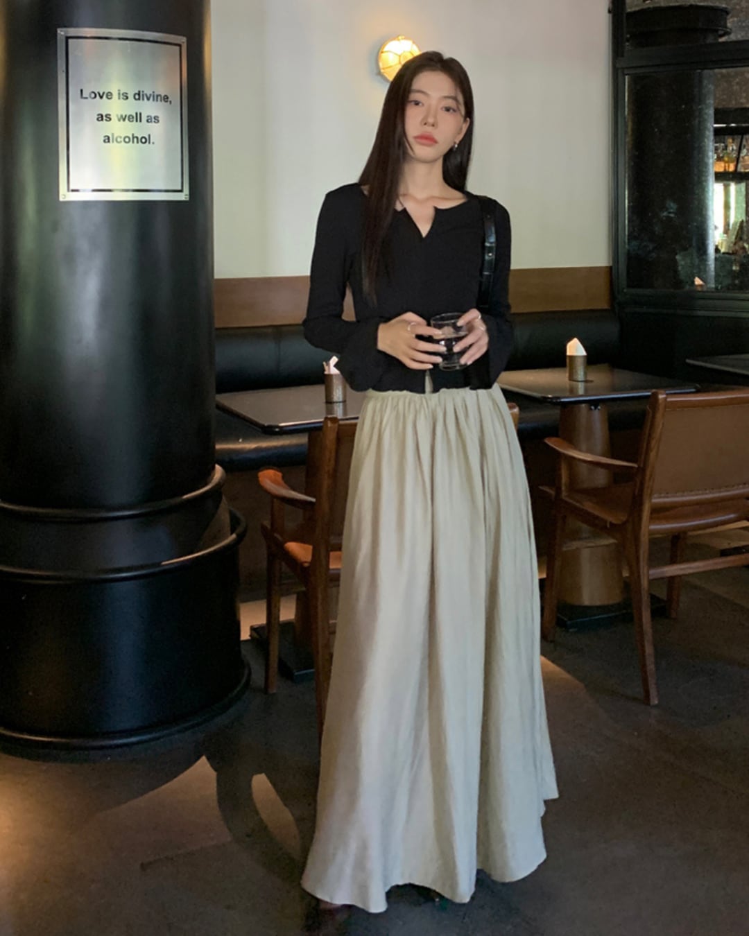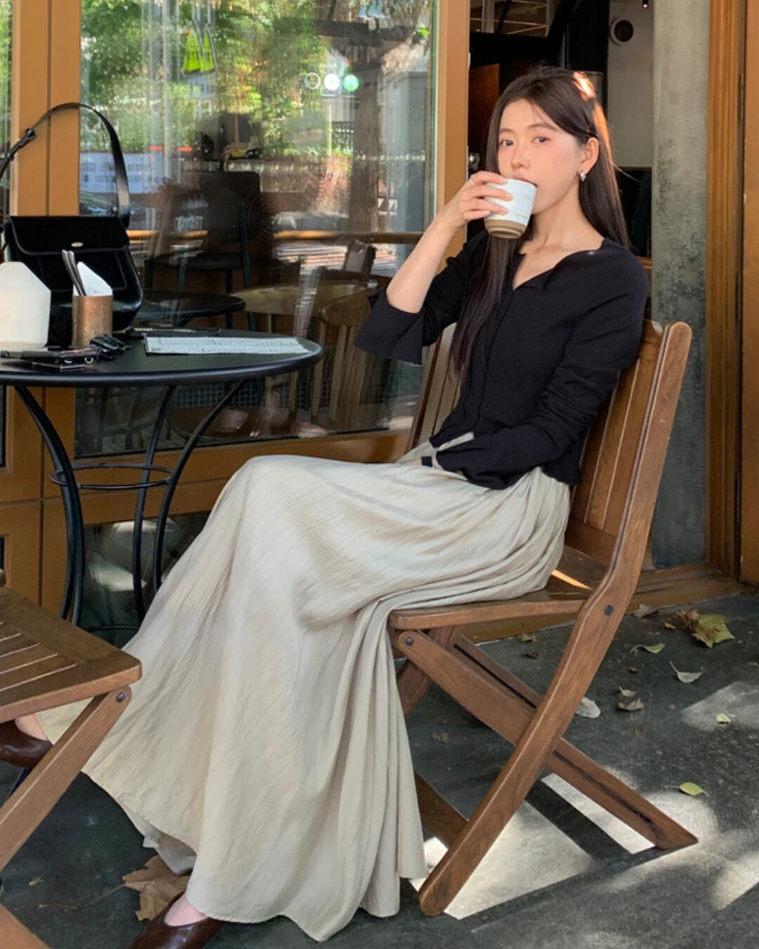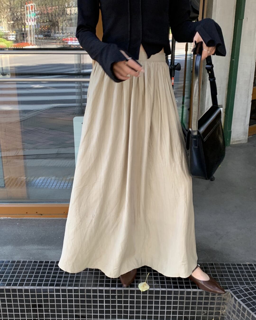 軽やかなドレープ感と柔らかなギャザーが特徴の一枚。デイリーユースから特別な日まで、幅広く活躍するアイテムで、さまざまなトップスともコーディネートしやすいデザインです。ウエスト部分はストレッチ性があり、快適な着心地を提供します。