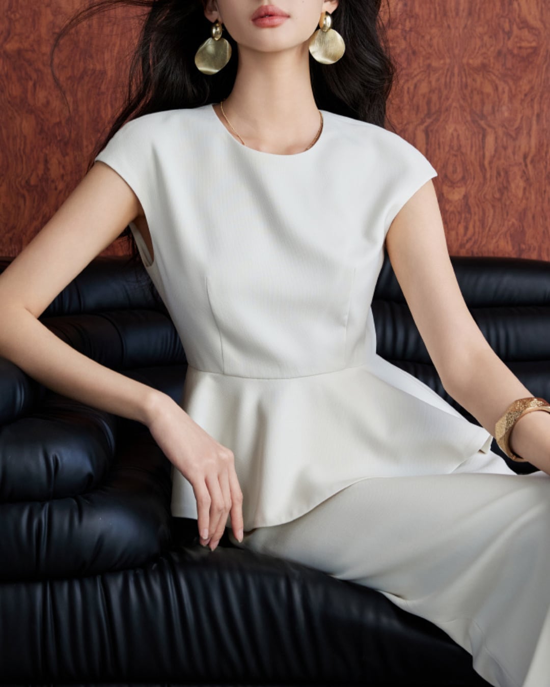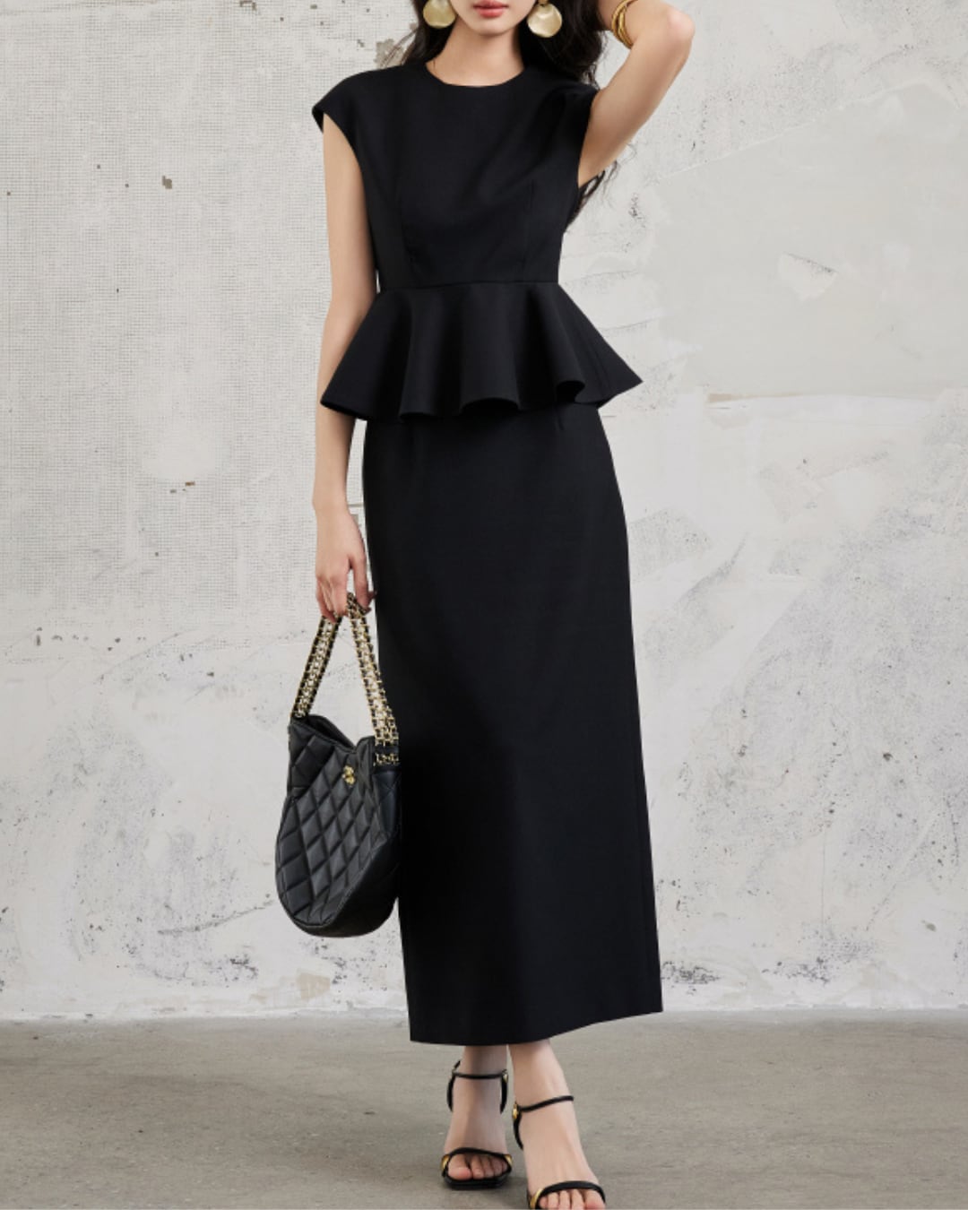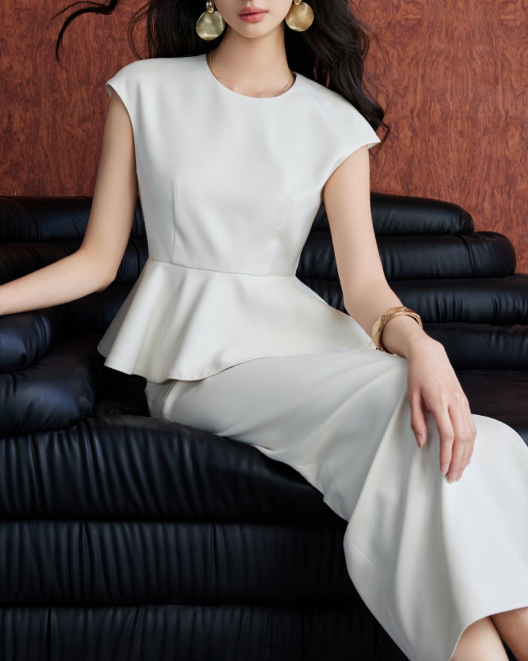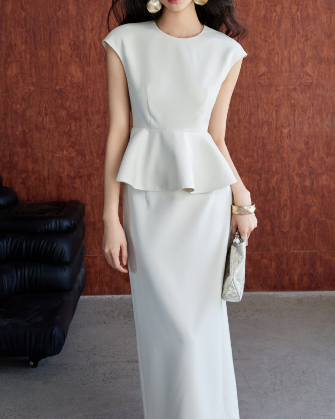 洗練されたシルエットが魅力のセット。ペプラムデザインがウエストをすっきりと引き立て、女性らしさを存分に引き出します。Iラインスカートは美しいラインを保ち、デイリーから特別なシーンまで、多様なスタイルに対応可能です。シンプルながらも上品な印象を与える一着です。